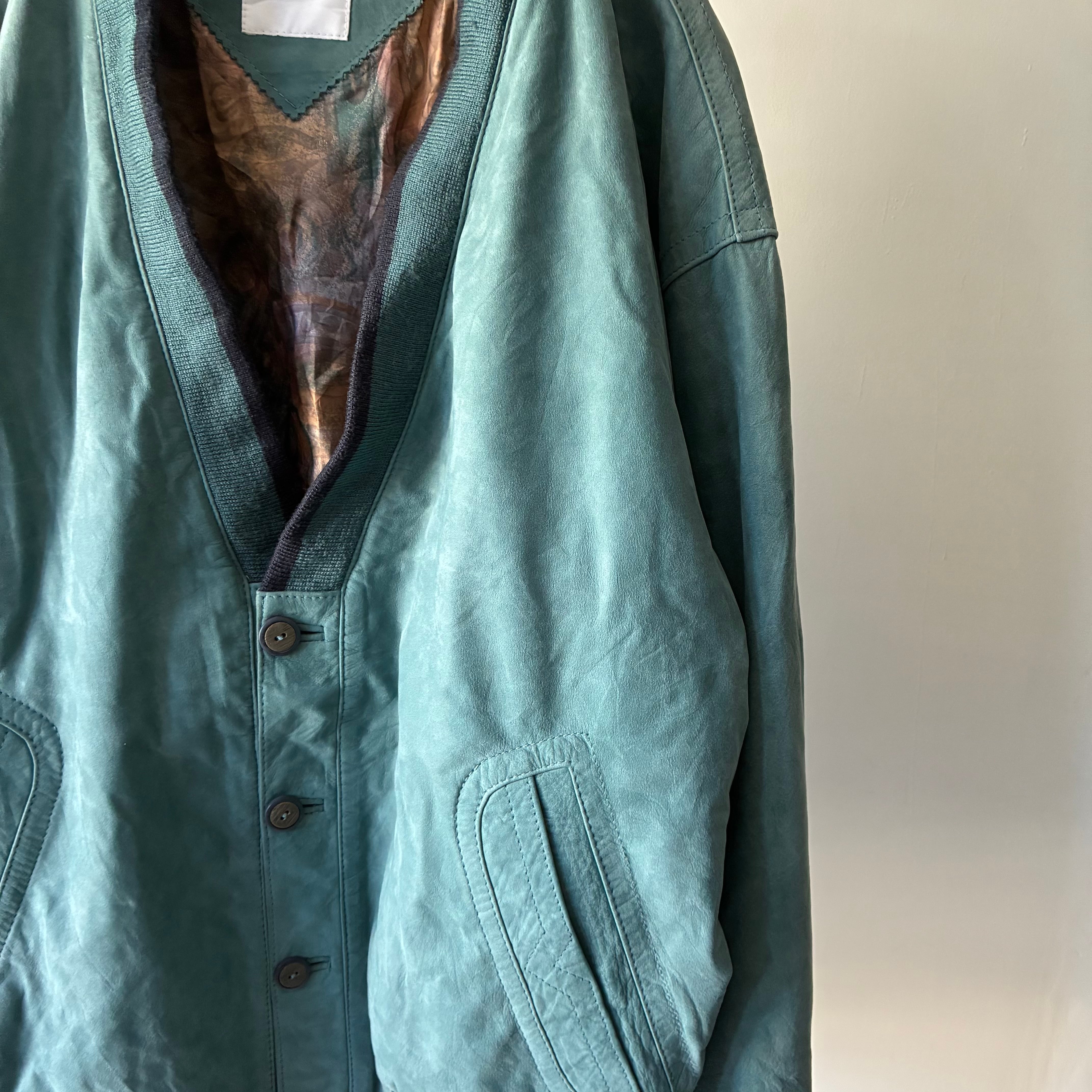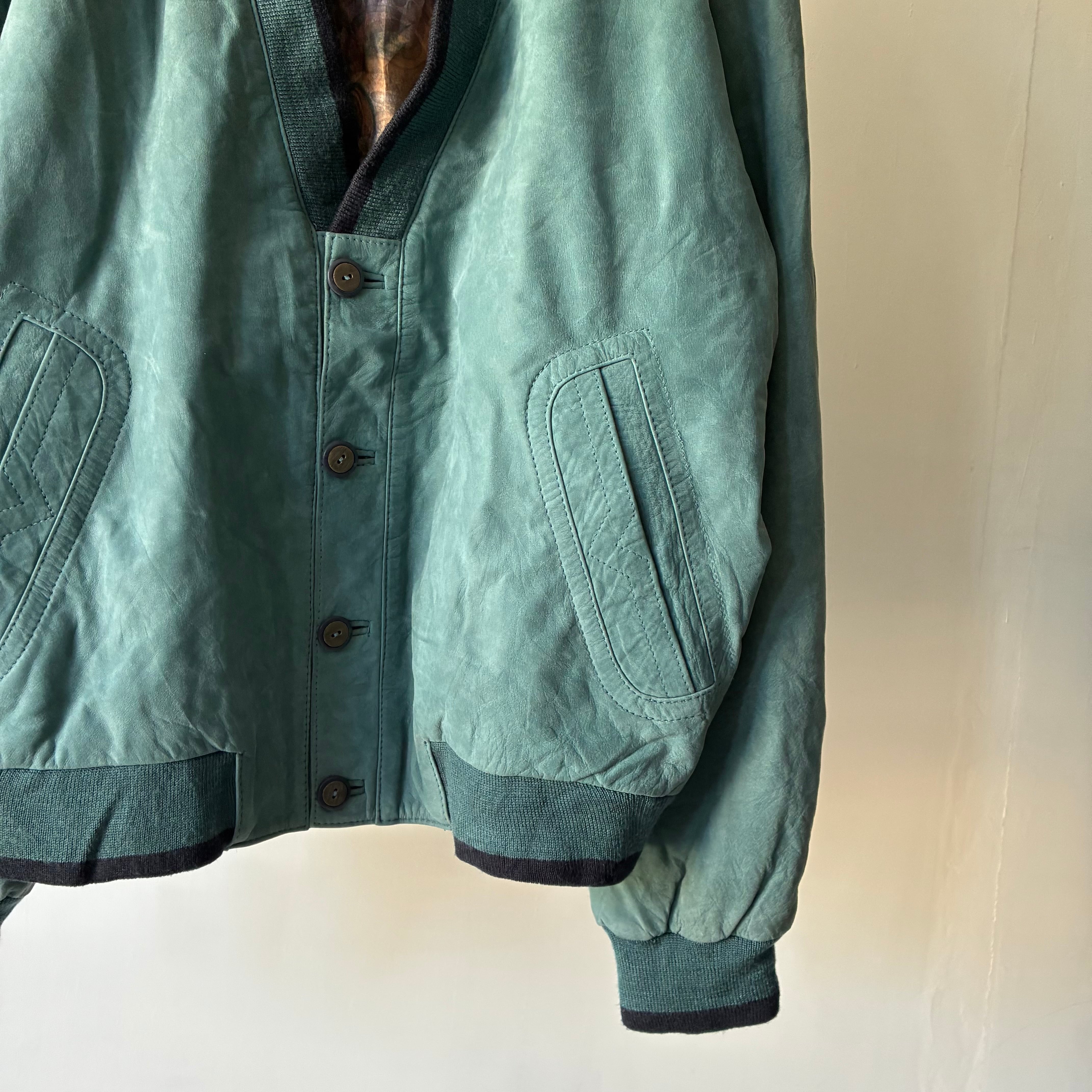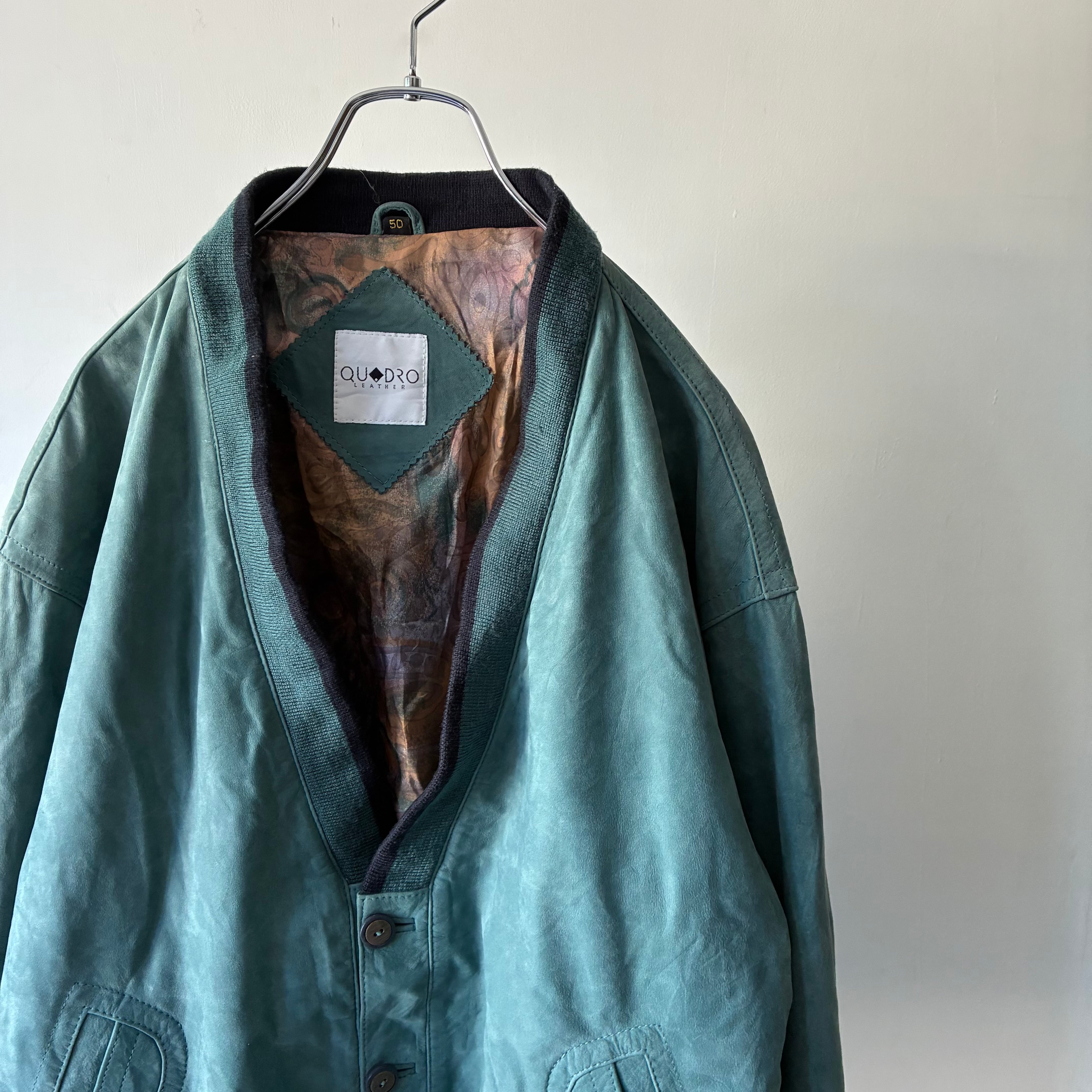 落ち着きのある淡いグリーンカラーのしなやかなスエードレザーが上品なユーロ製カーディガンブルゾン