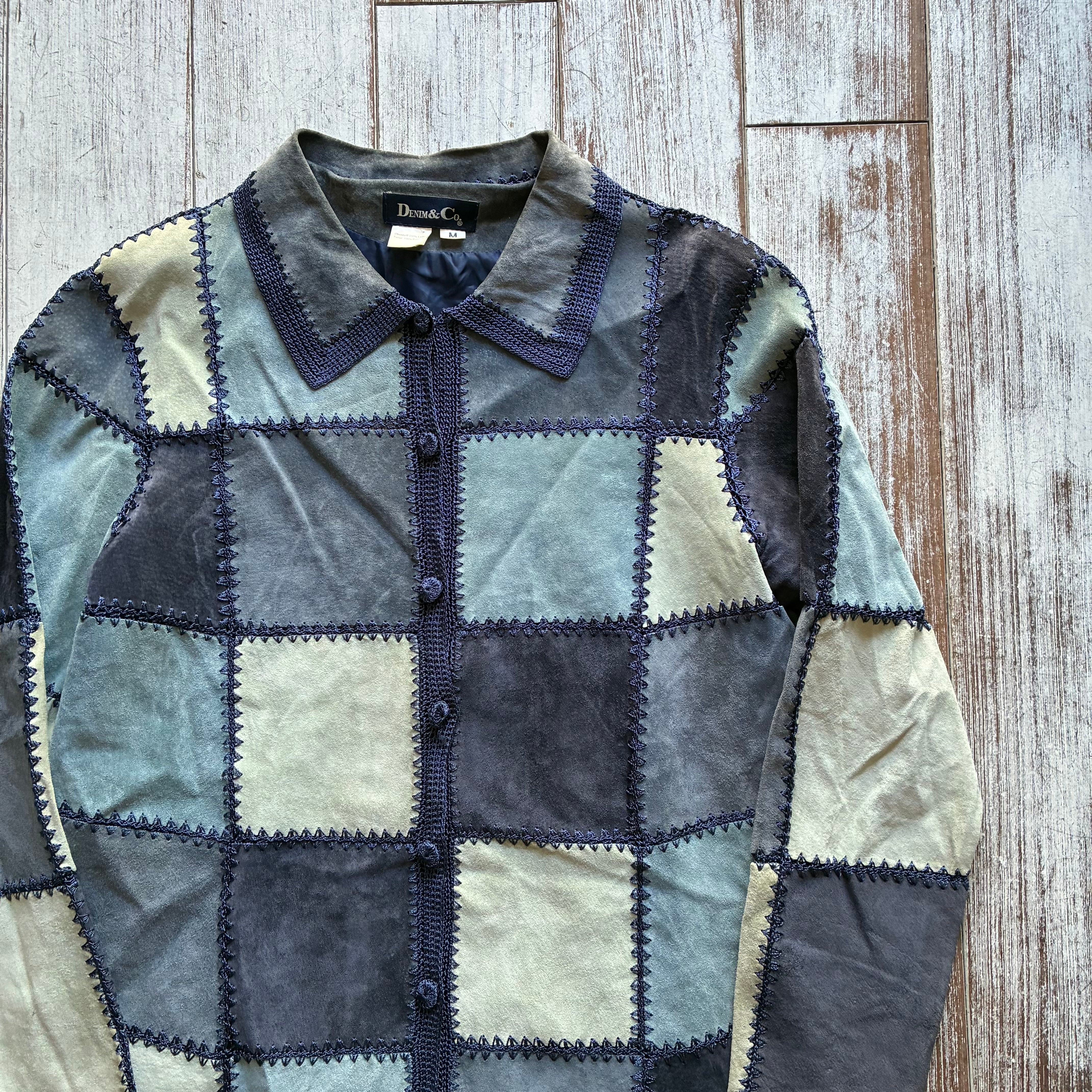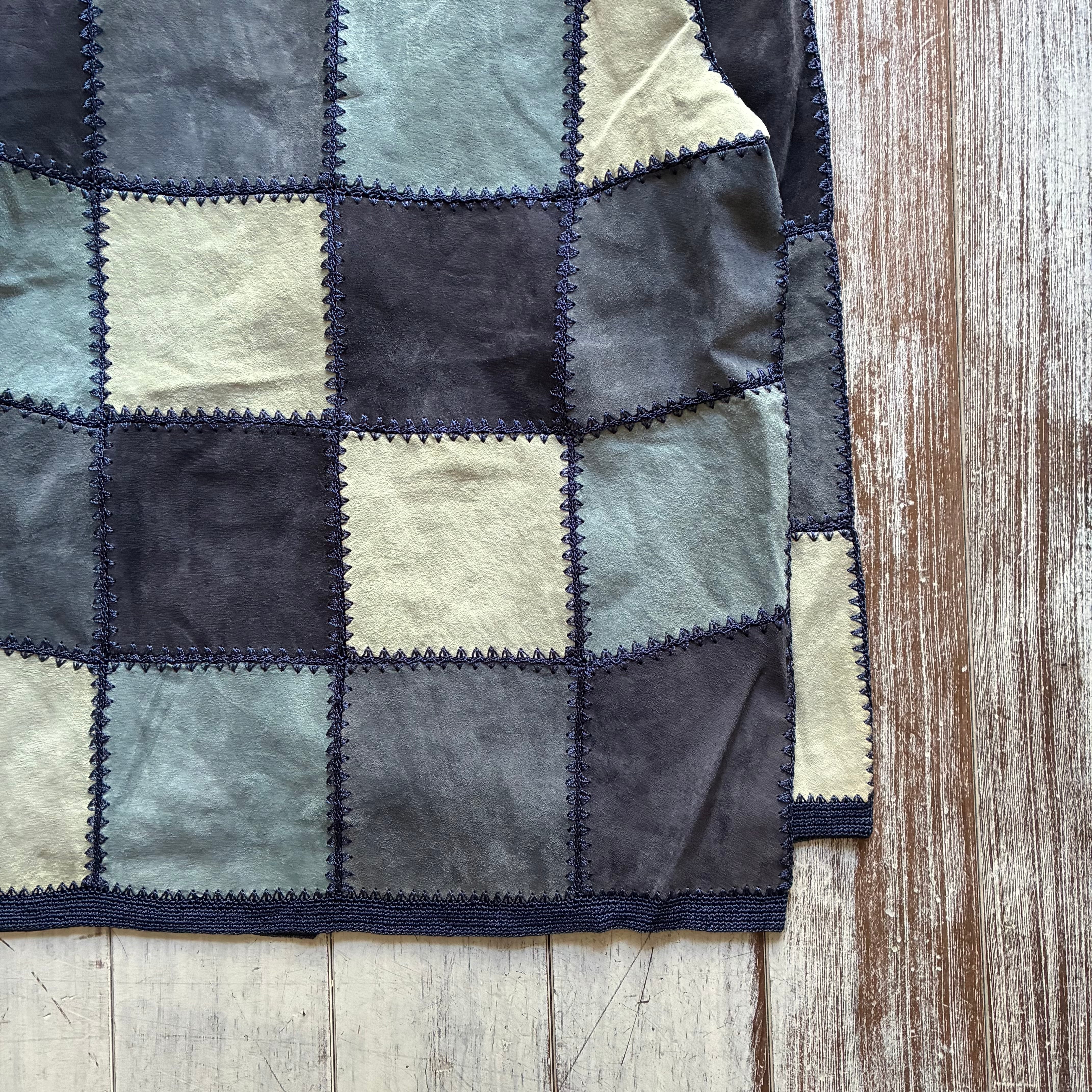 ブルーの濃淡で構成された多色な生地をパッチワーク調にレースアップで施したスエードシャツ