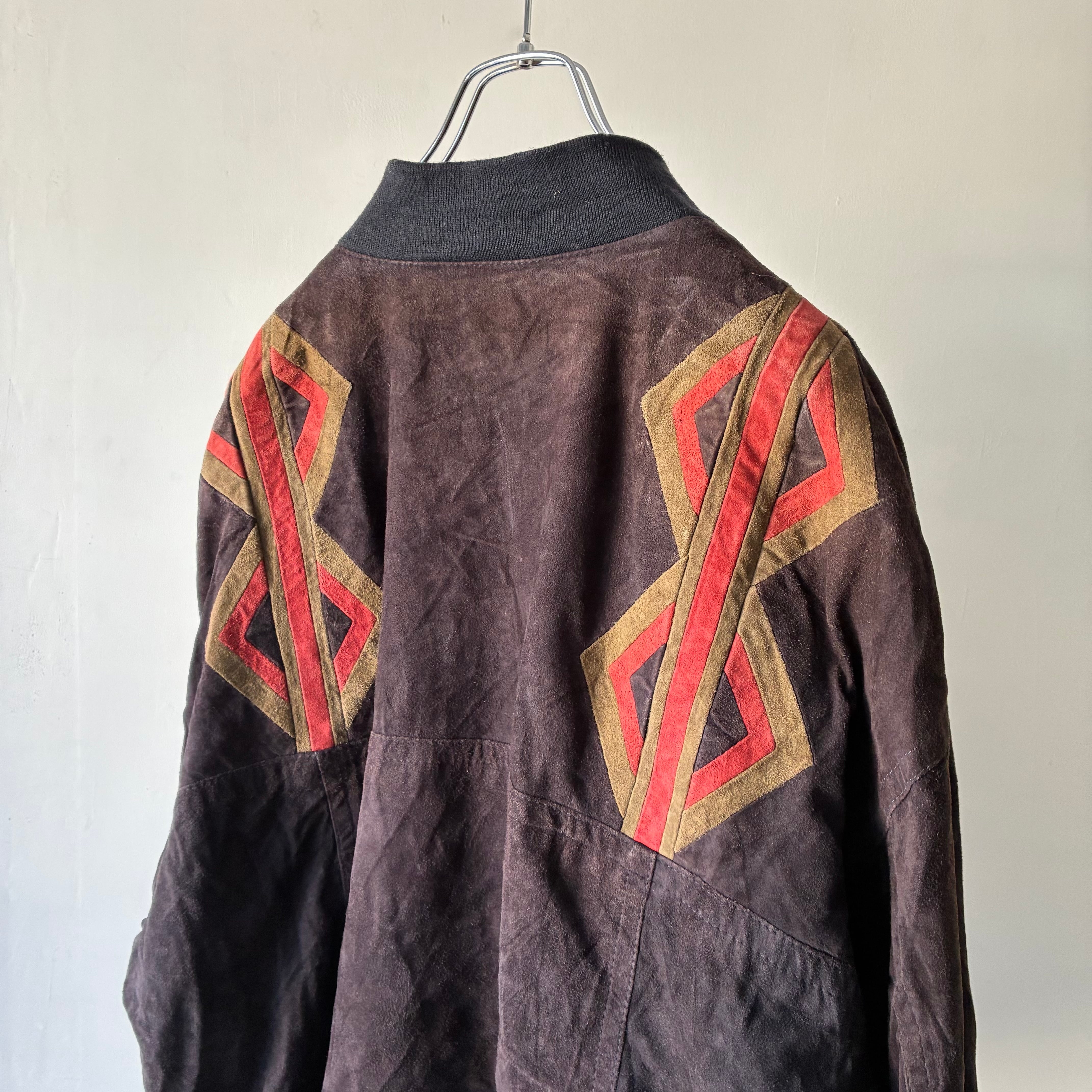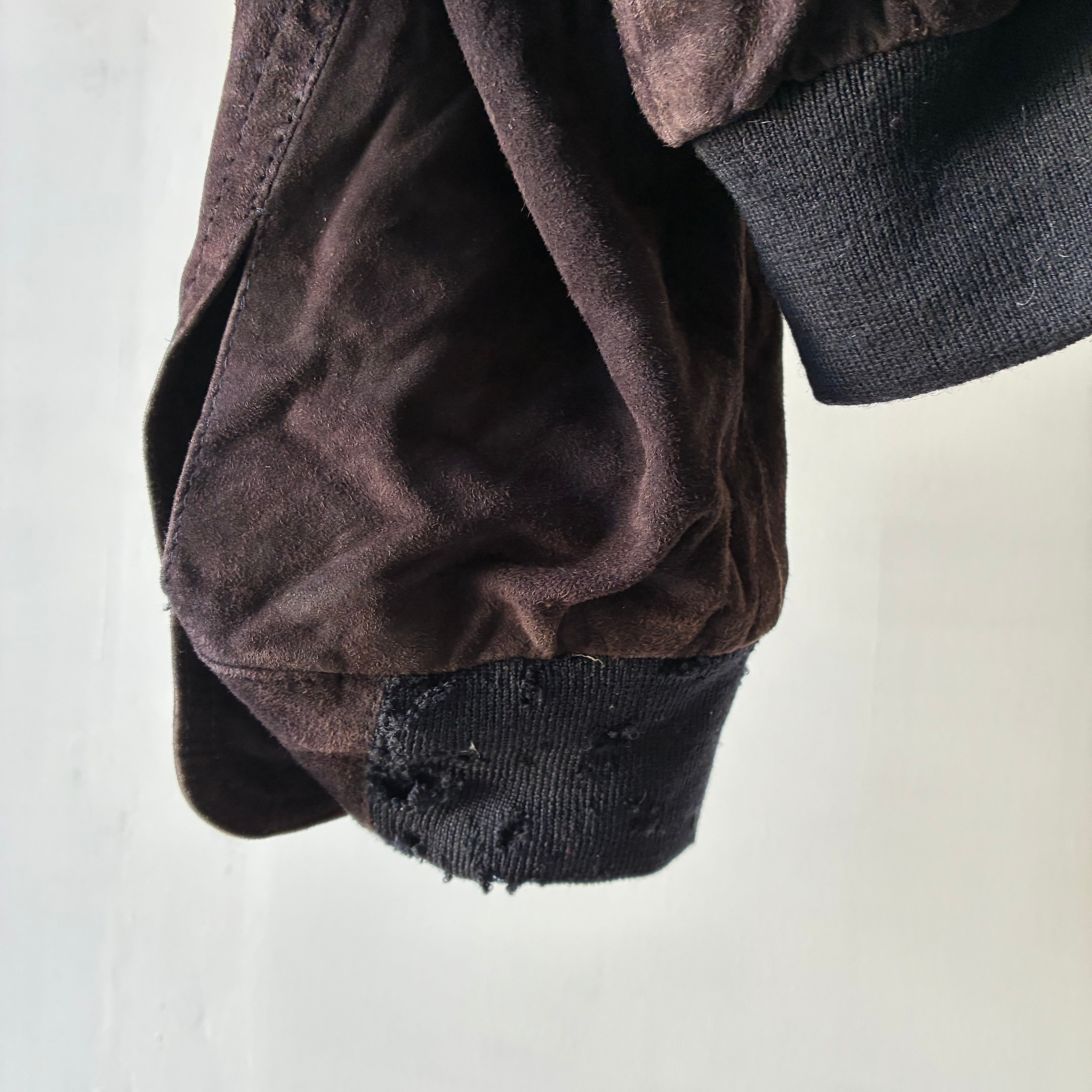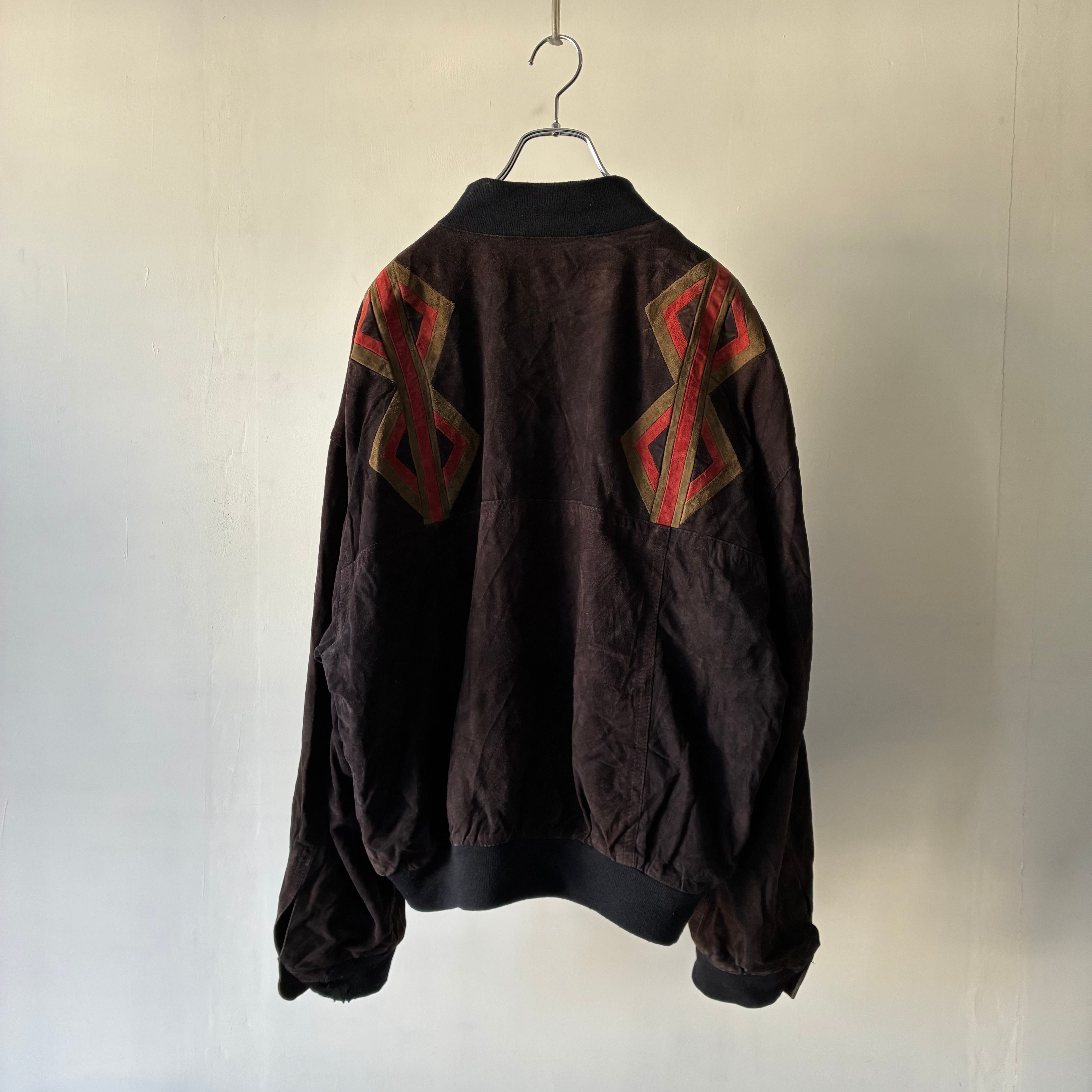 ダークブラウンカラーのボディにバイカラーでの目を惹くラインデザインがスタイリッシュなスエードジャケット
