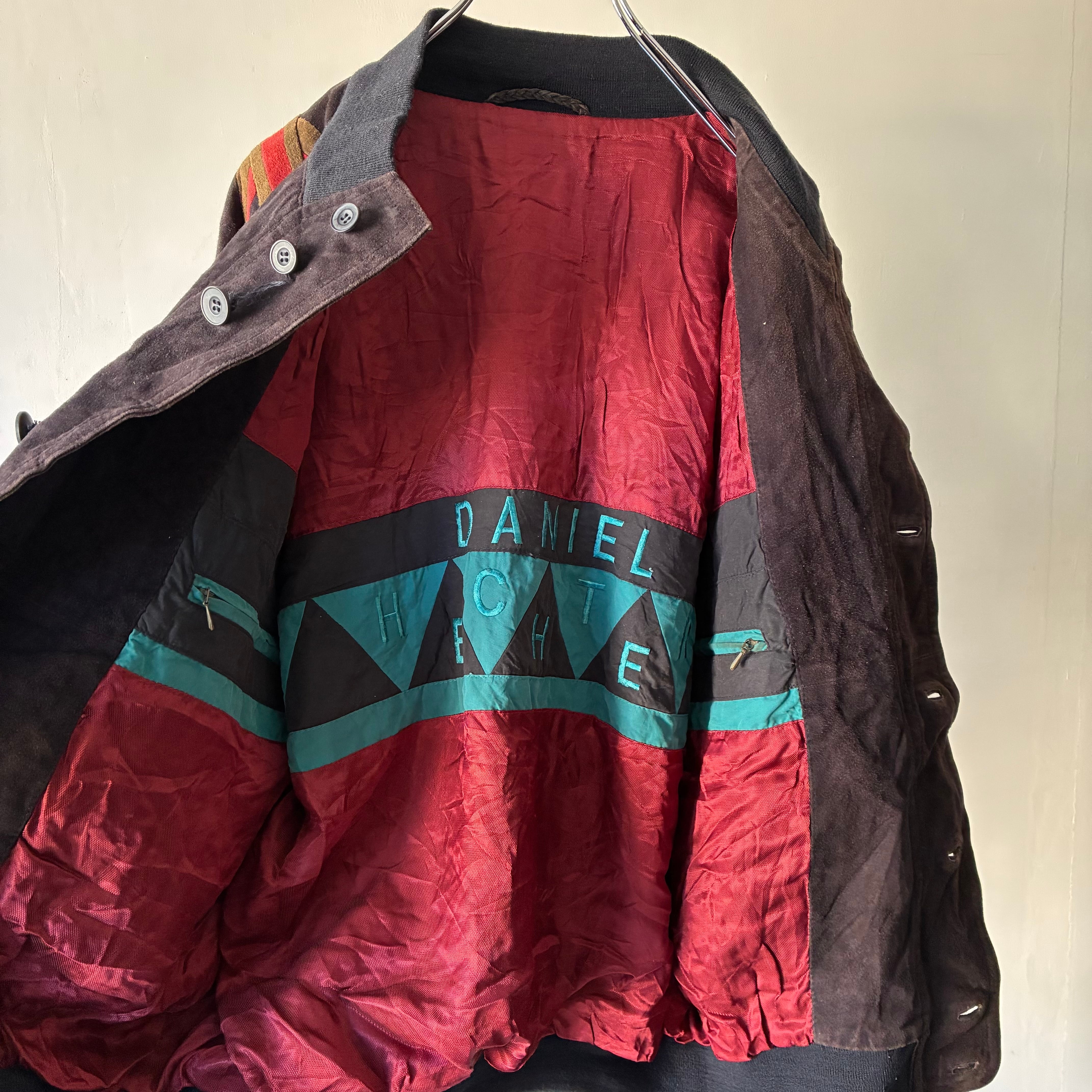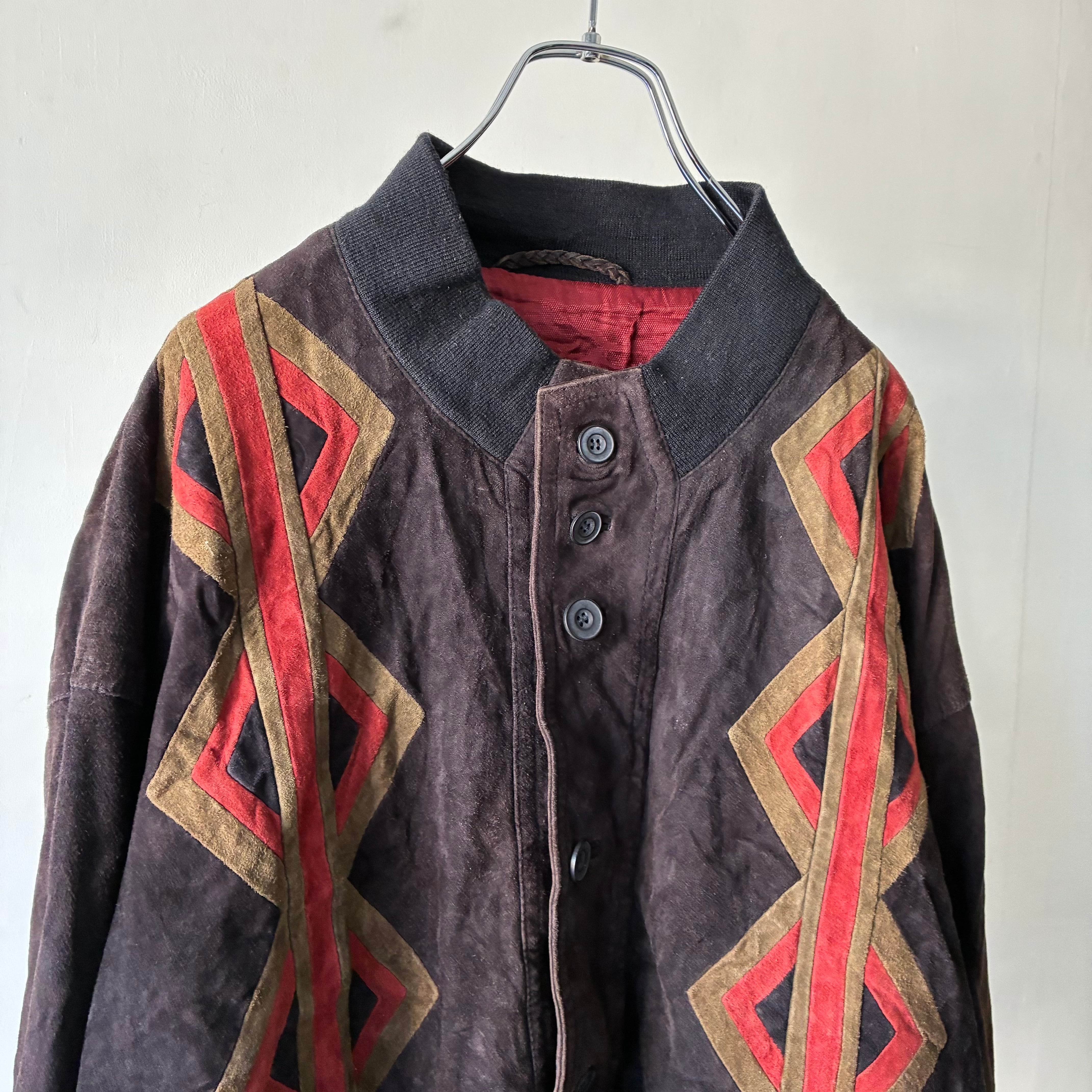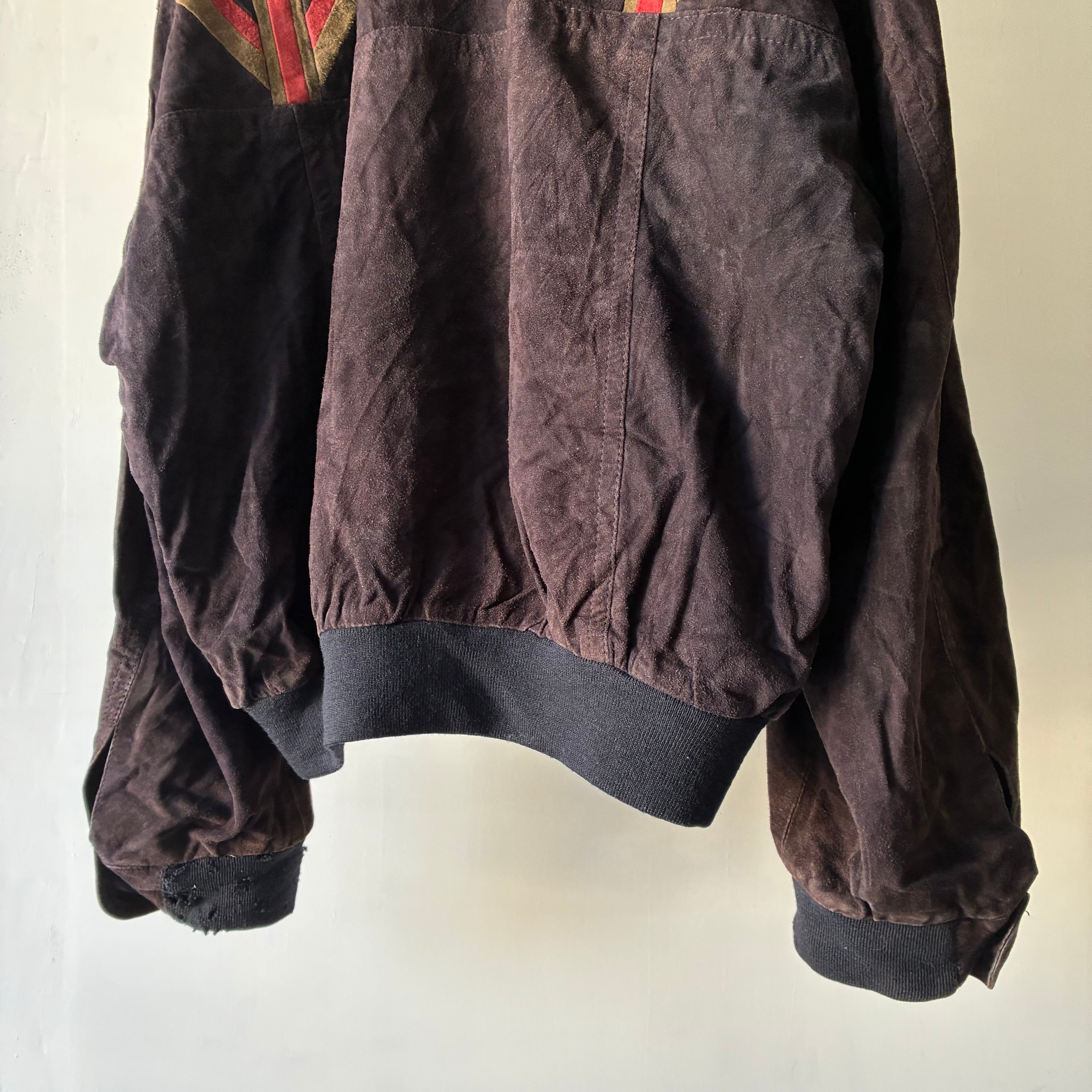 ダークブラウンカラーのボディにバイカラーでの目を惹くラインデザインがスタイリッシュなスエードジャケット