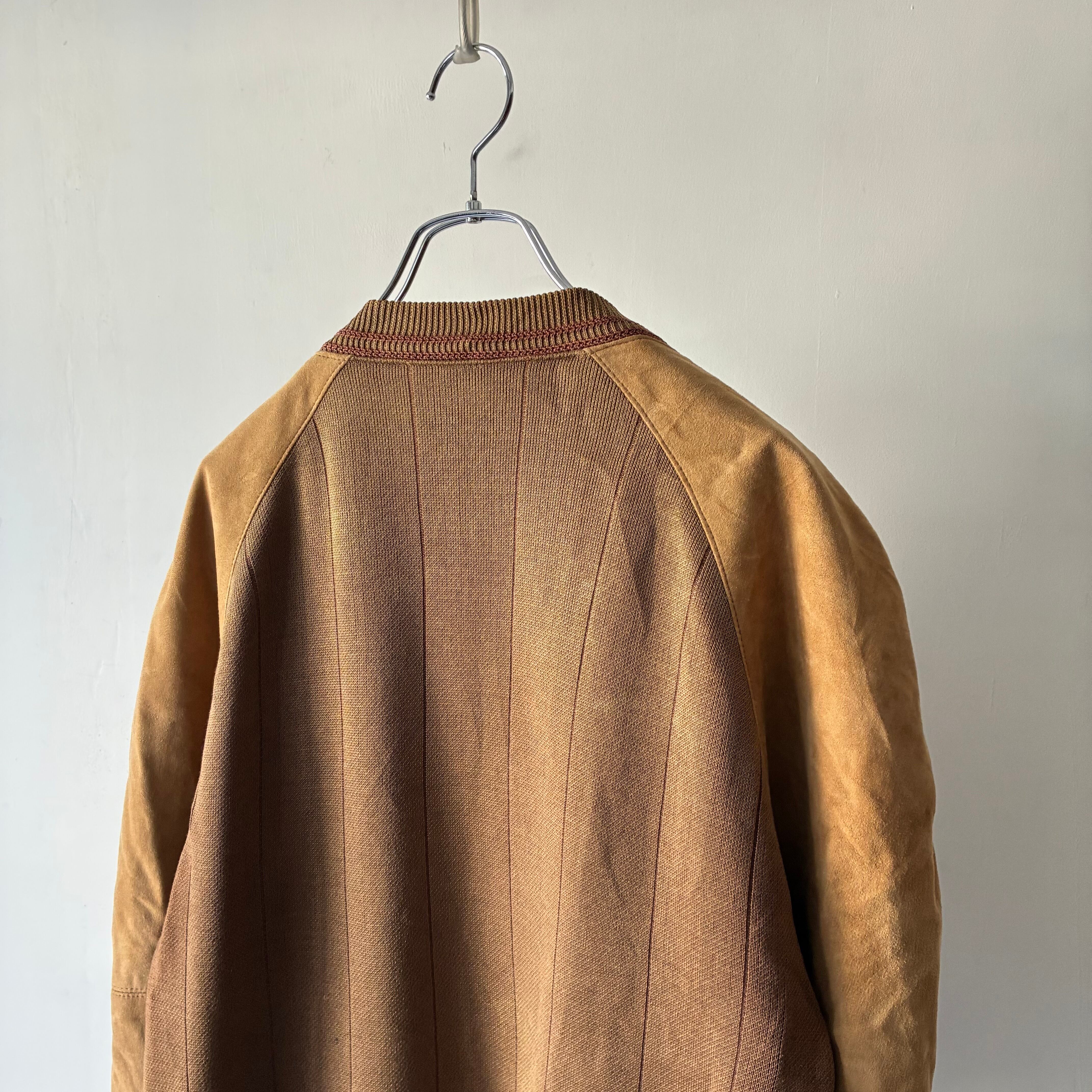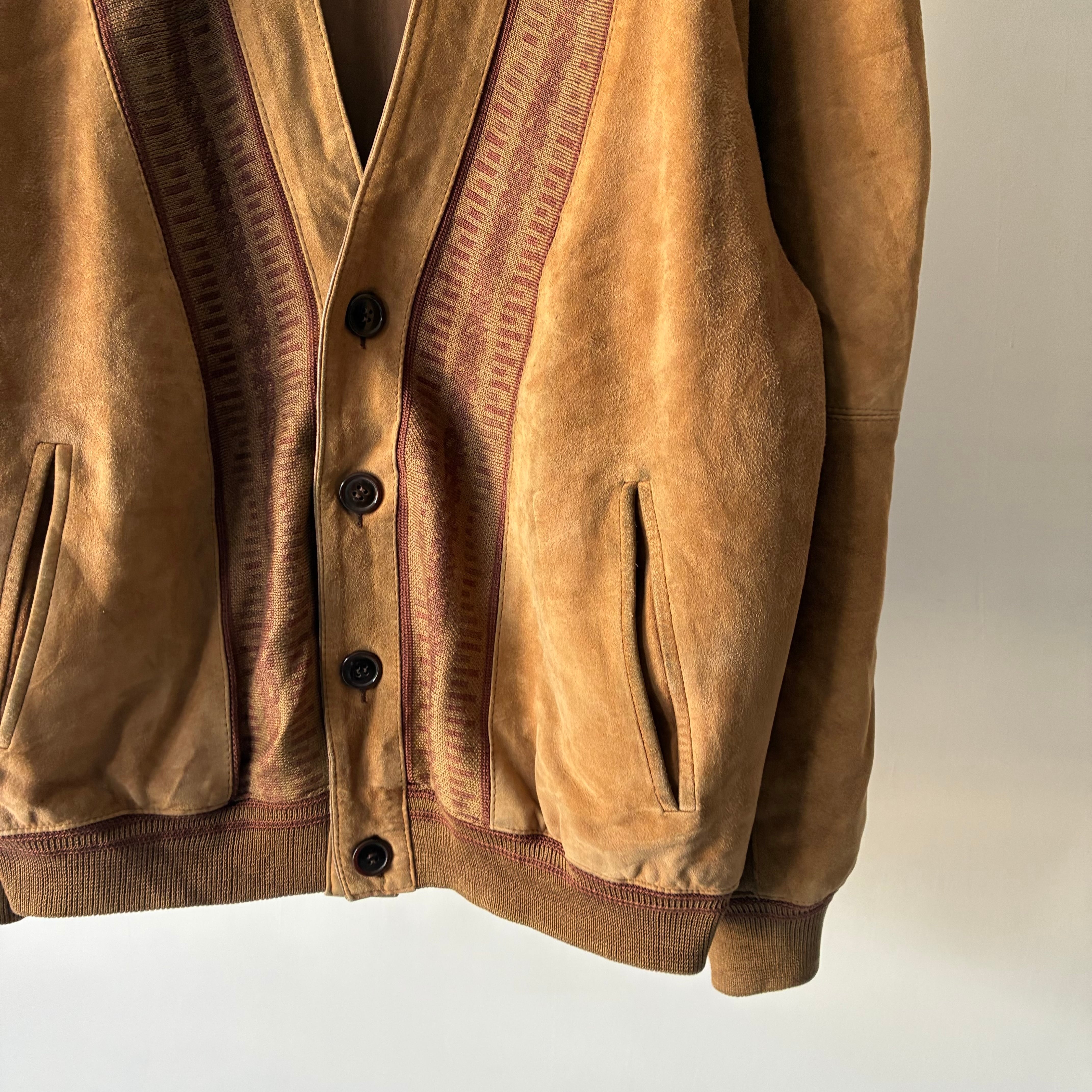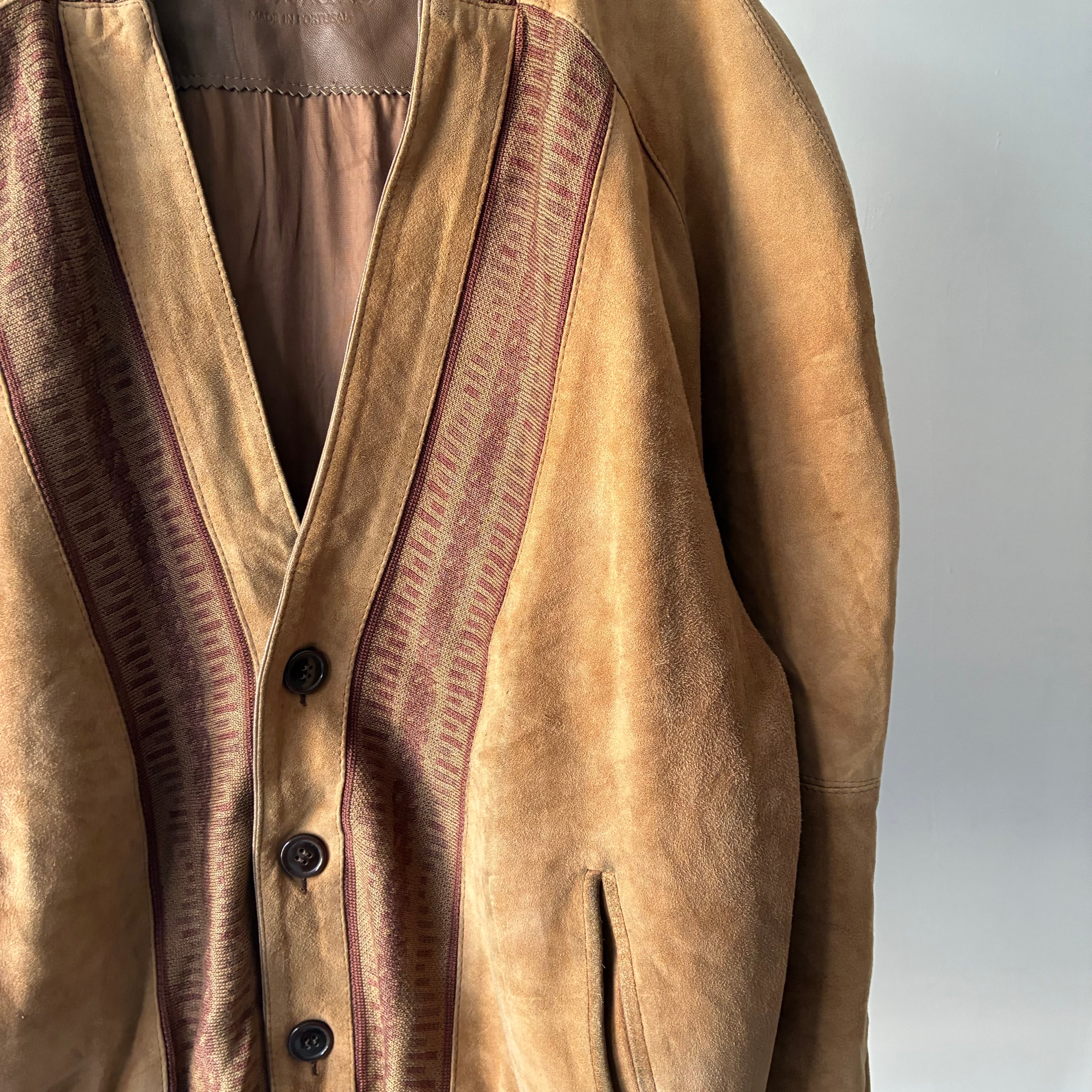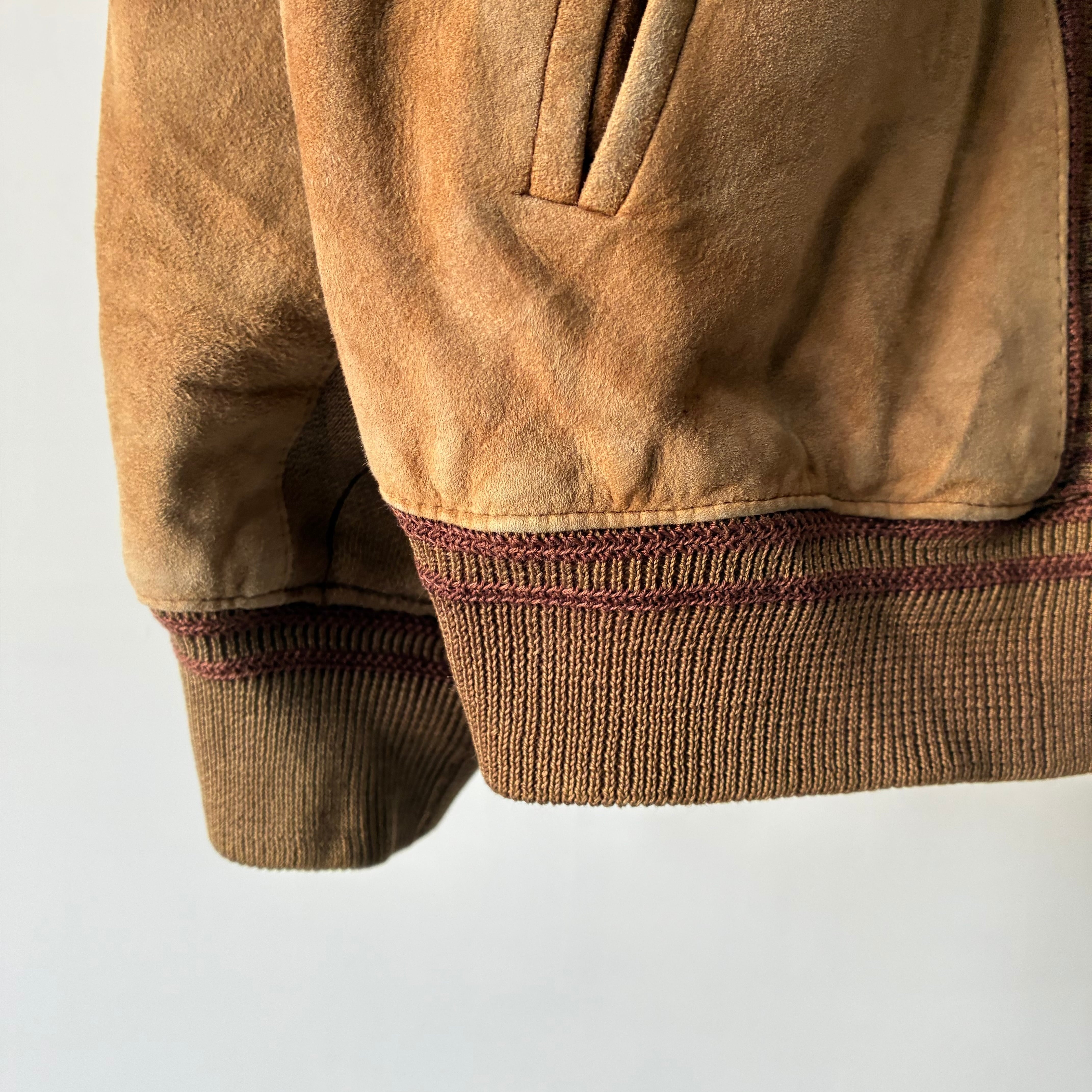 マットな質感でしなやかな風合いのスエード生地と柄の効いたニット生地とのコンビ