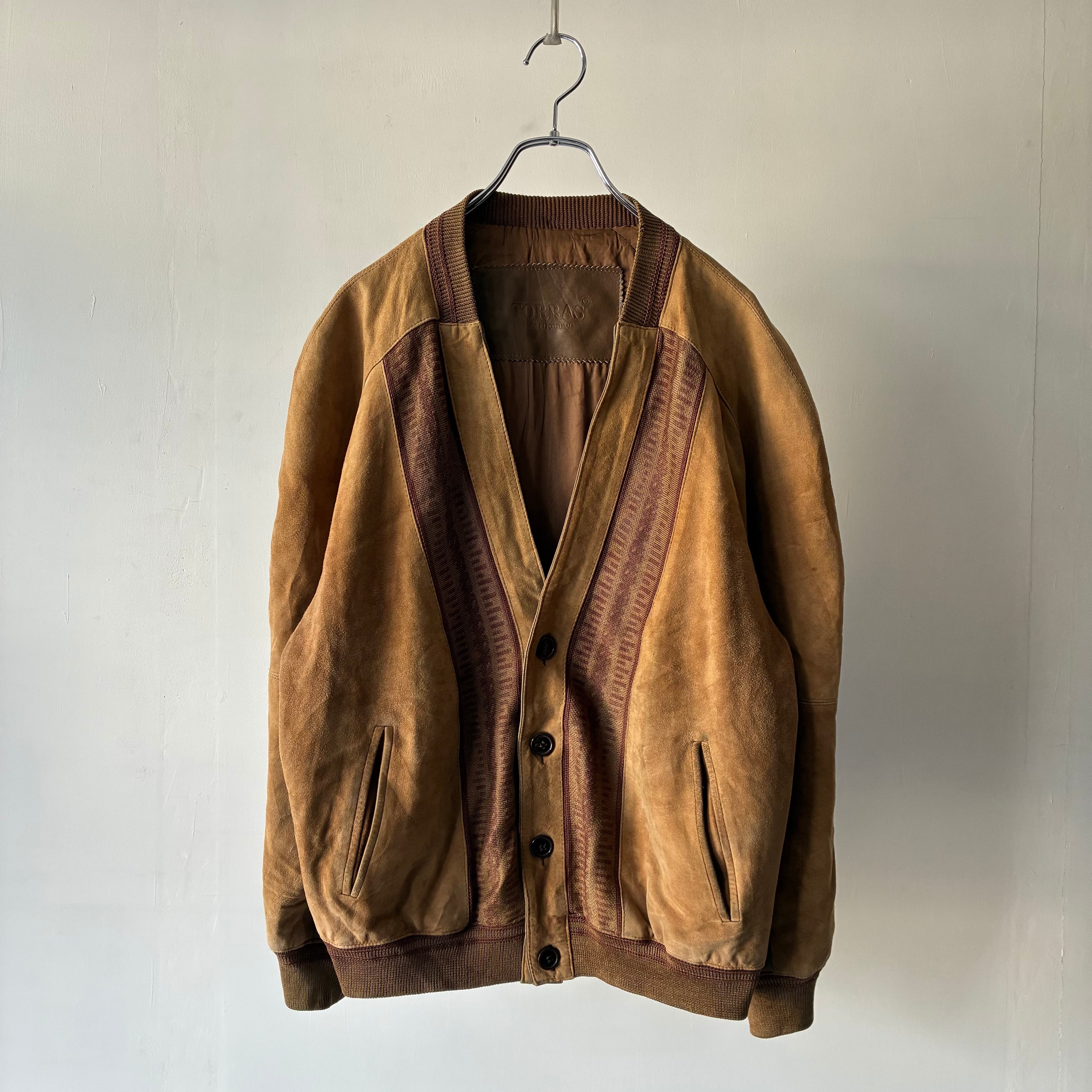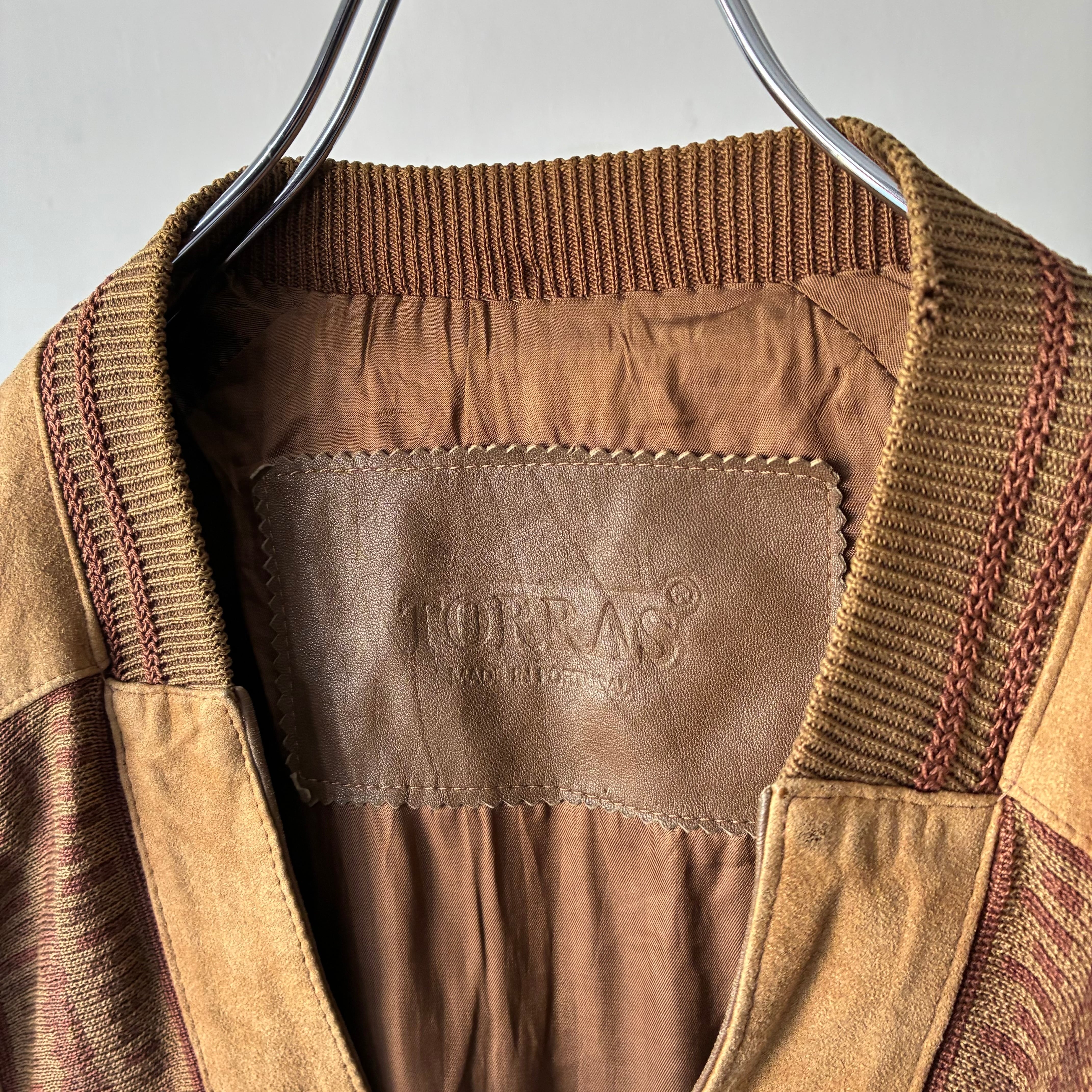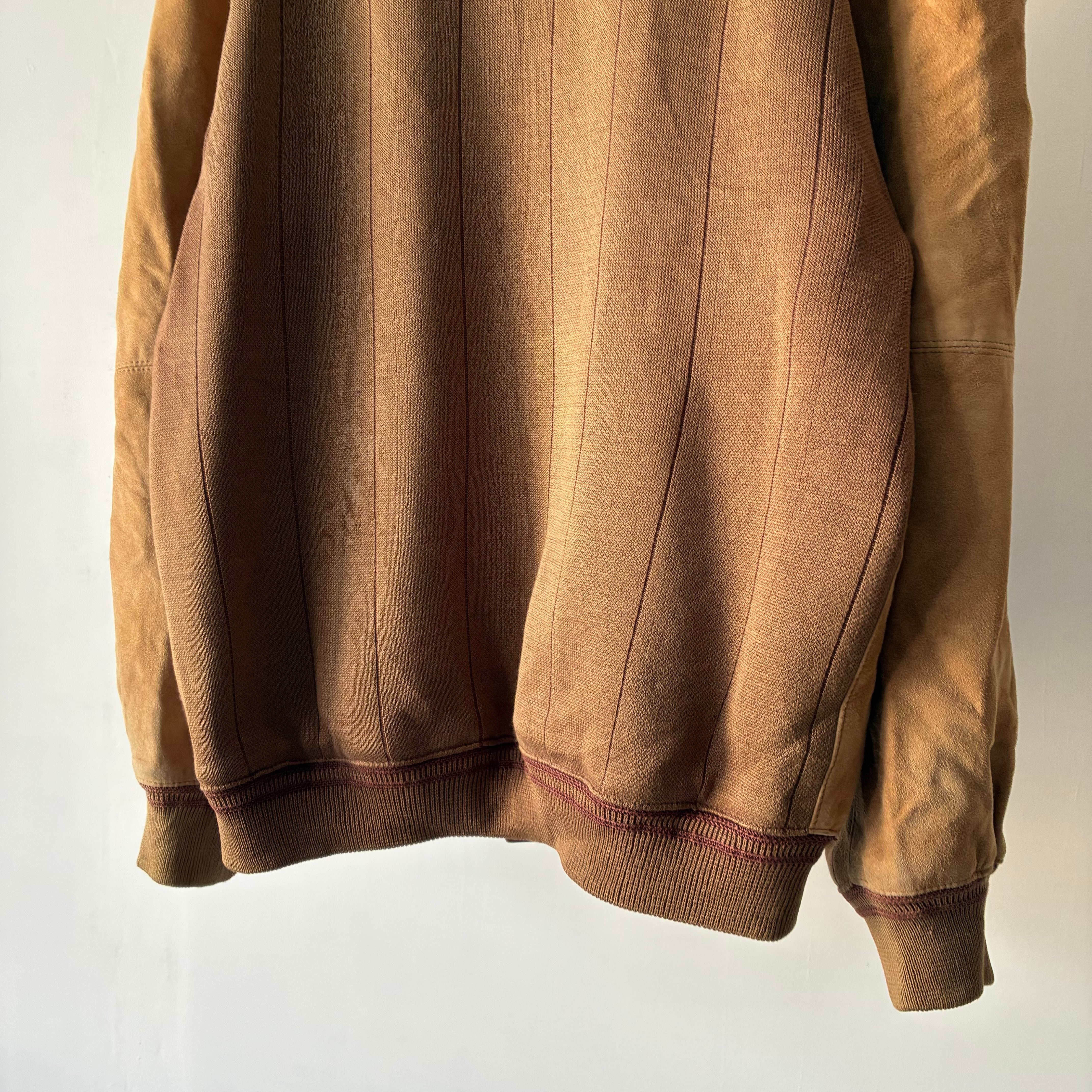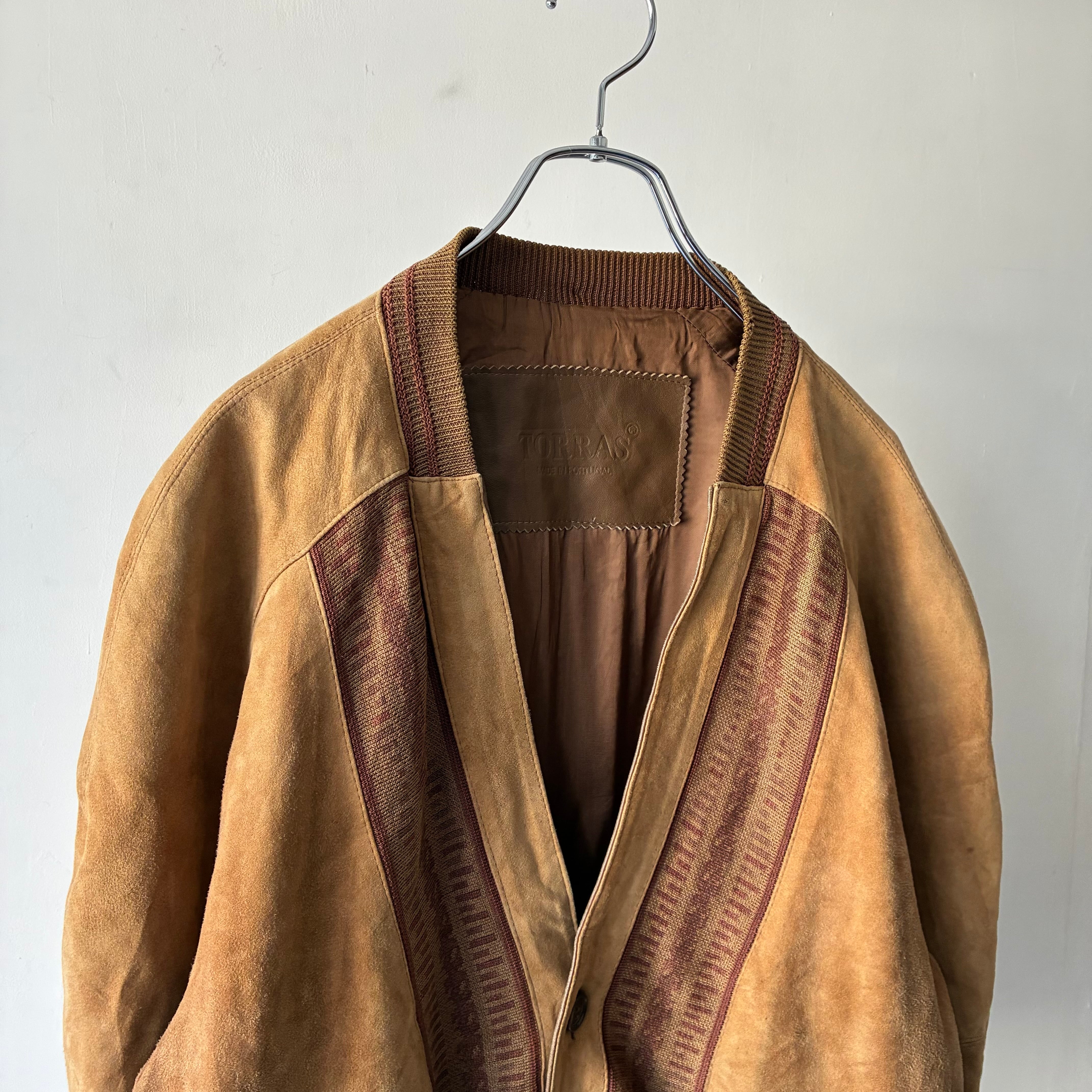 マットな質感でしなやかな風合いのスエード生地と柄の効いたニット生地とのコンビ