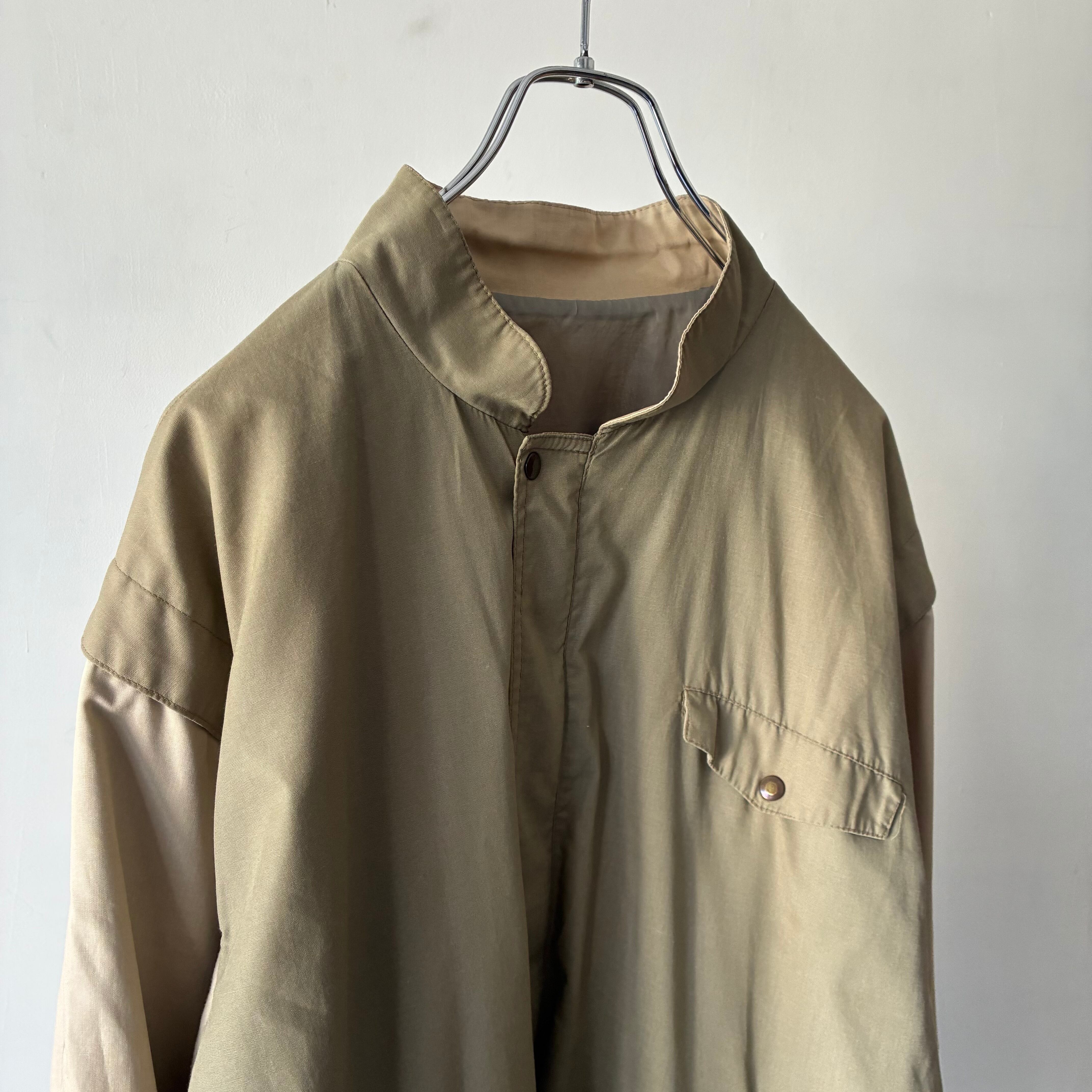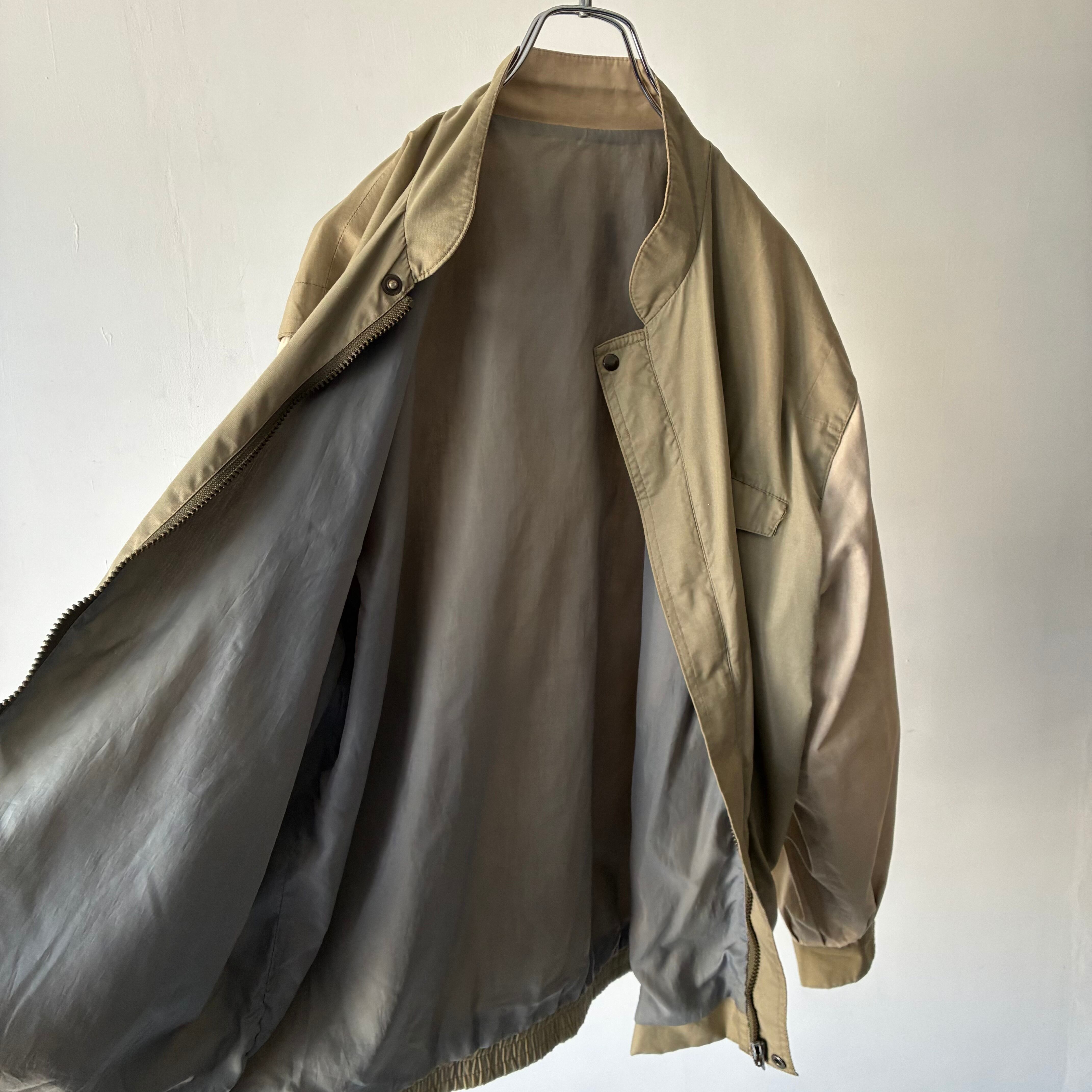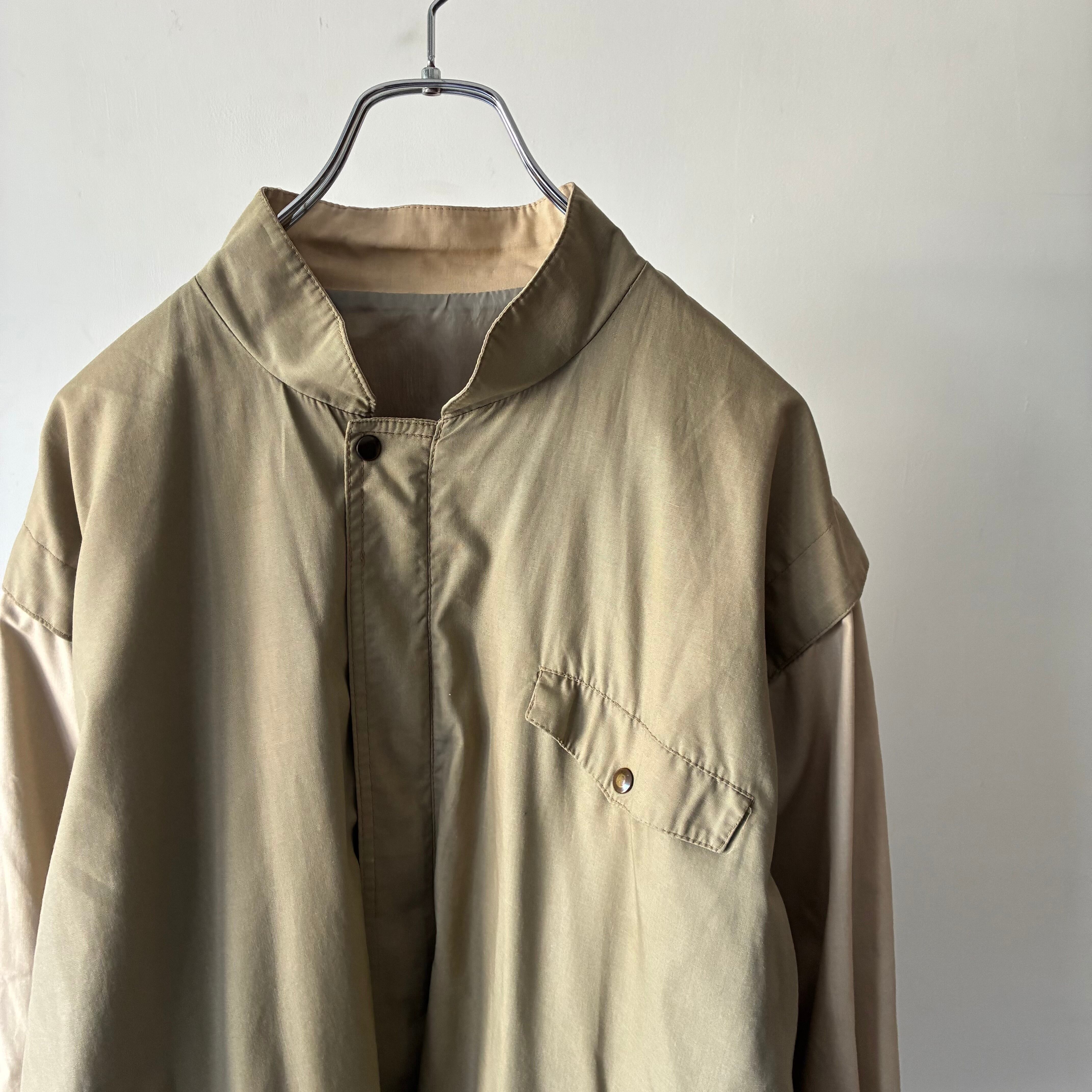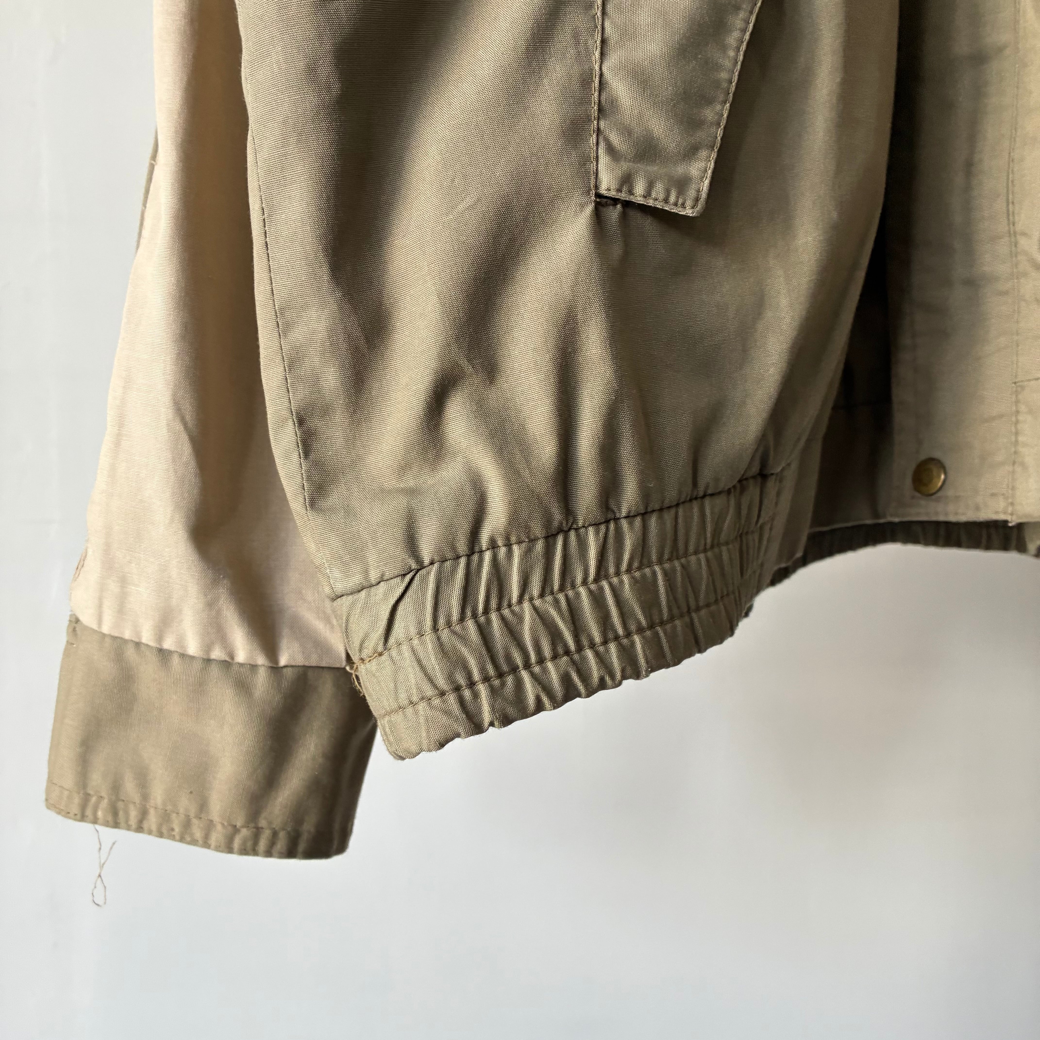 淡いオリーブグリーンとベージュの落ち着きのあるバイカラーが魅力的なライトジャケット
