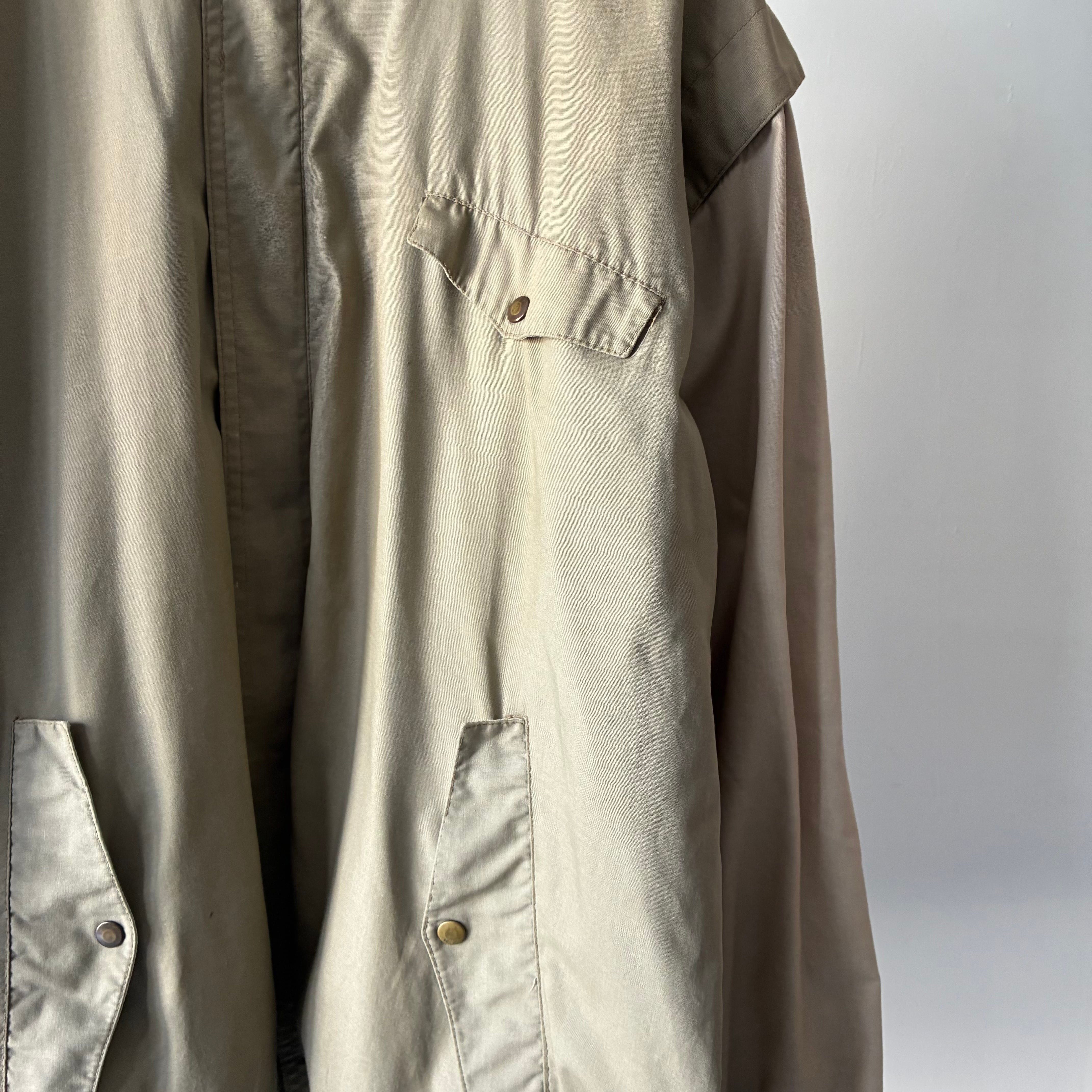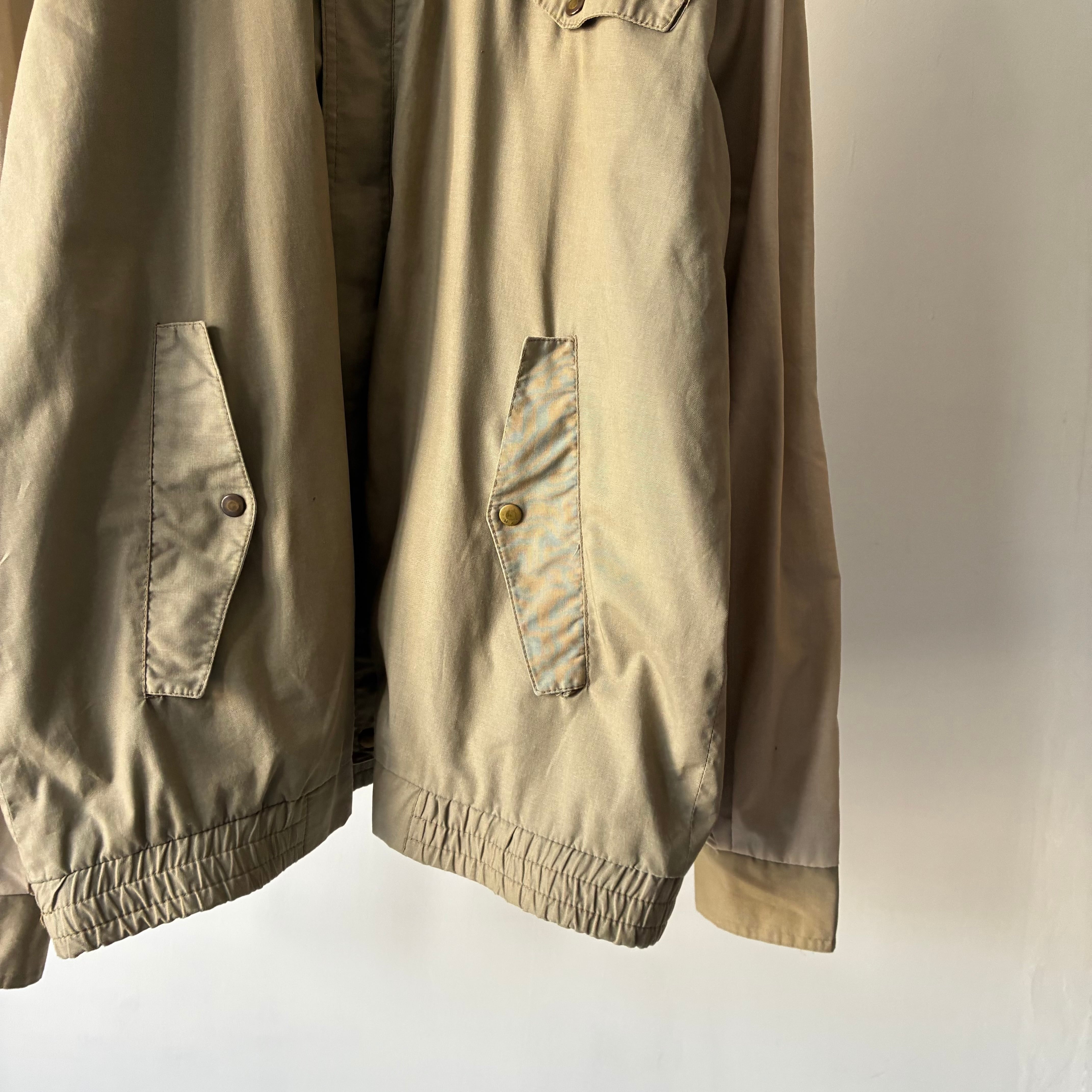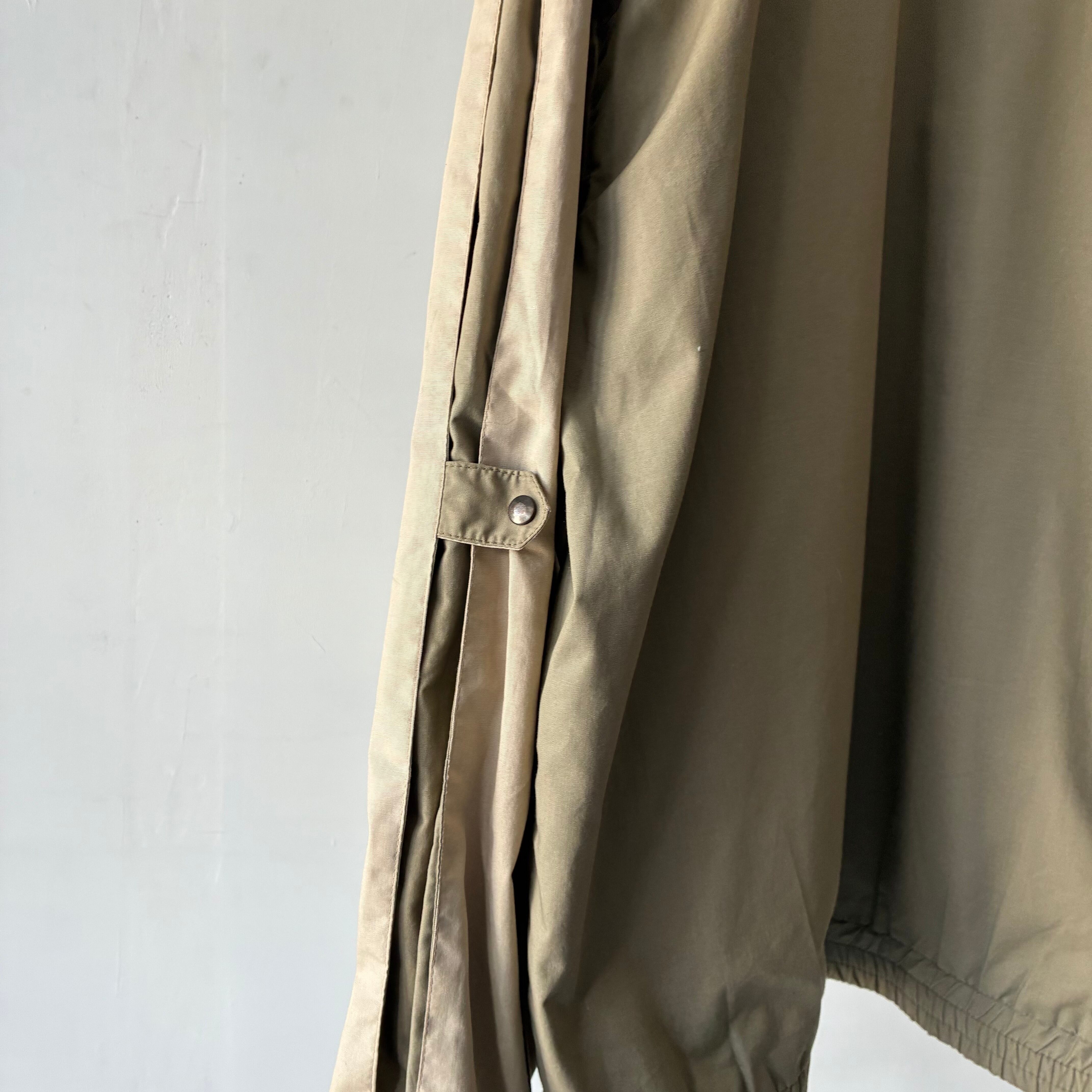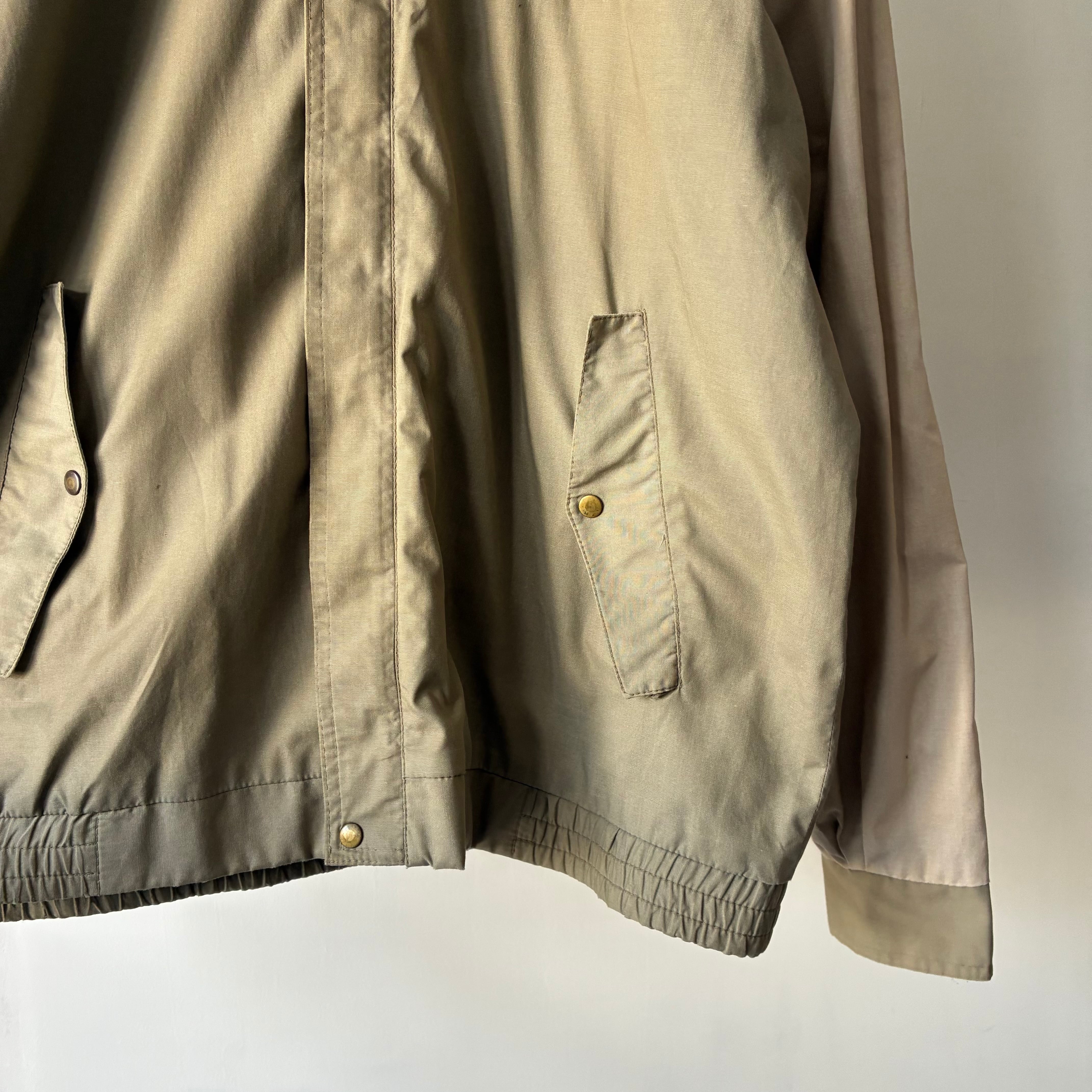 淡いオリーブグリーンとベージュの落ち着きのあるバイカラーが魅力的なライトジャケット