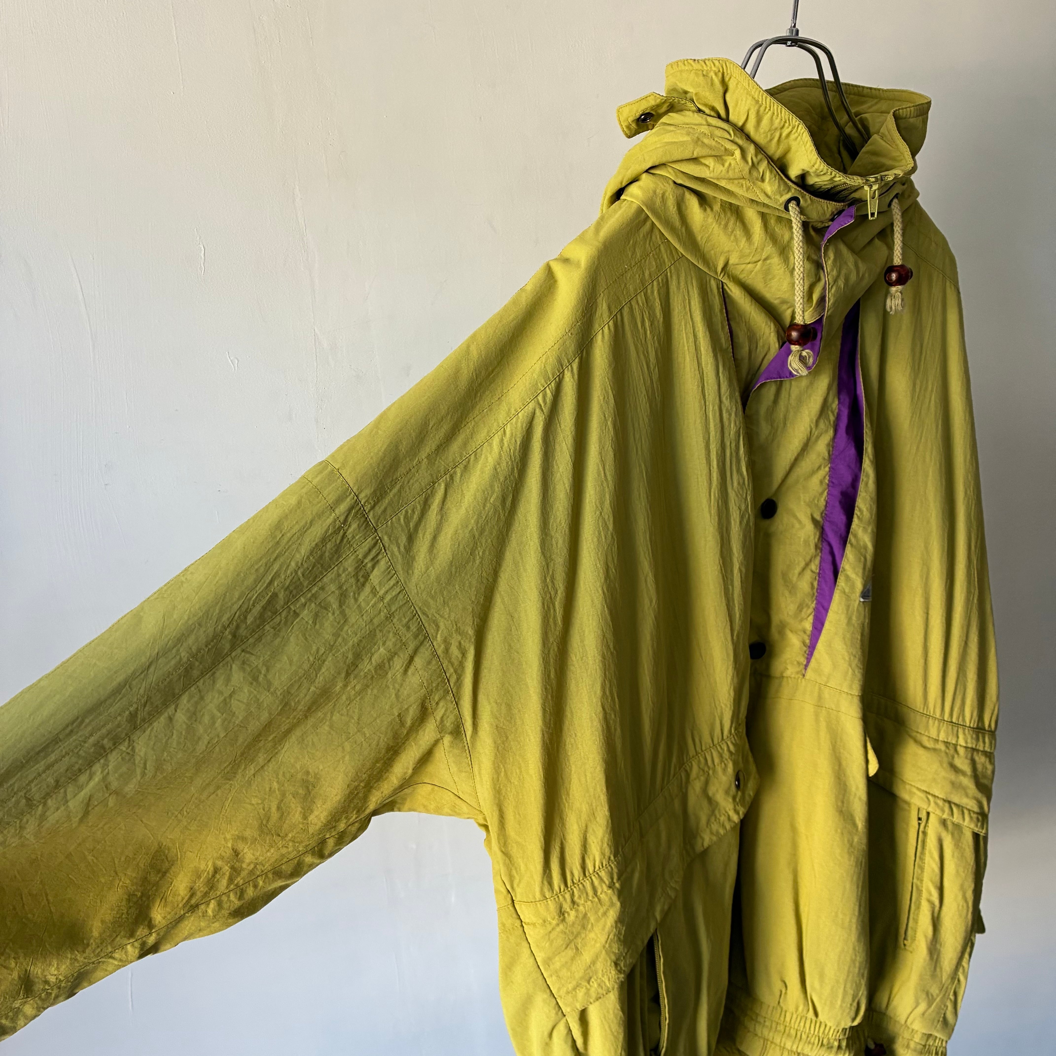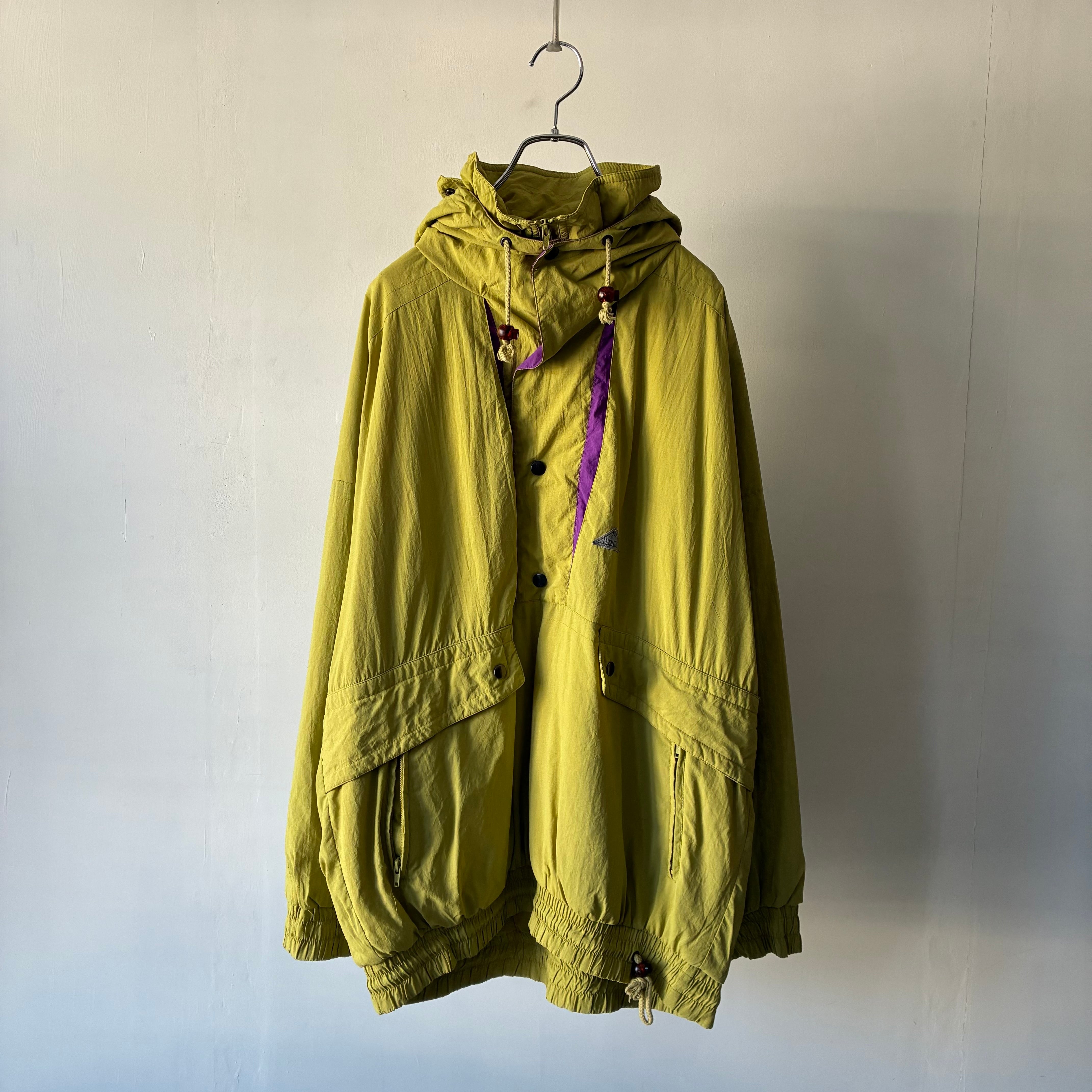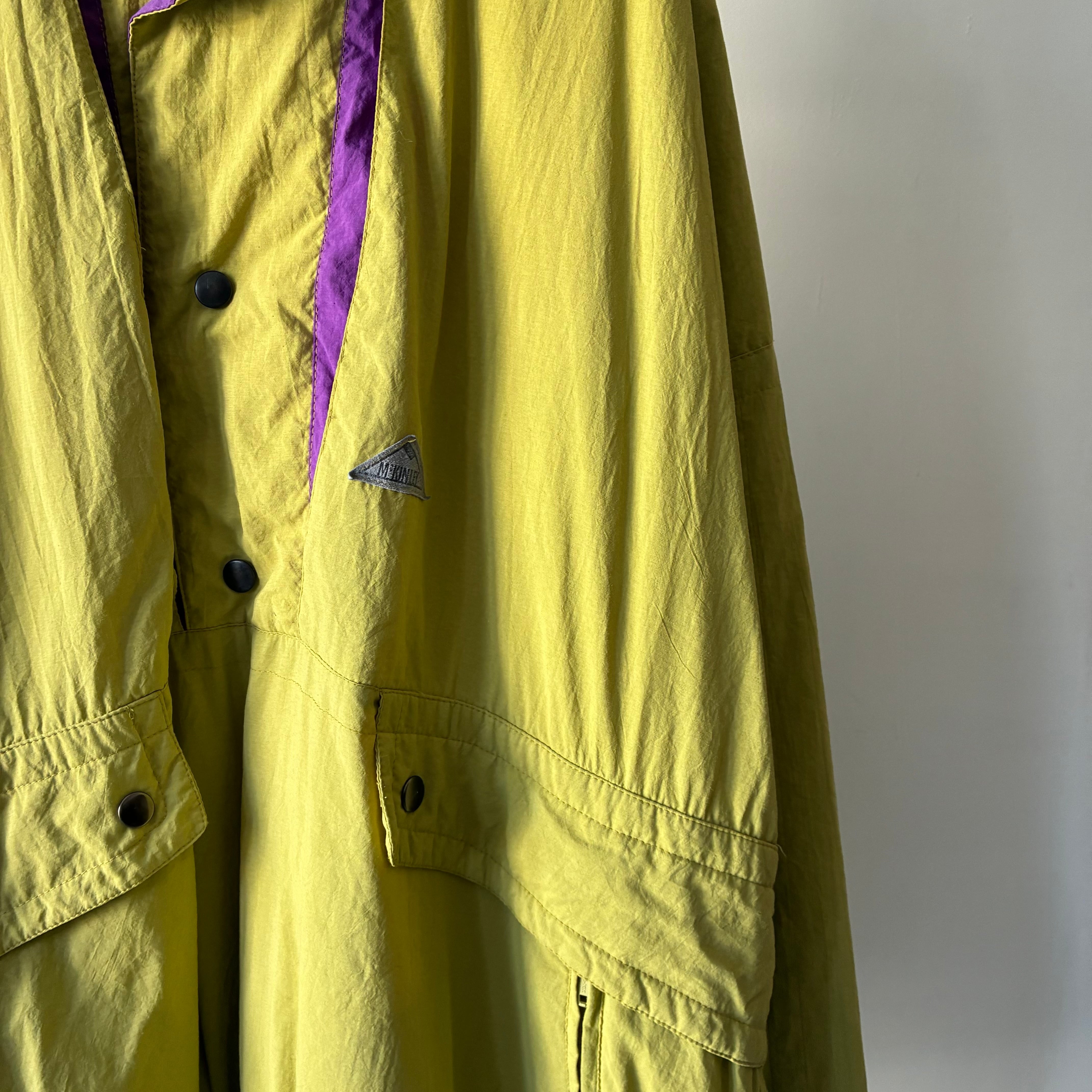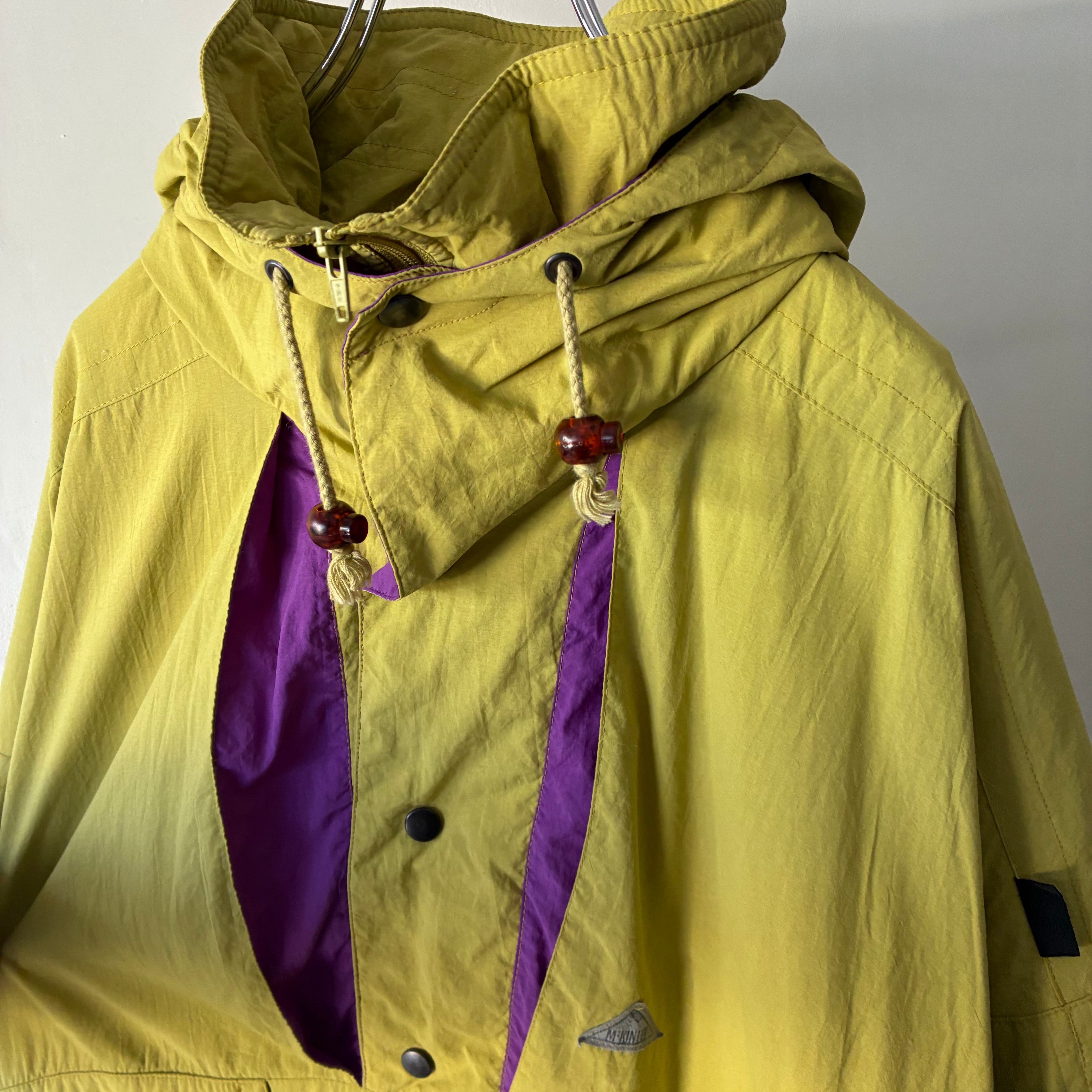 ライトグリーンのボディからパープルの差し色が覗く秀逸なバイカラーのナイロンアノラック