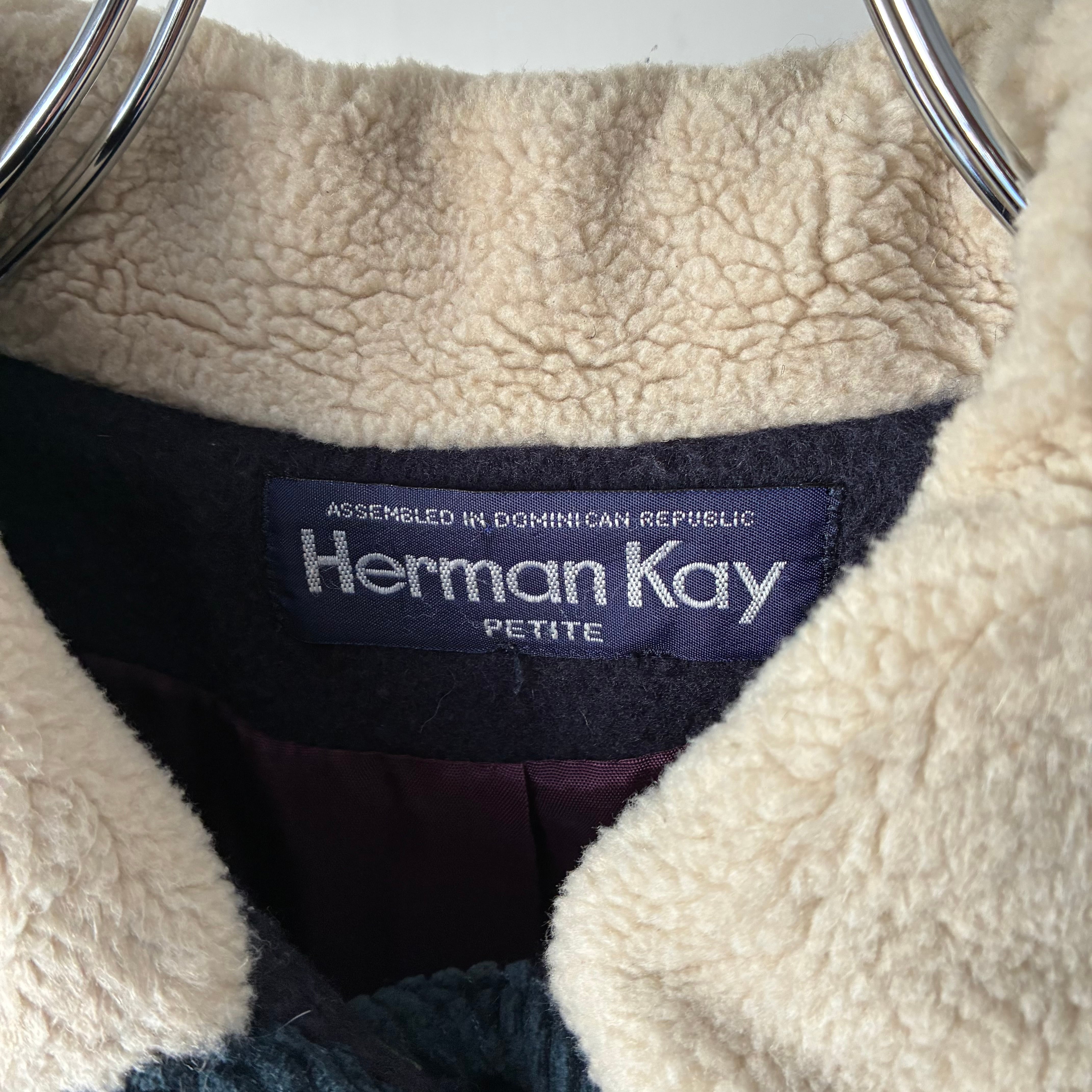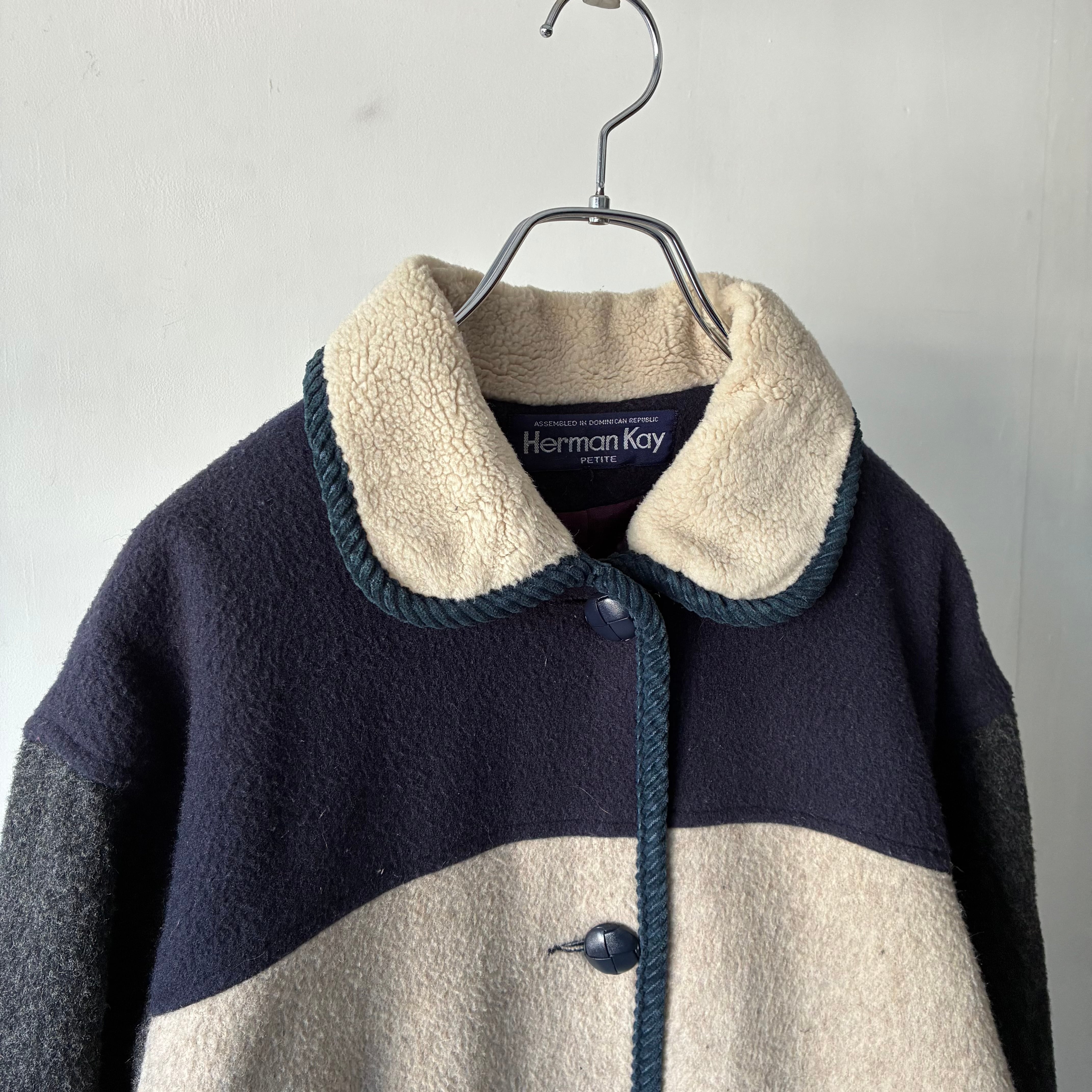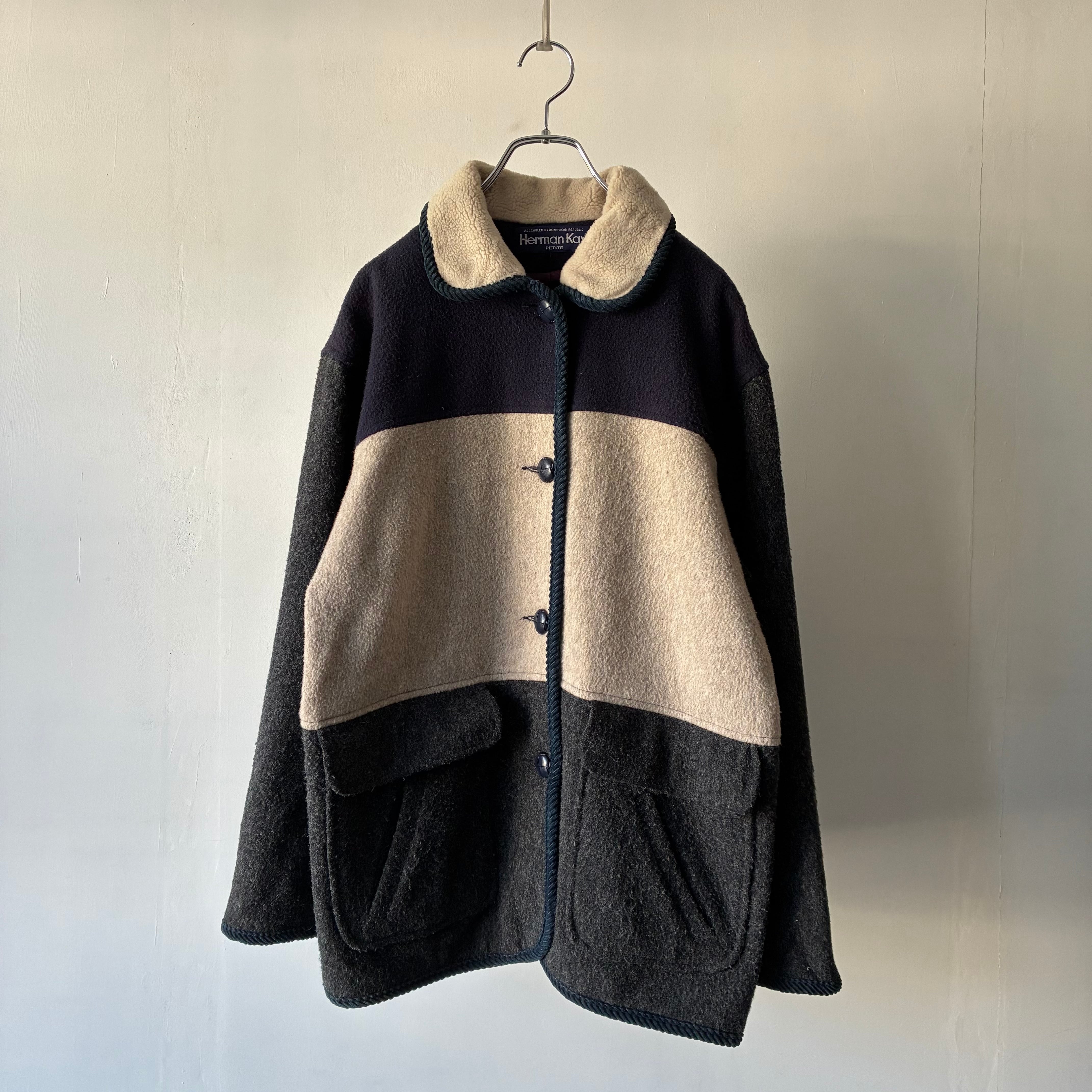 ニューヨークの老舗アウターウェアブランドHerman Kayのウールジャケット モノトーンで構成された落ち着きのある3トーンのカラーリングが映える秀逸なデザイン チクチクしないソフトな風合いで保温性に富んだアクリル混のウール素材 バスケット編みの暖かみあるボタンも良いアクセントです . 着丈 71 肩幅 53 身幅 56 袖丈 59
