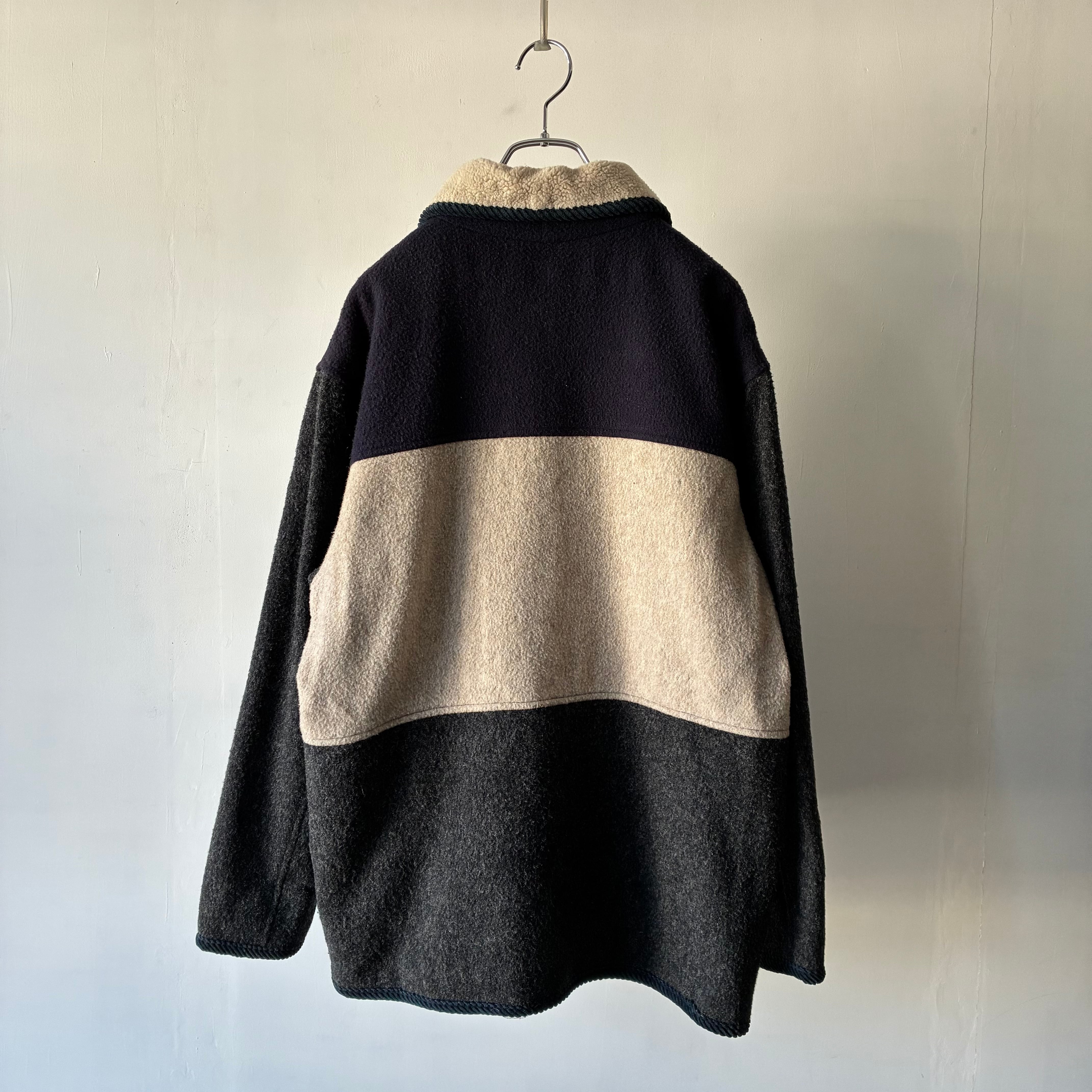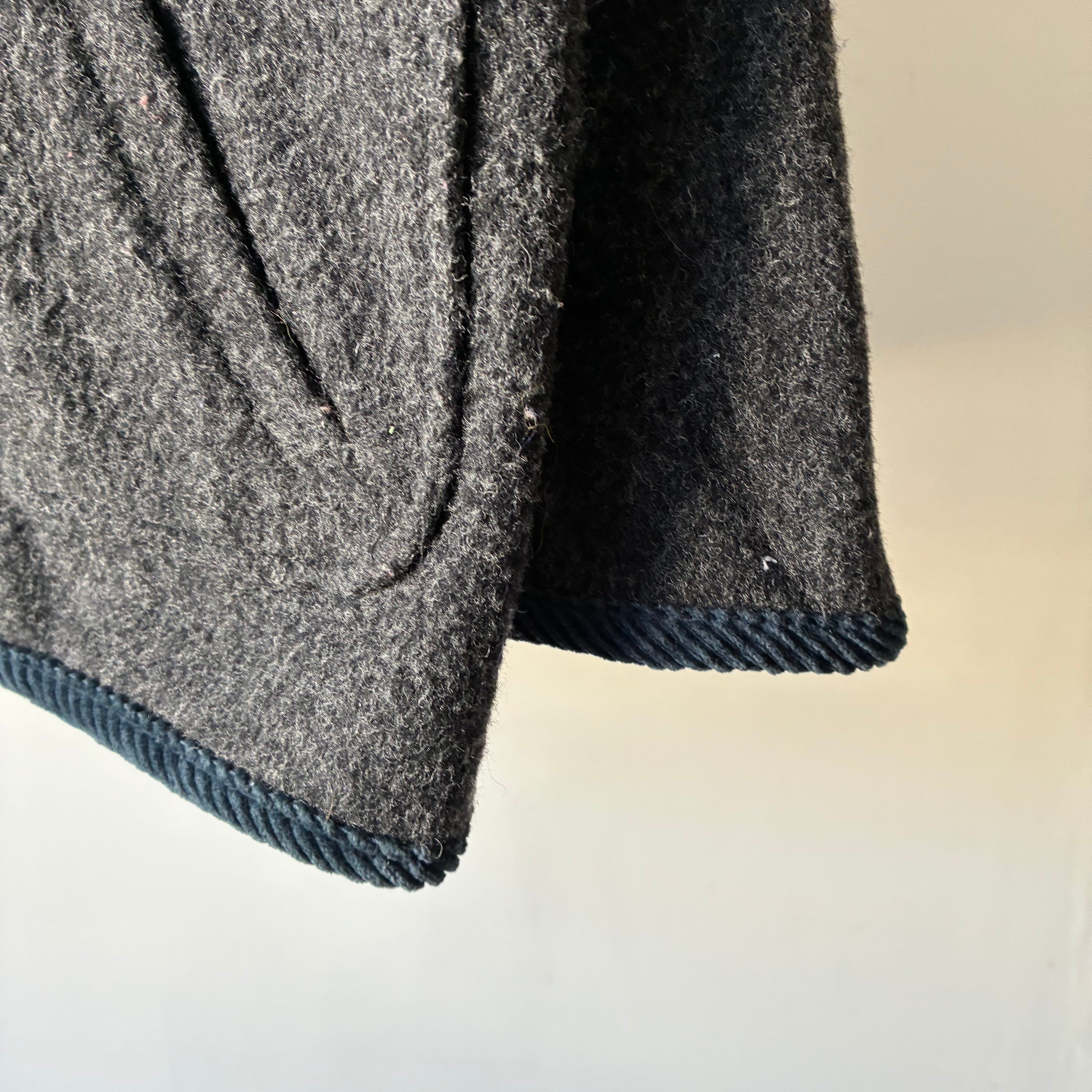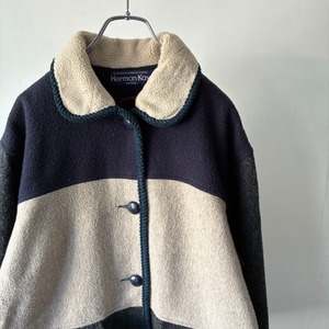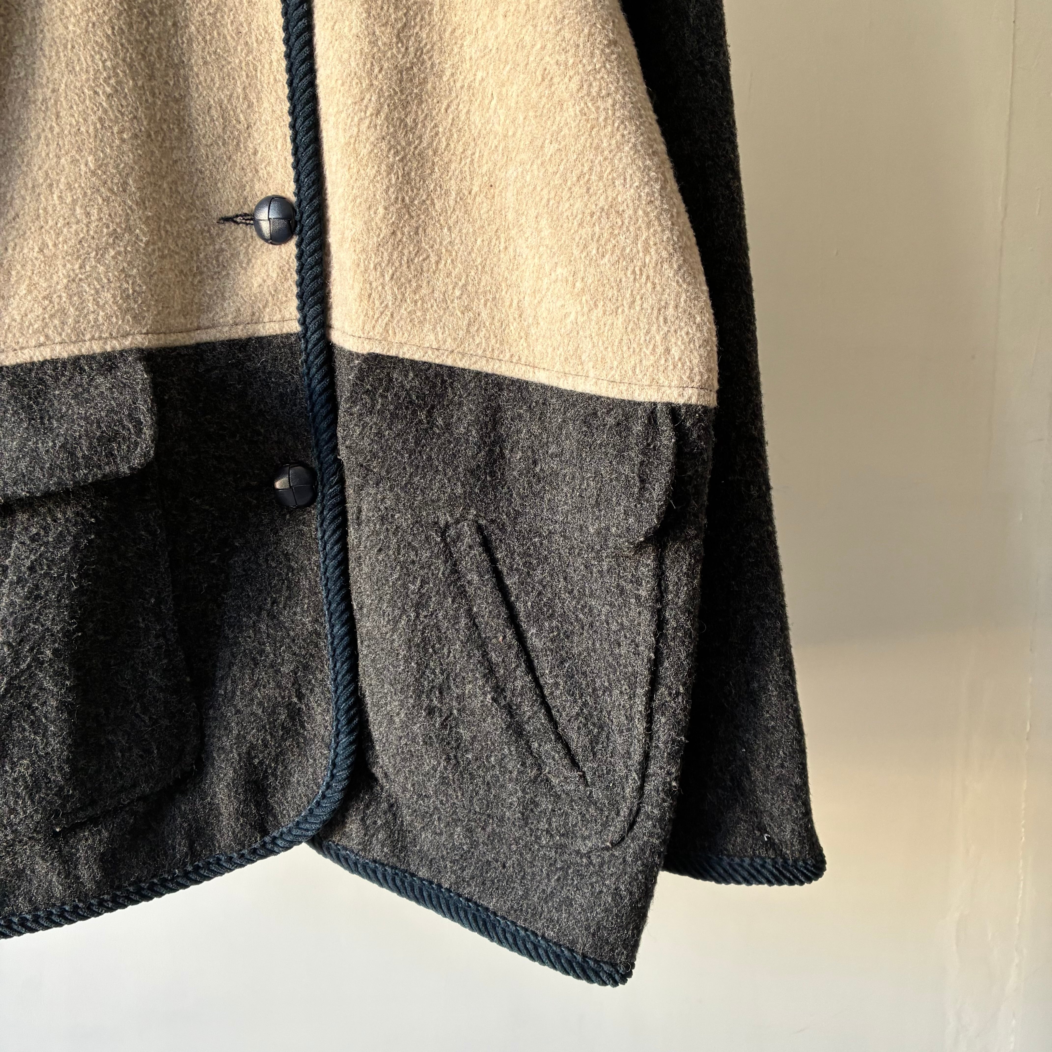 ニューヨークの老舗アウターウェアブランドHerman Kayのウールジャケット モノトーンで構成された落ち着きのある3トーンのカラーリングが映える秀逸なデザイン チクチクしないソフトな風合いで保温性に富んだアクリル混のウール素材 バスケット編みの暖かみあるボタンも良いアクセントです . 着丈 71 肩幅 53 身幅 56 袖丈 59