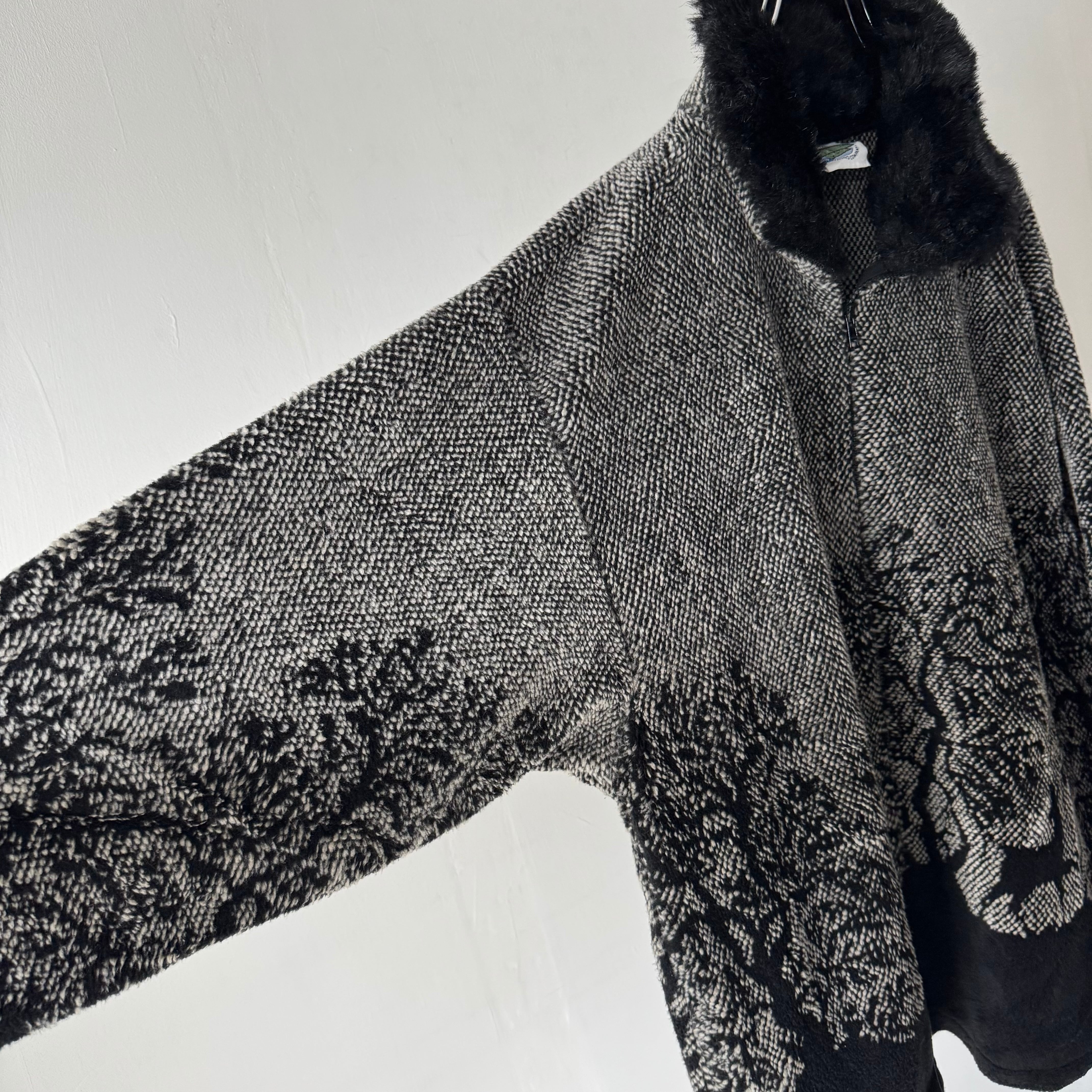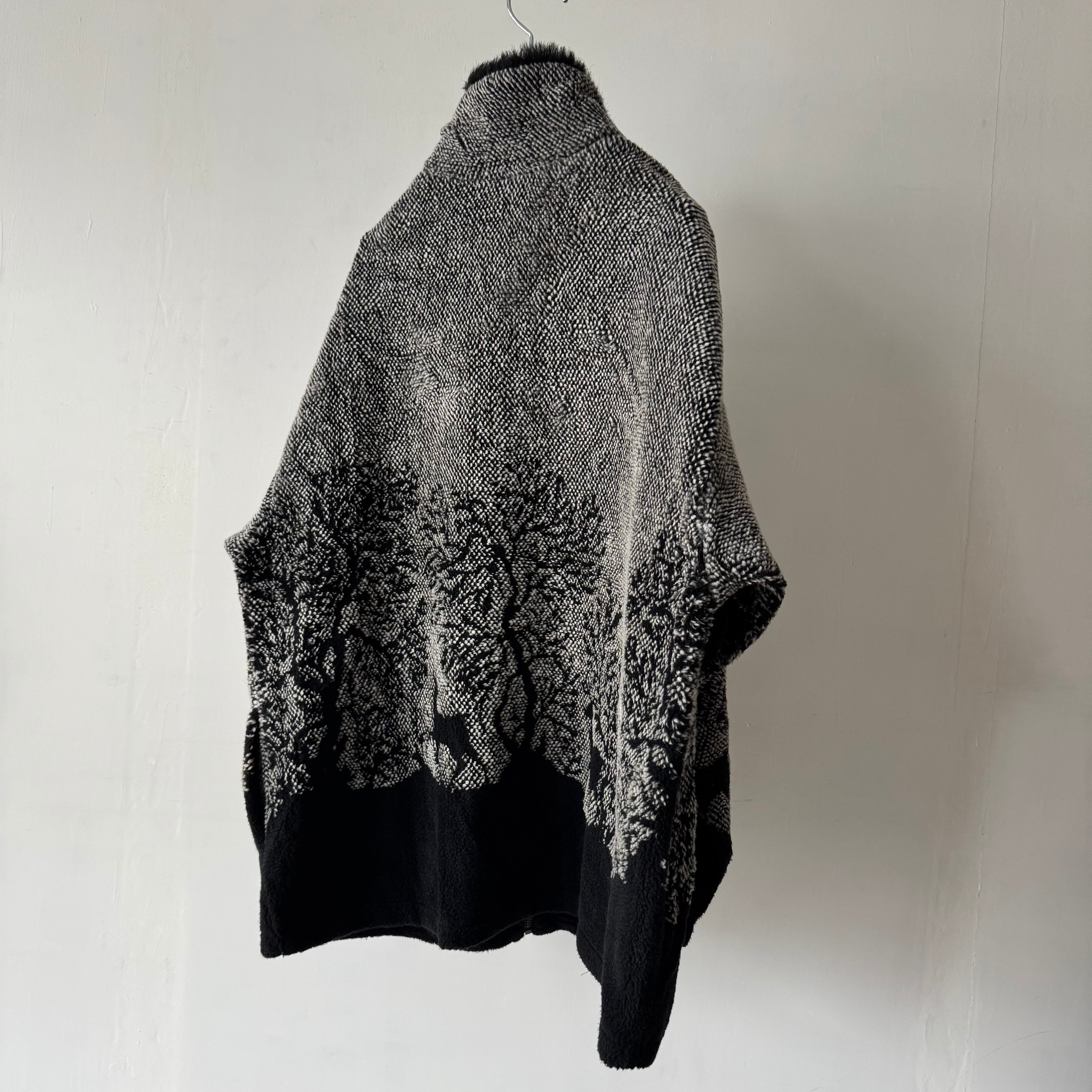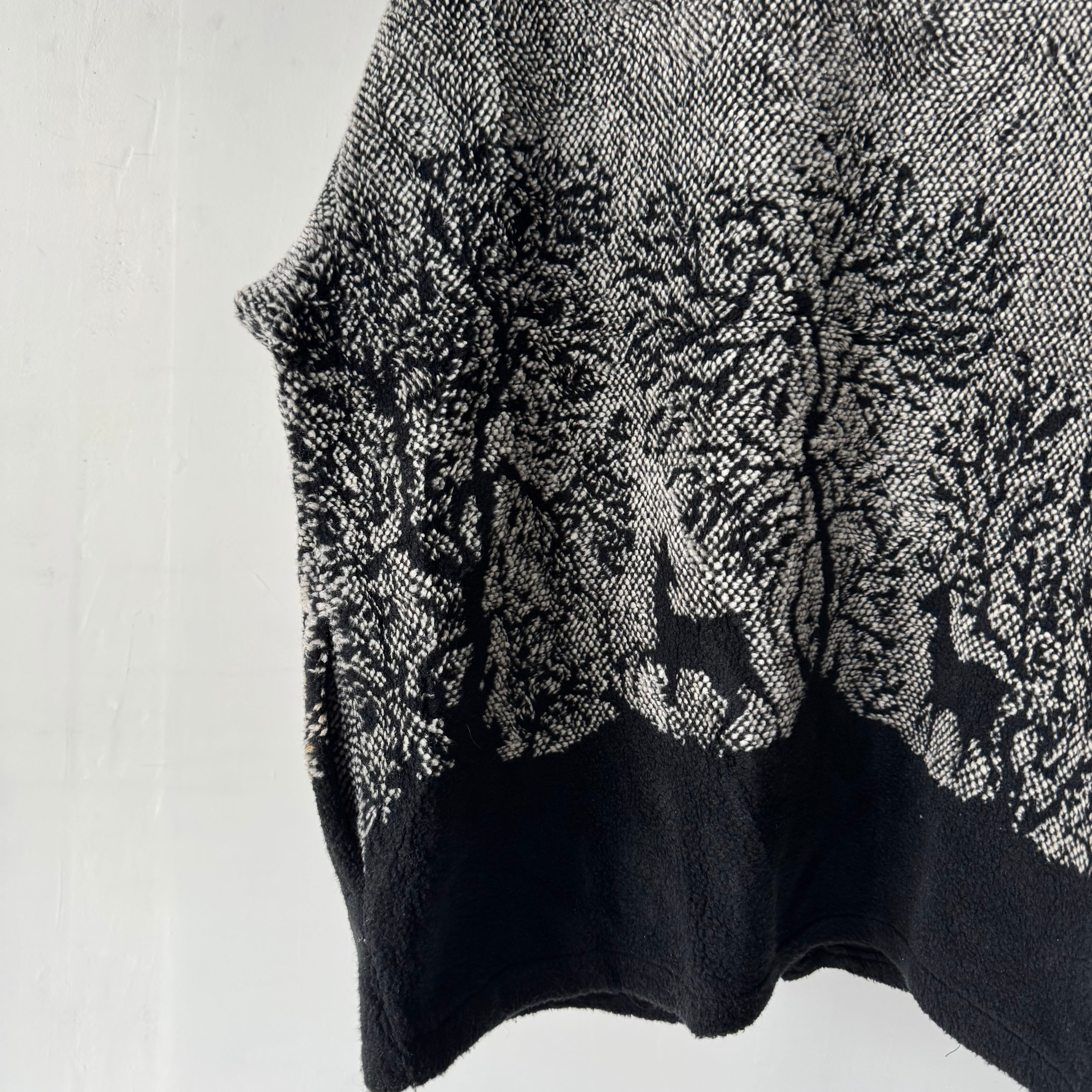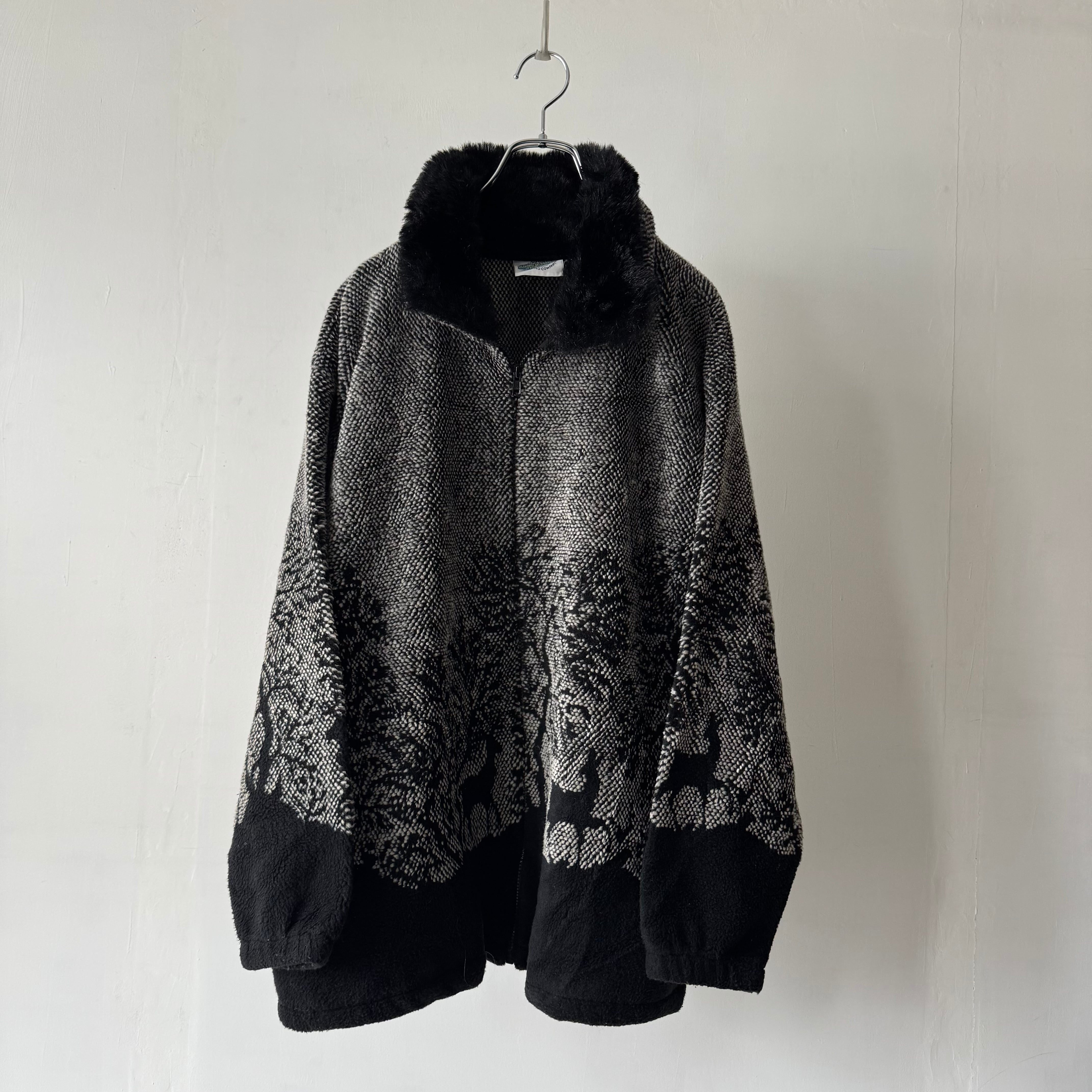 グレー系の地に、裾部分から立ち上がるように描かれた黒い樹木と鹿のグラフィックが特徴的なフリースジャケット