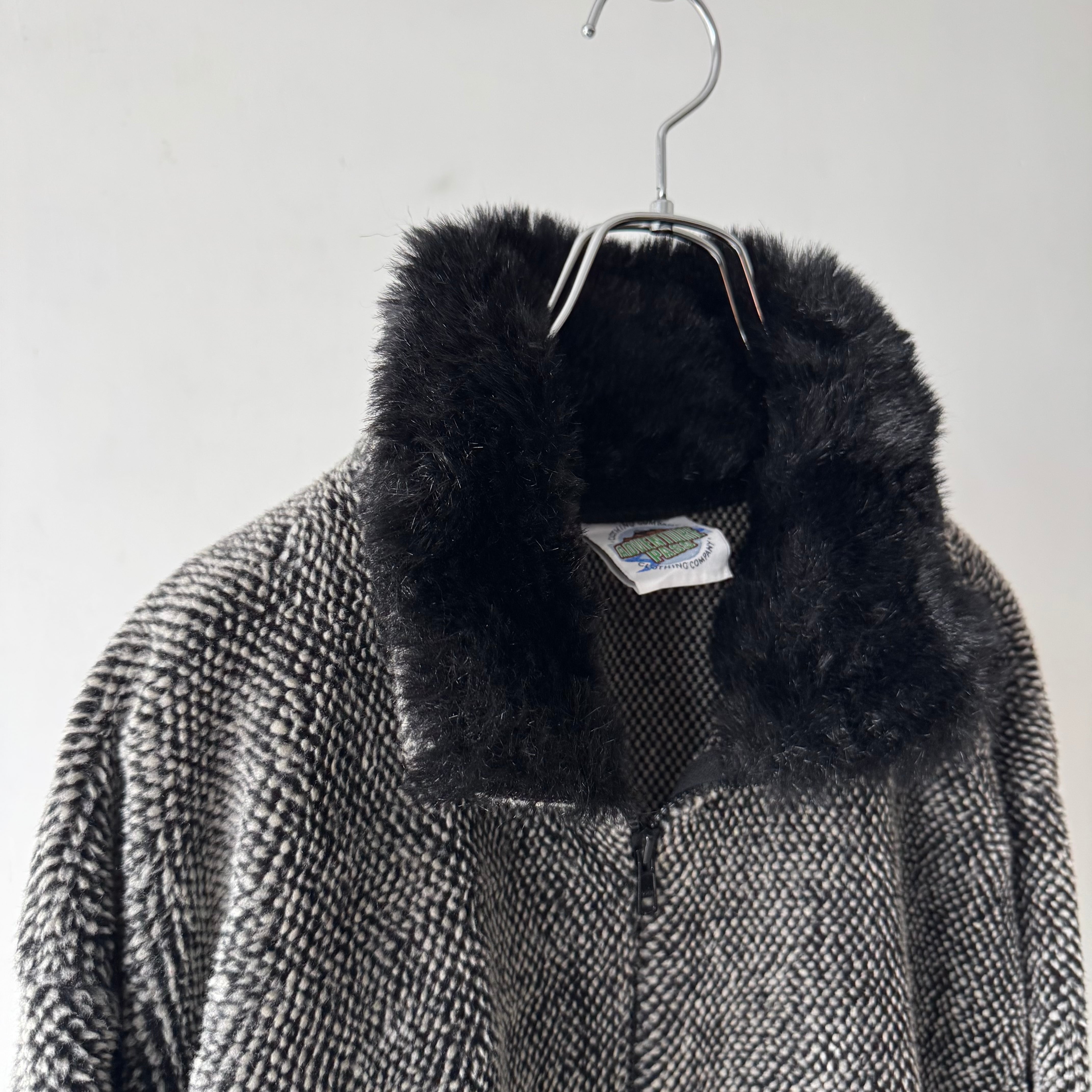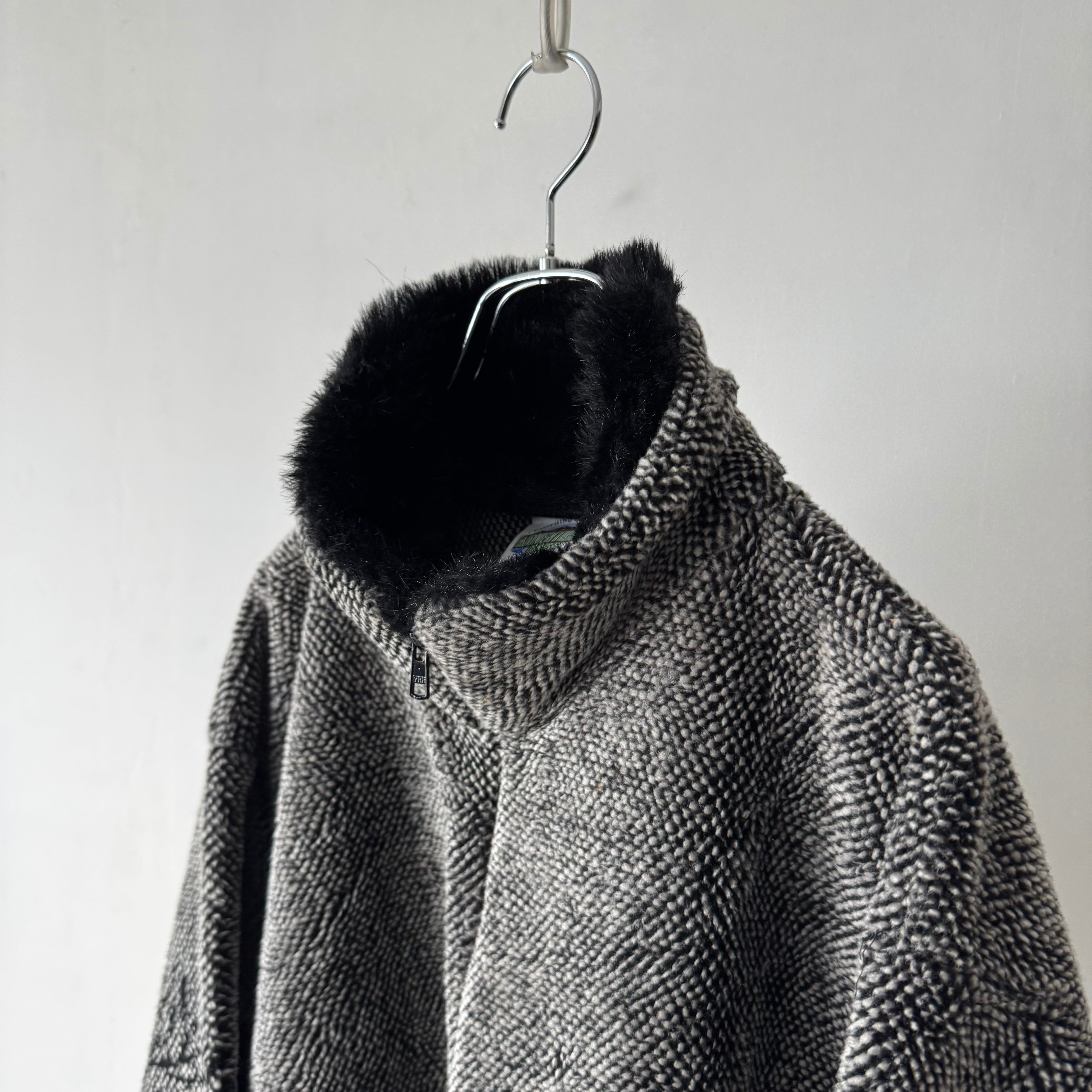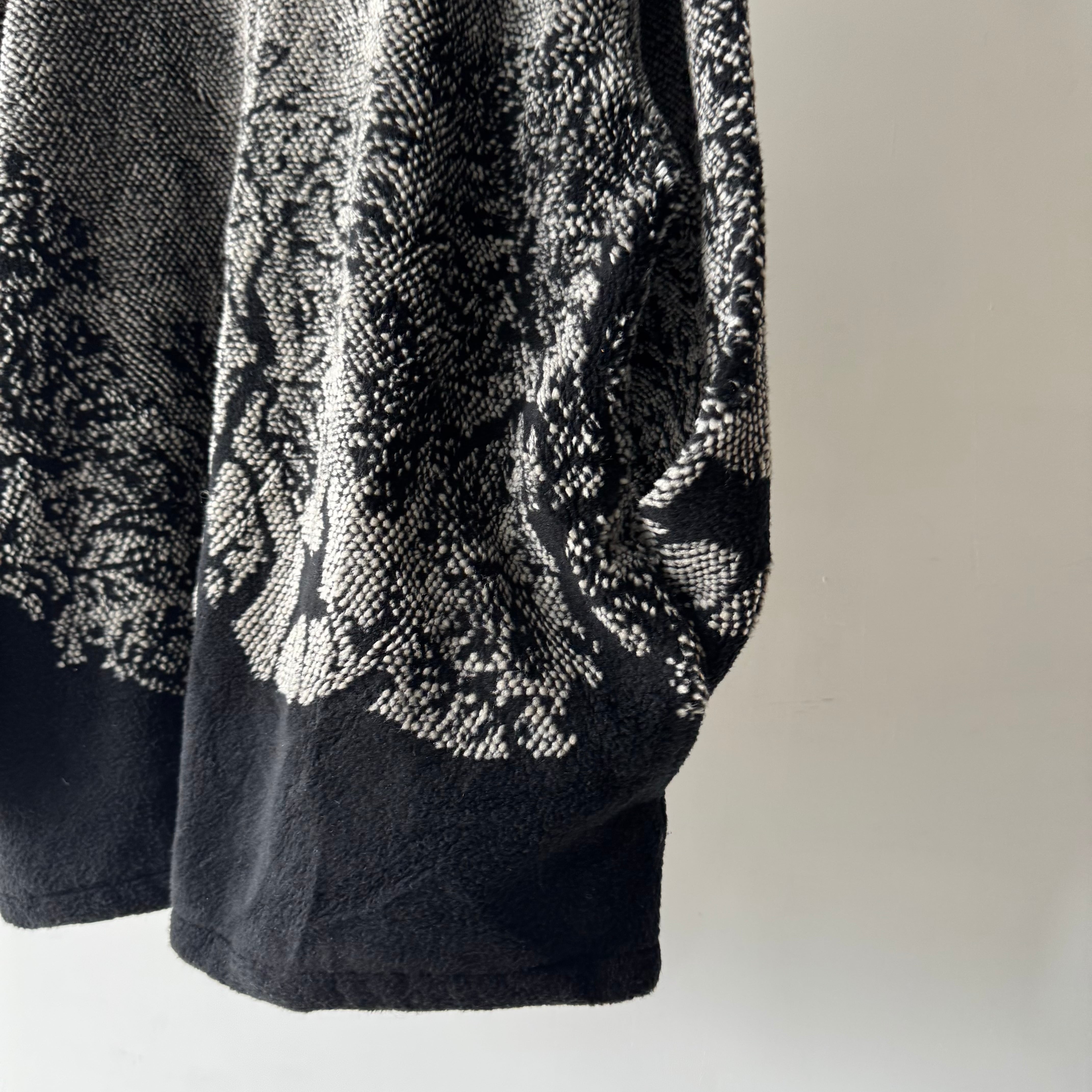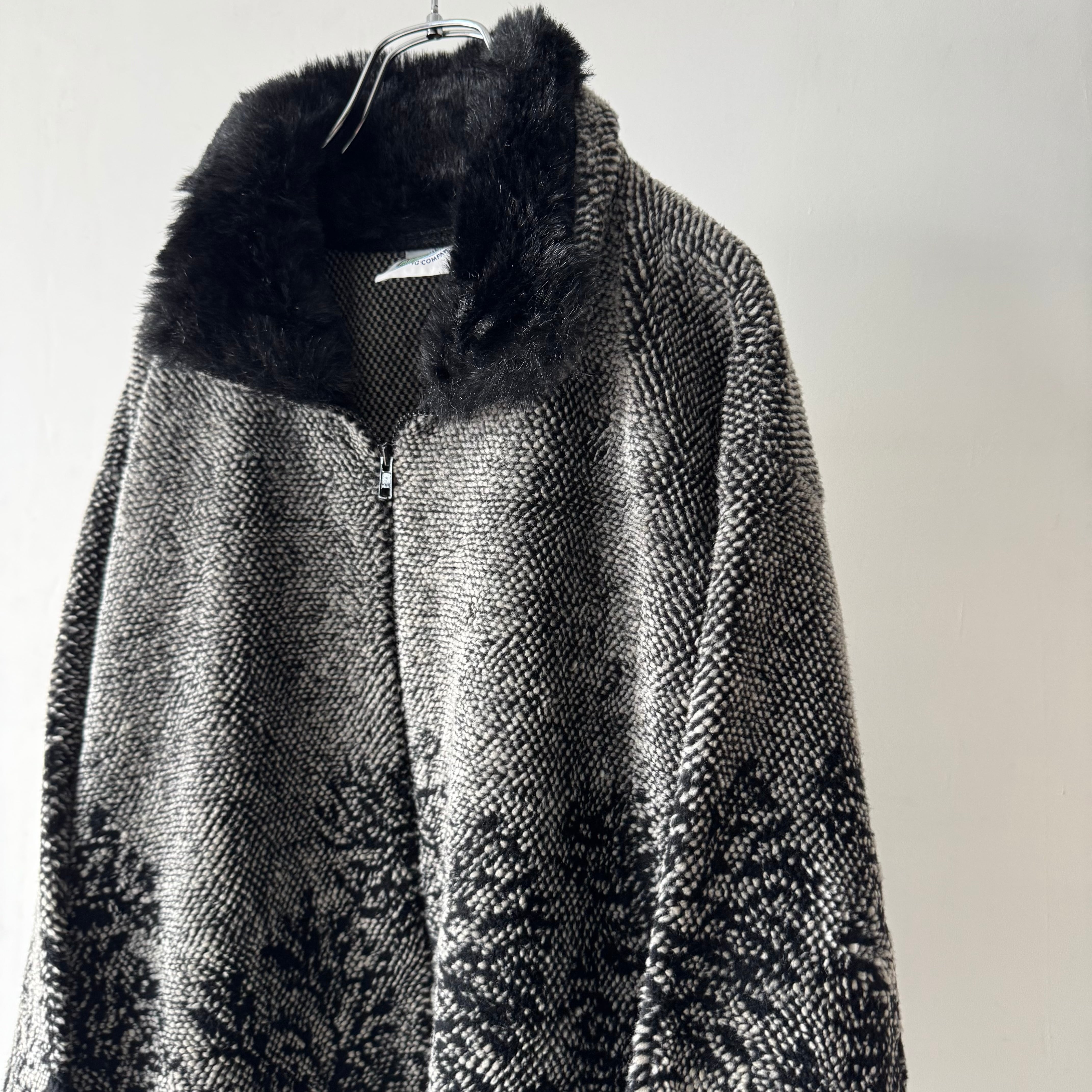 グレー系の地に、裾部分から立ち上がるように描かれた黒い樹木と鹿のグラフィックが特徴的なフリースジャケット