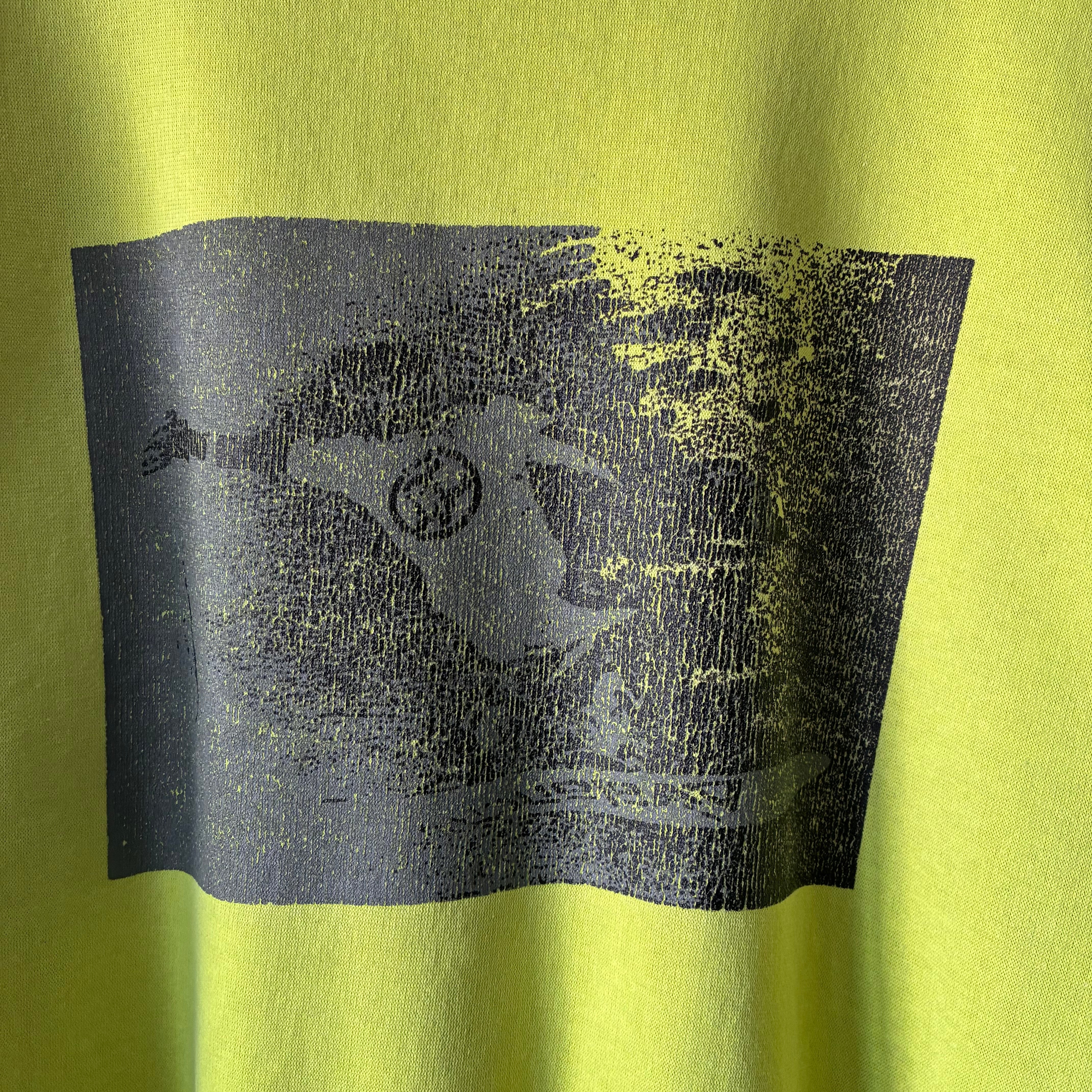 見映えの良いイエローカラーのボディにサーフモチーフの両面でのプリント