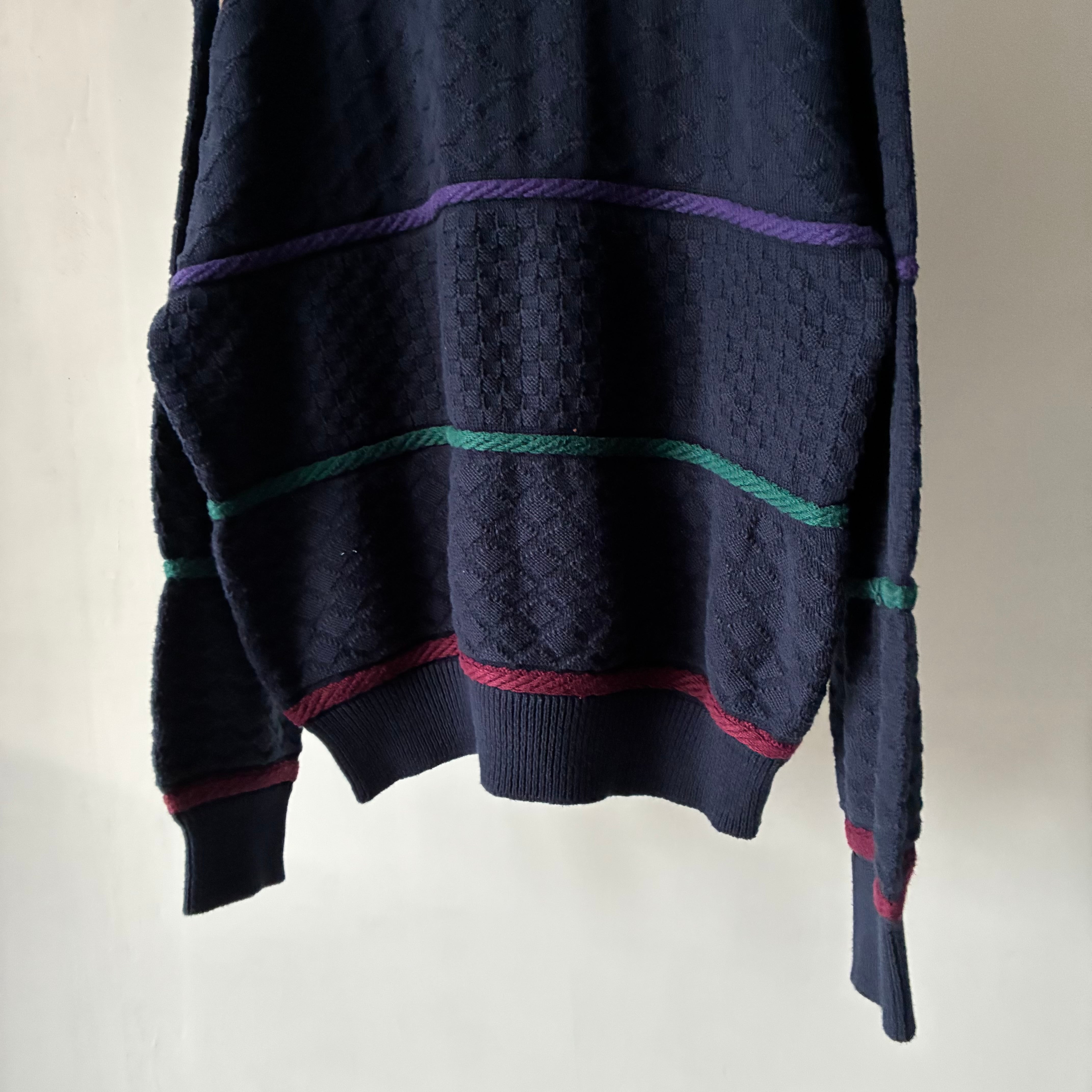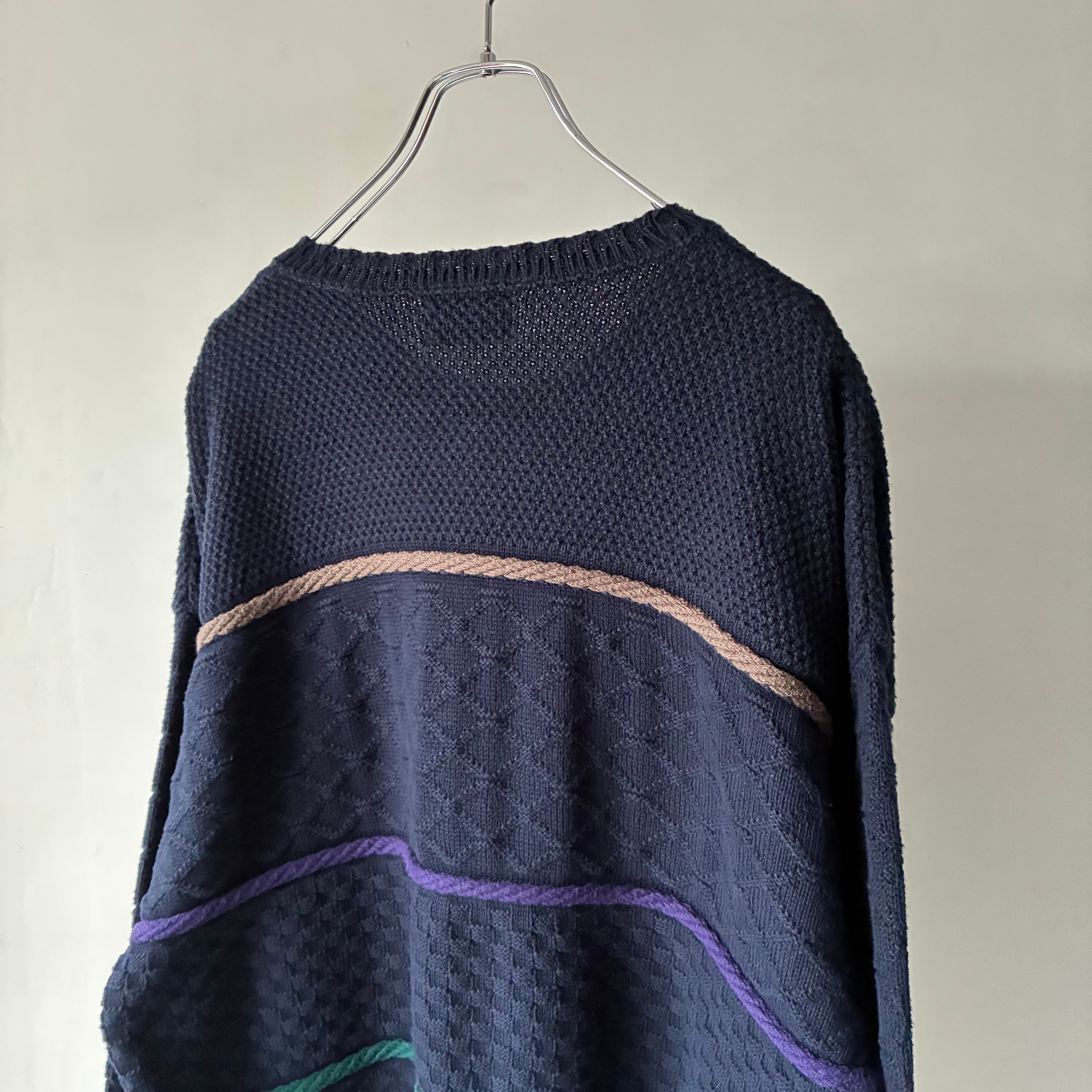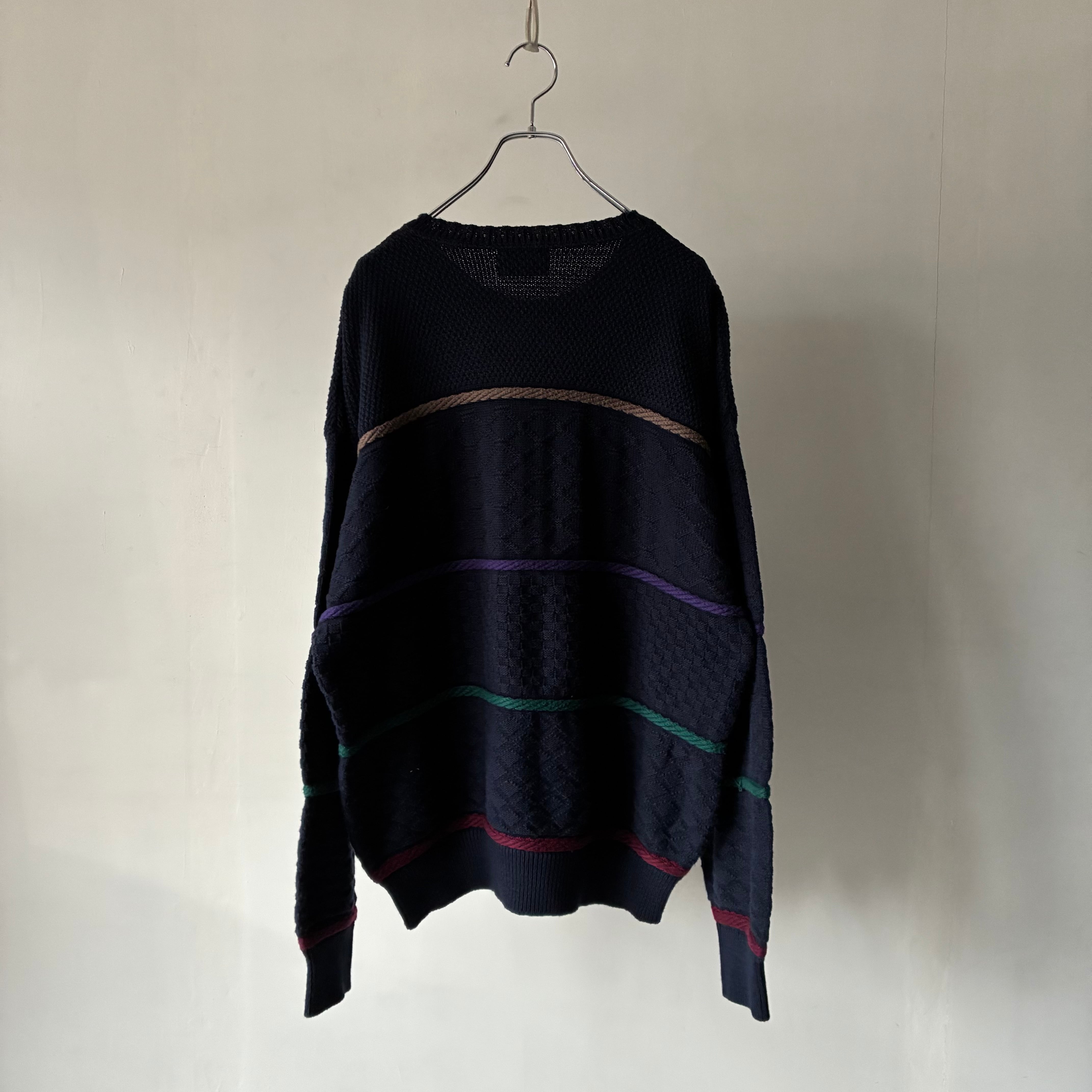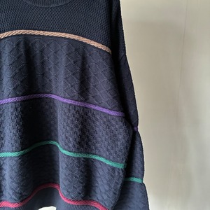 ネイビーボディにマルチカラーの立体的なラインが通るカジュアルなデザインのコットンニット