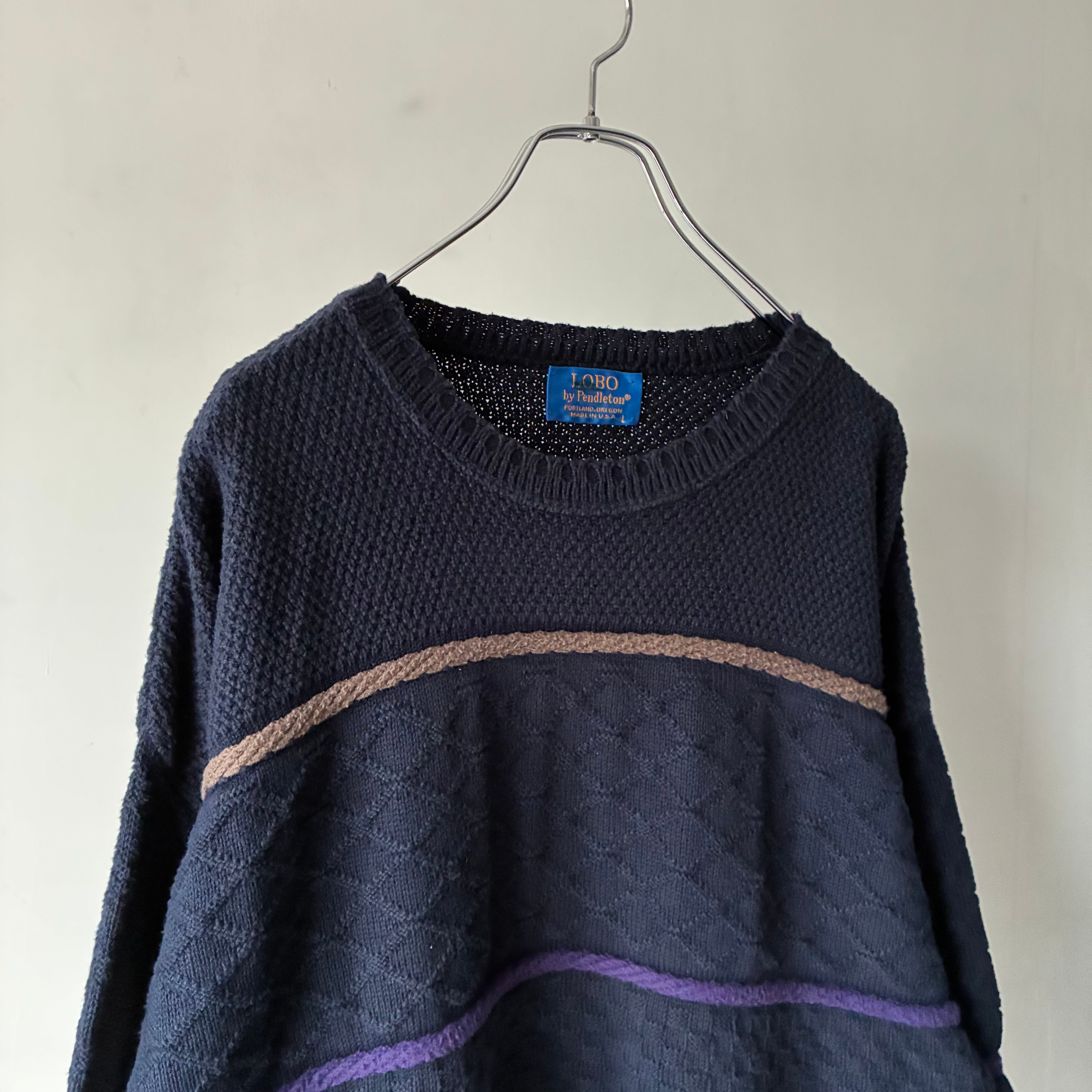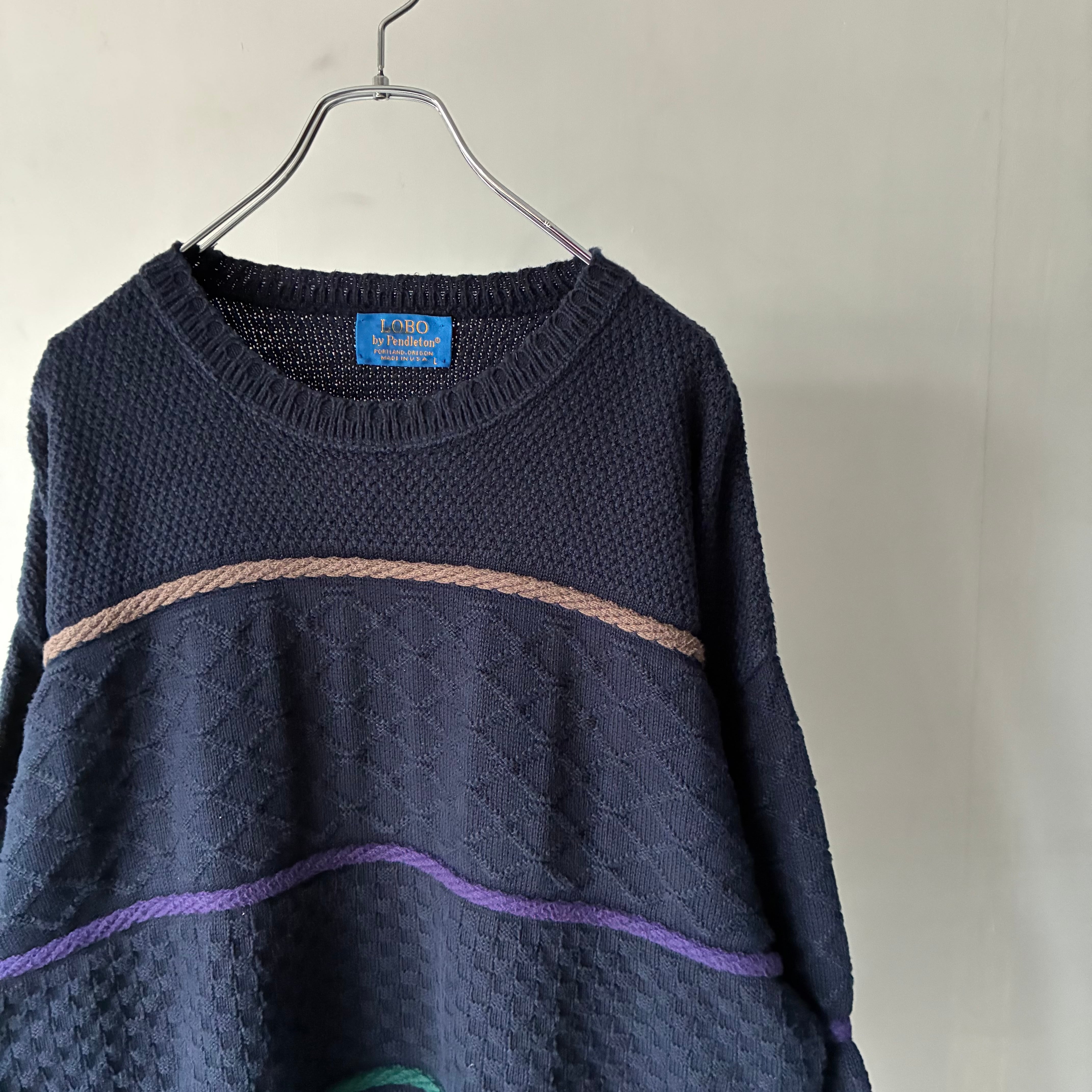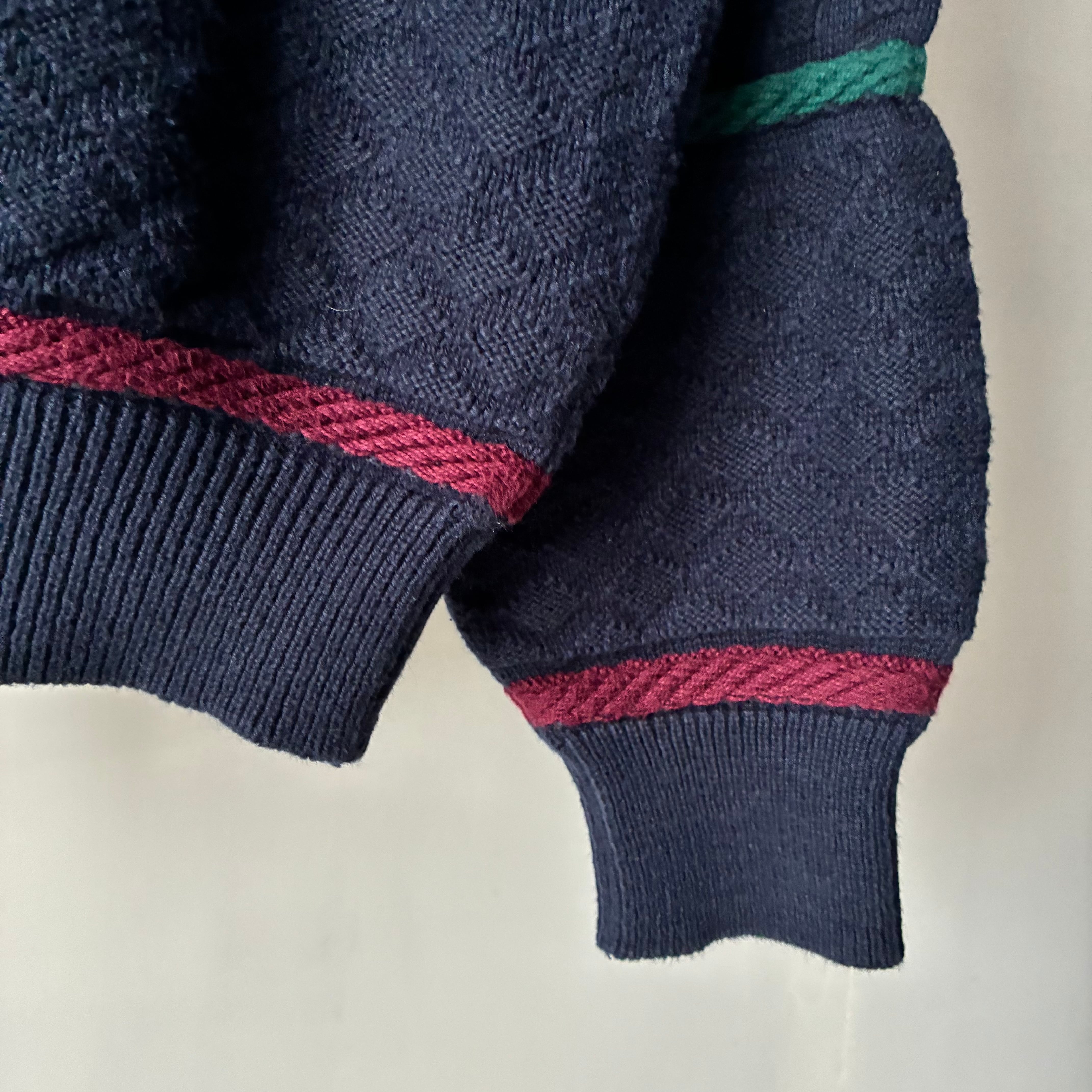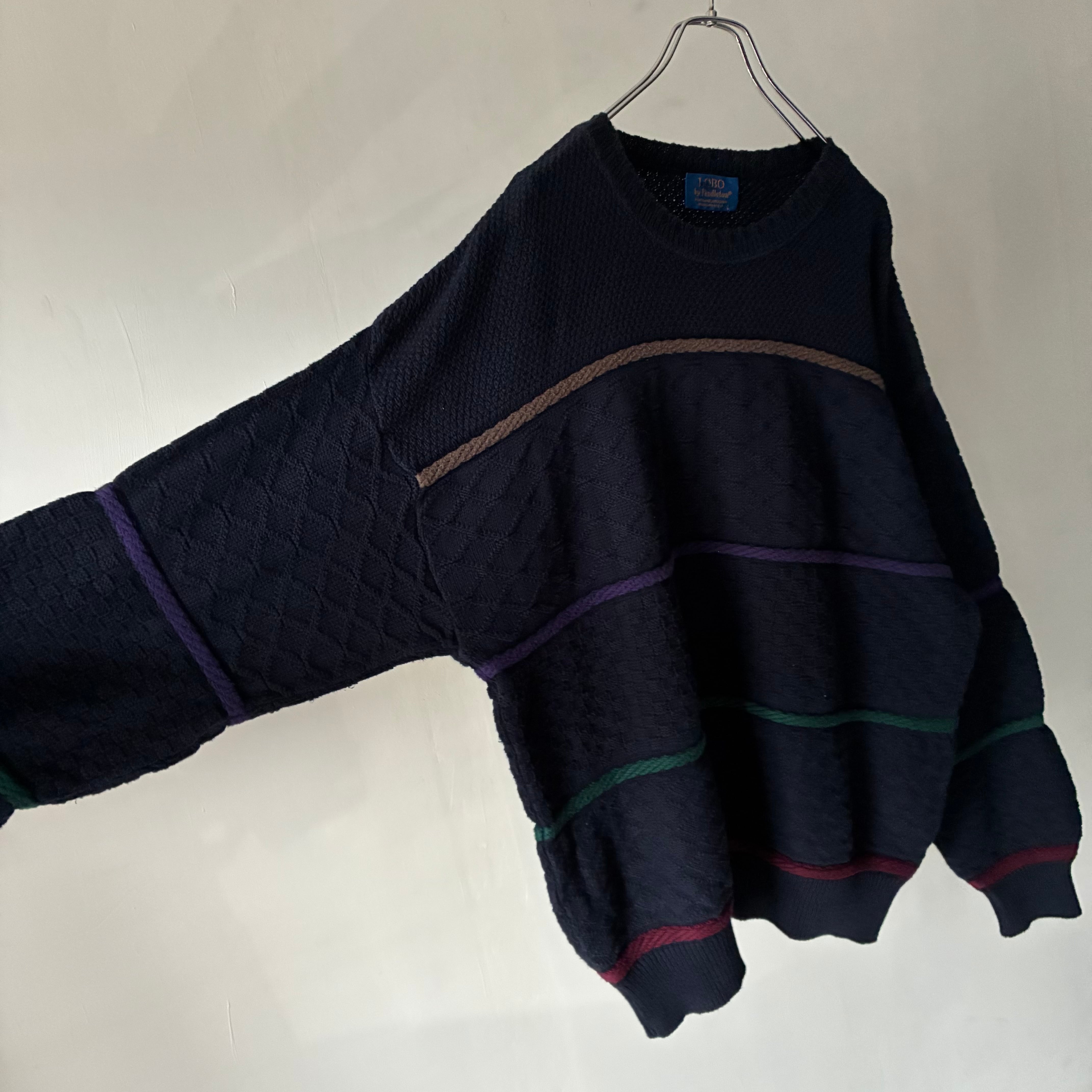 ネイビーボディにマルチカラーの立体的なラインが通るカジュアルなデザインのコットンニット