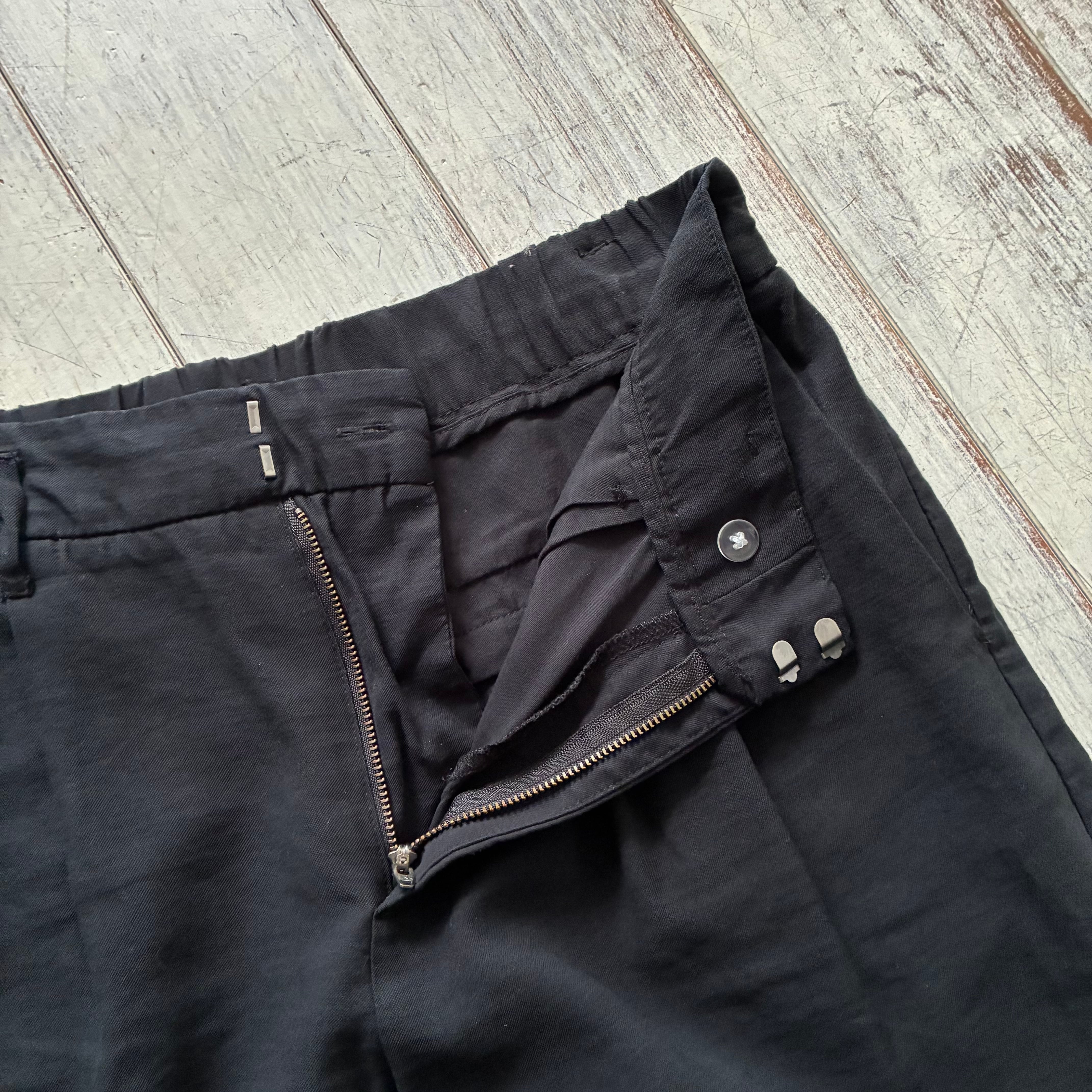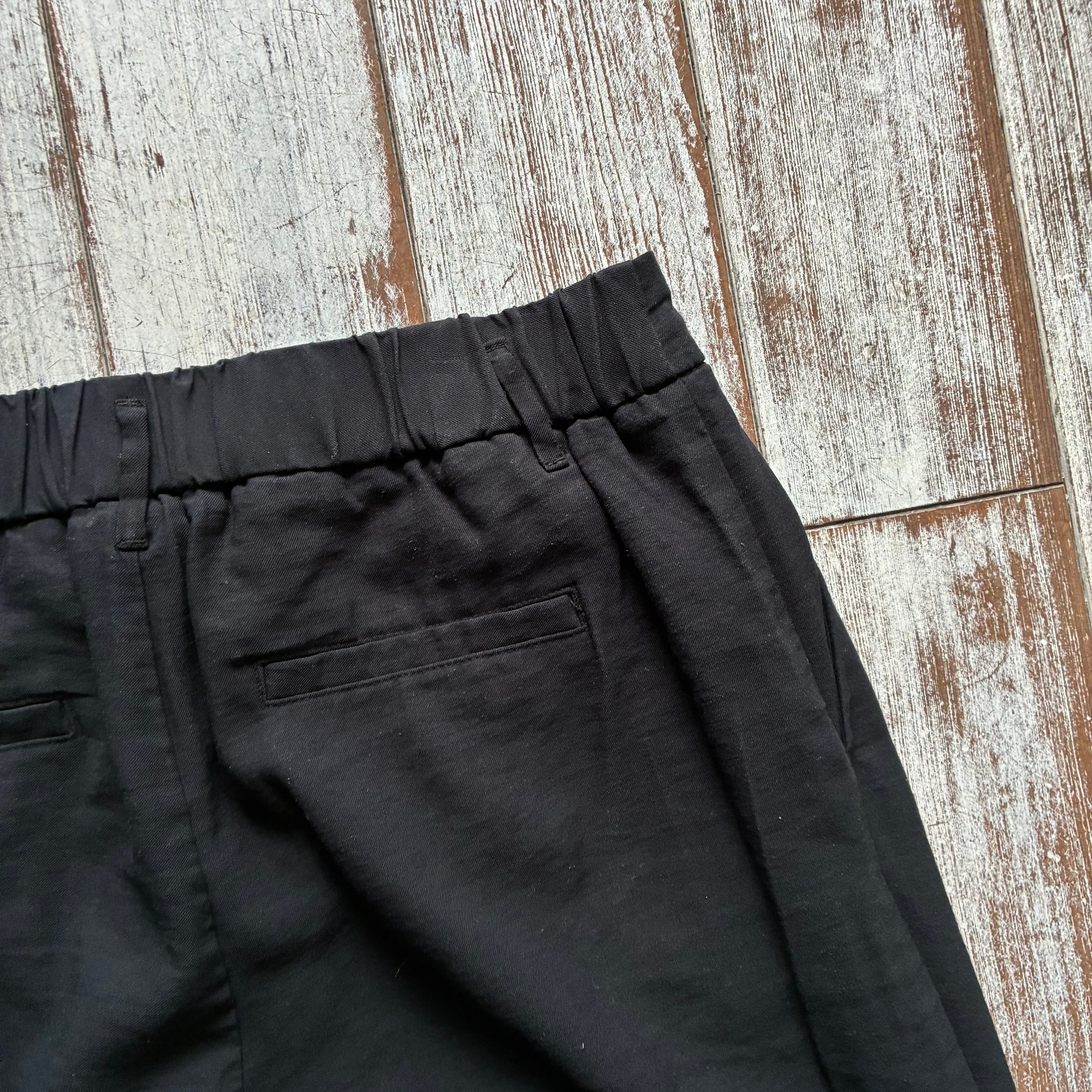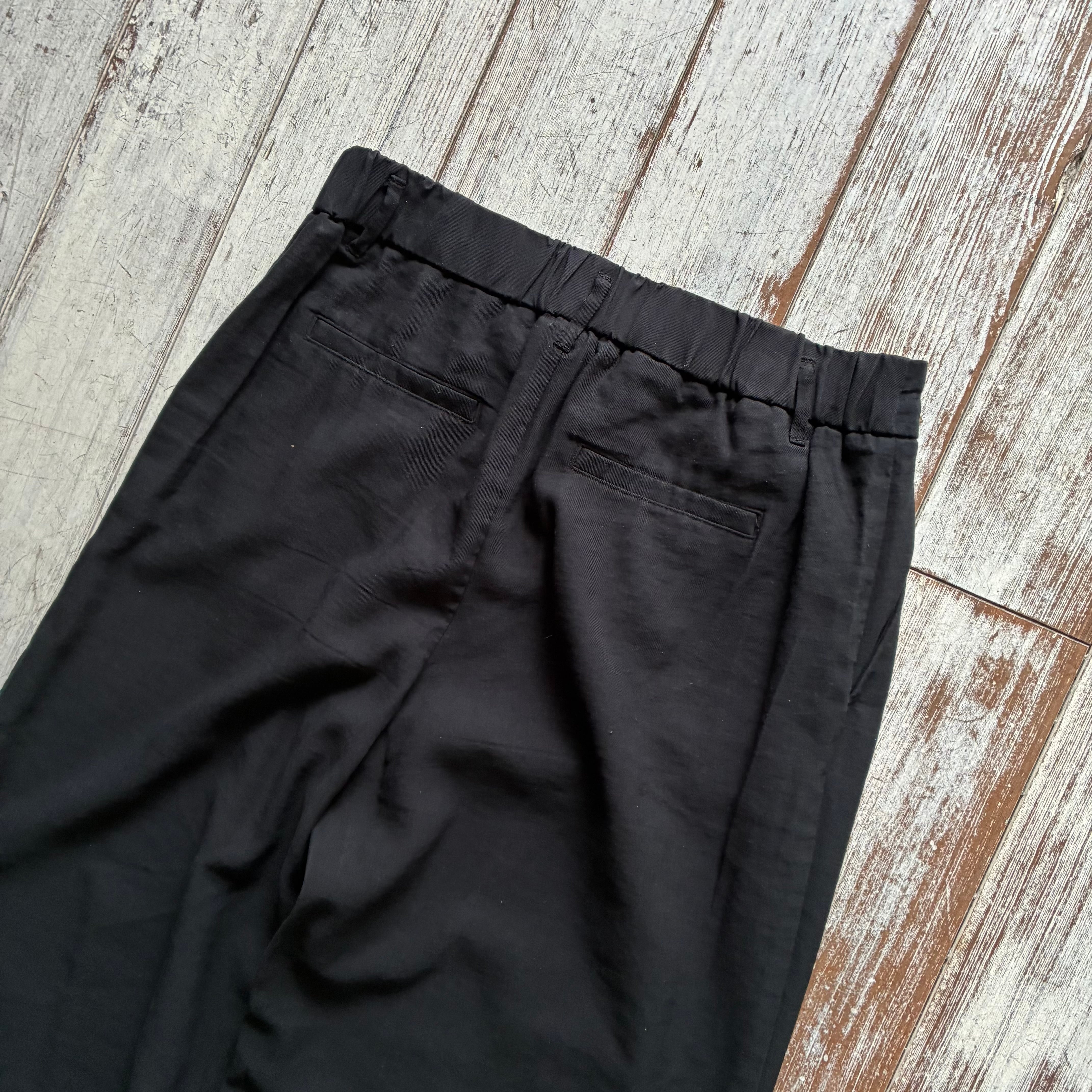 滑らかでドレープの効いた上品なレーヨン素材のスラックス デイリーユースな単色ブラックカラーで汎用性の高い1本 程よい太さで2タック入った落ち感のあるルーズめなシルエット 透け感もなく気軽に使えて履くものに困った際には非常に頼もしいところかと . ウエスト平置き 40.5 股上 38 股下 82 わたり 39 裾幅 26 . size 10 . rayon 92% polyester 8% . 状態 B