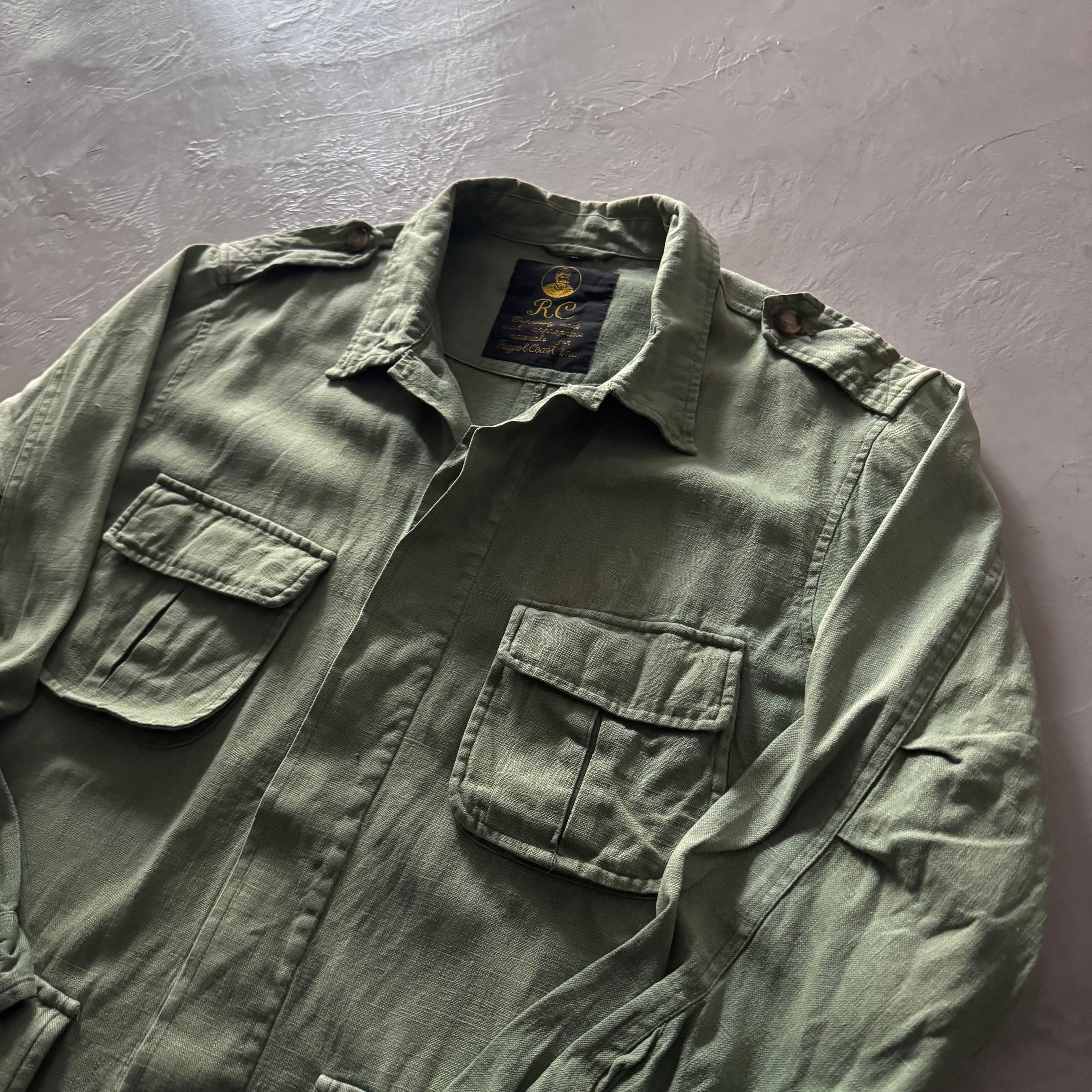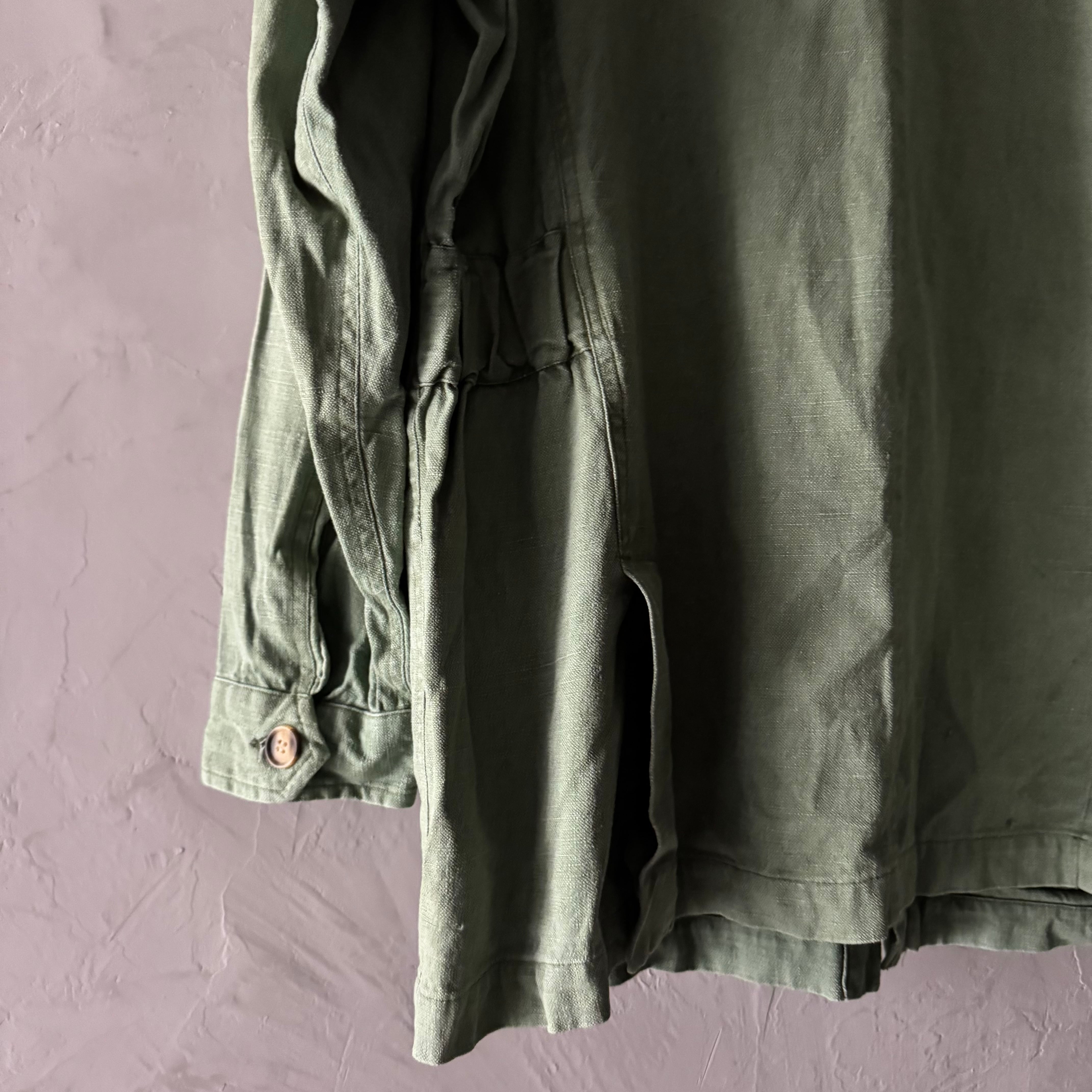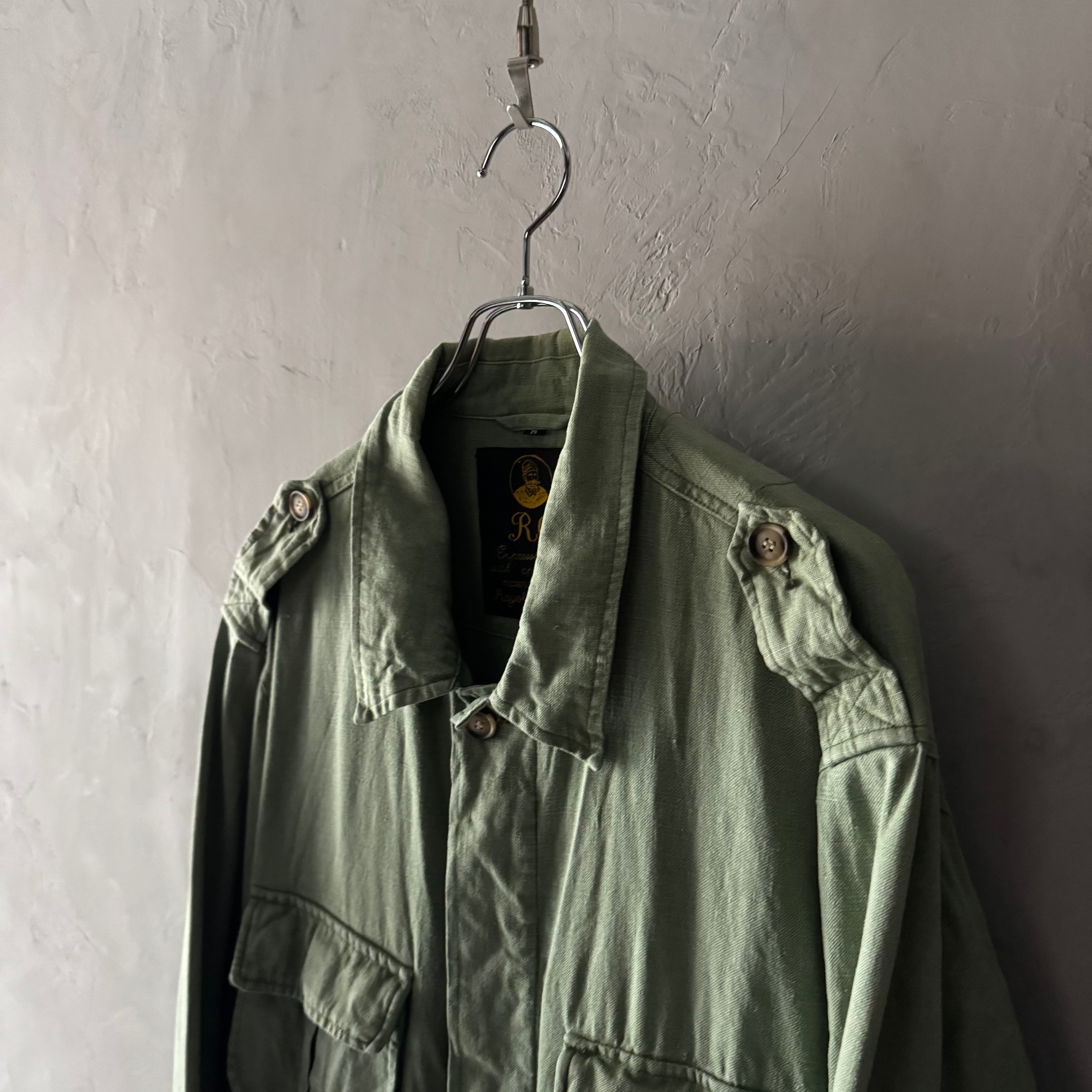 褪せたピスタチオのようなオリーブカラーが絶妙で、ジャングルファティーグやユーティリティシャツを彷彿とさせるミリタリーテイスト