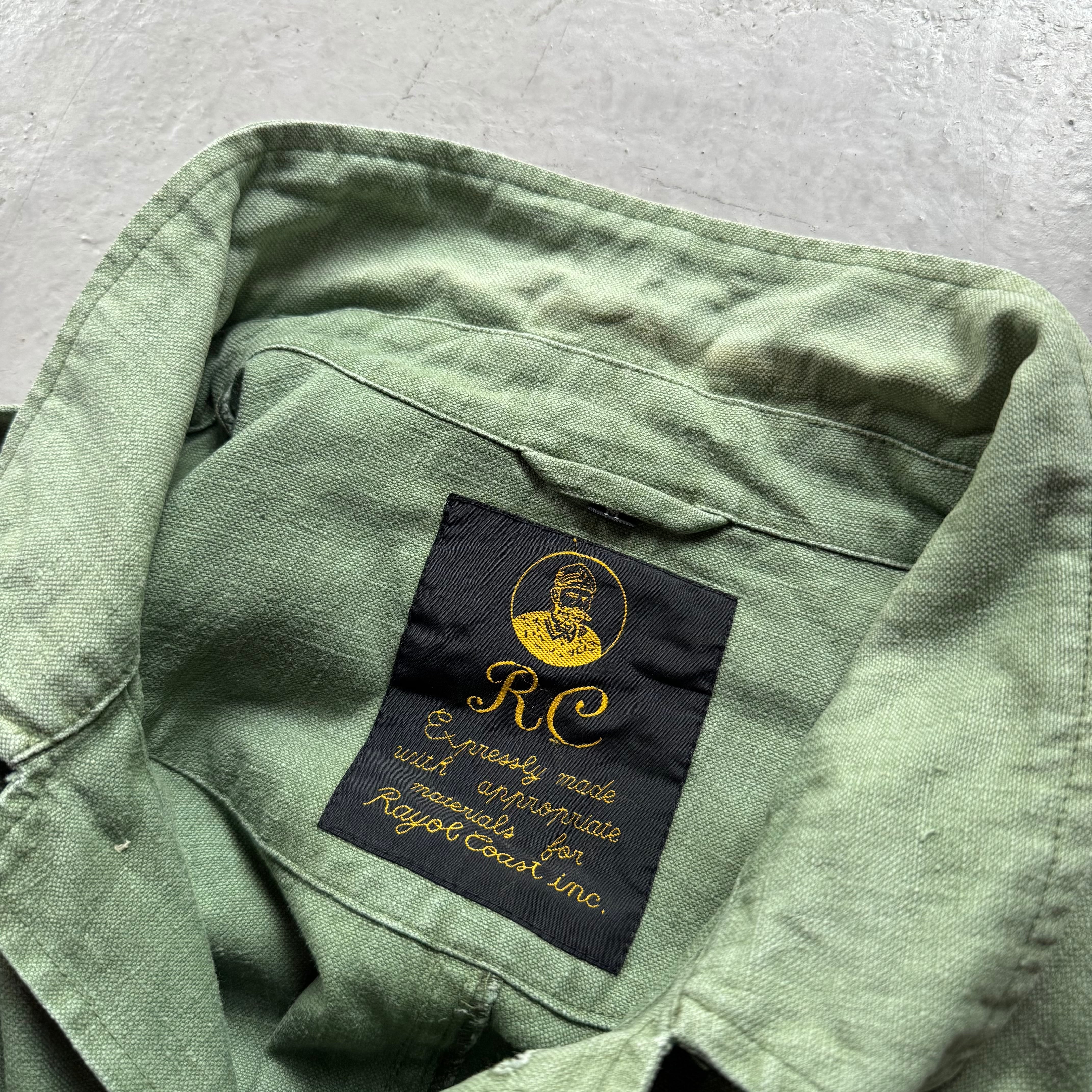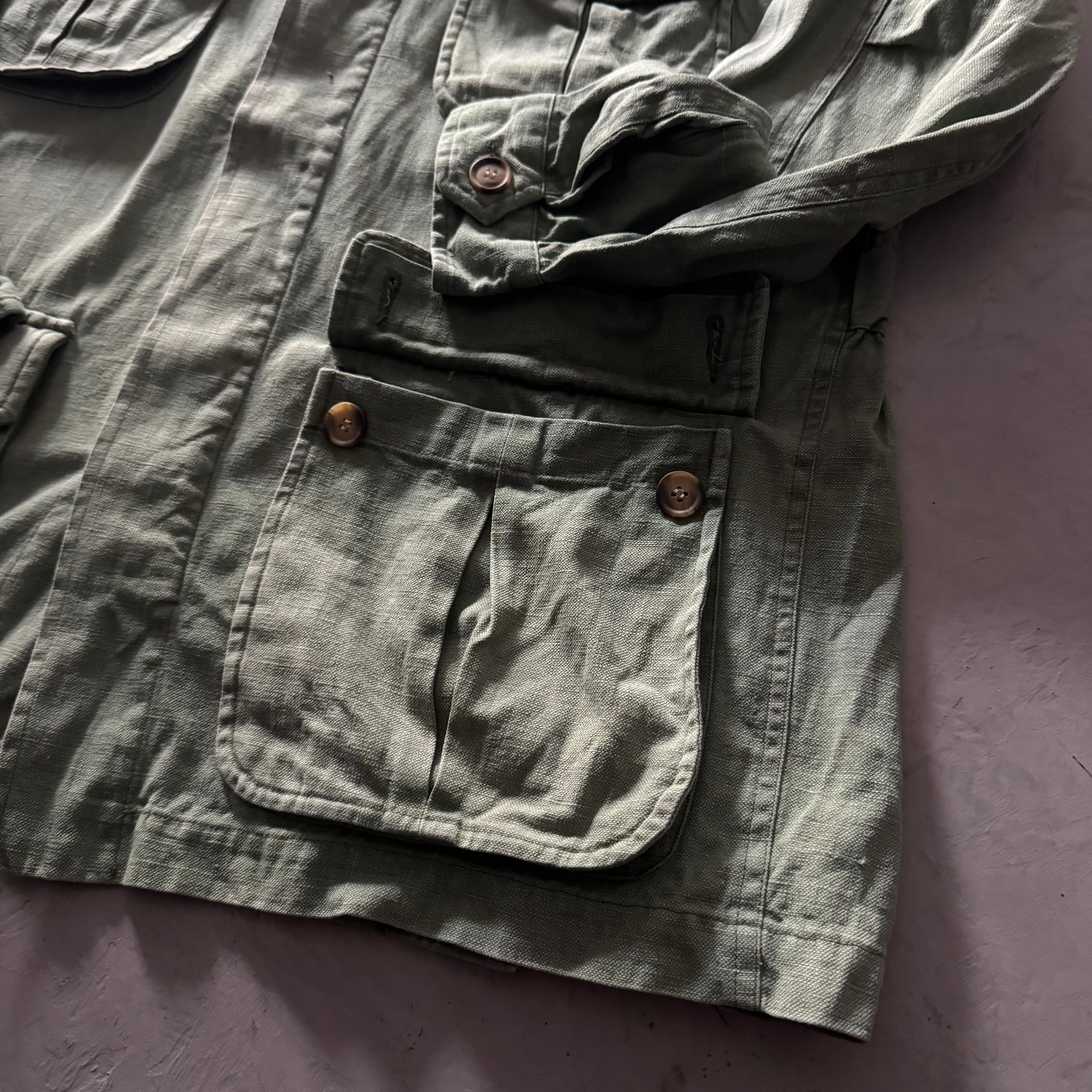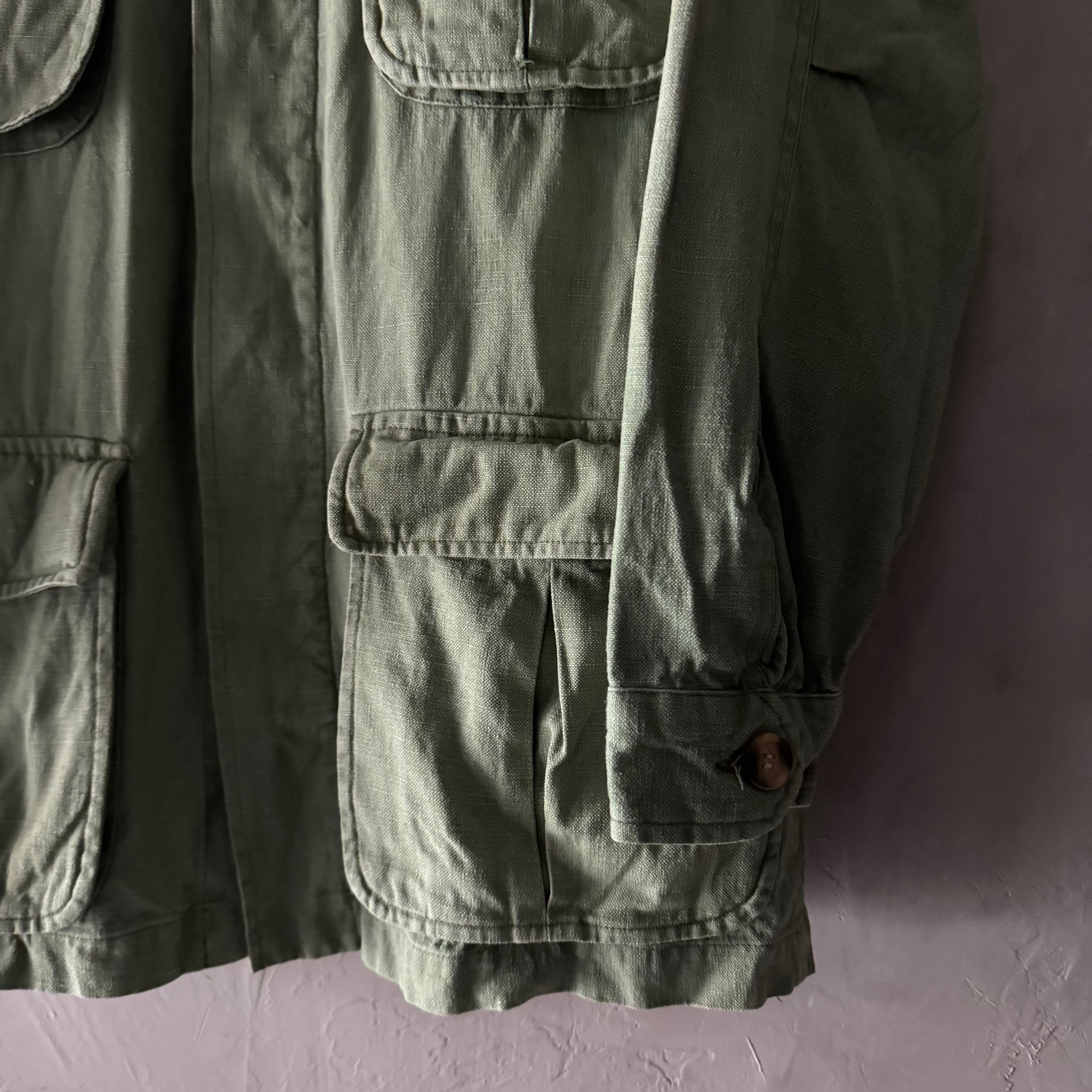 褪せたピスタチオのようなオリーブカラーが絶妙で、ジャングルファティーグやユーティリティシャツを彷彿とさせるミリタリーテイスト