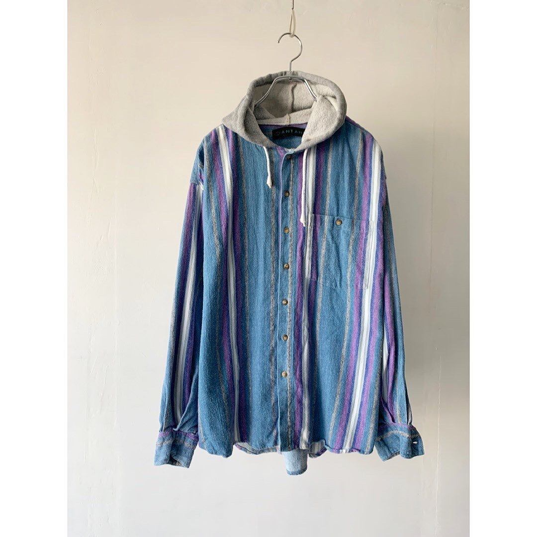 マルチストライプのネルシャツにフーディー