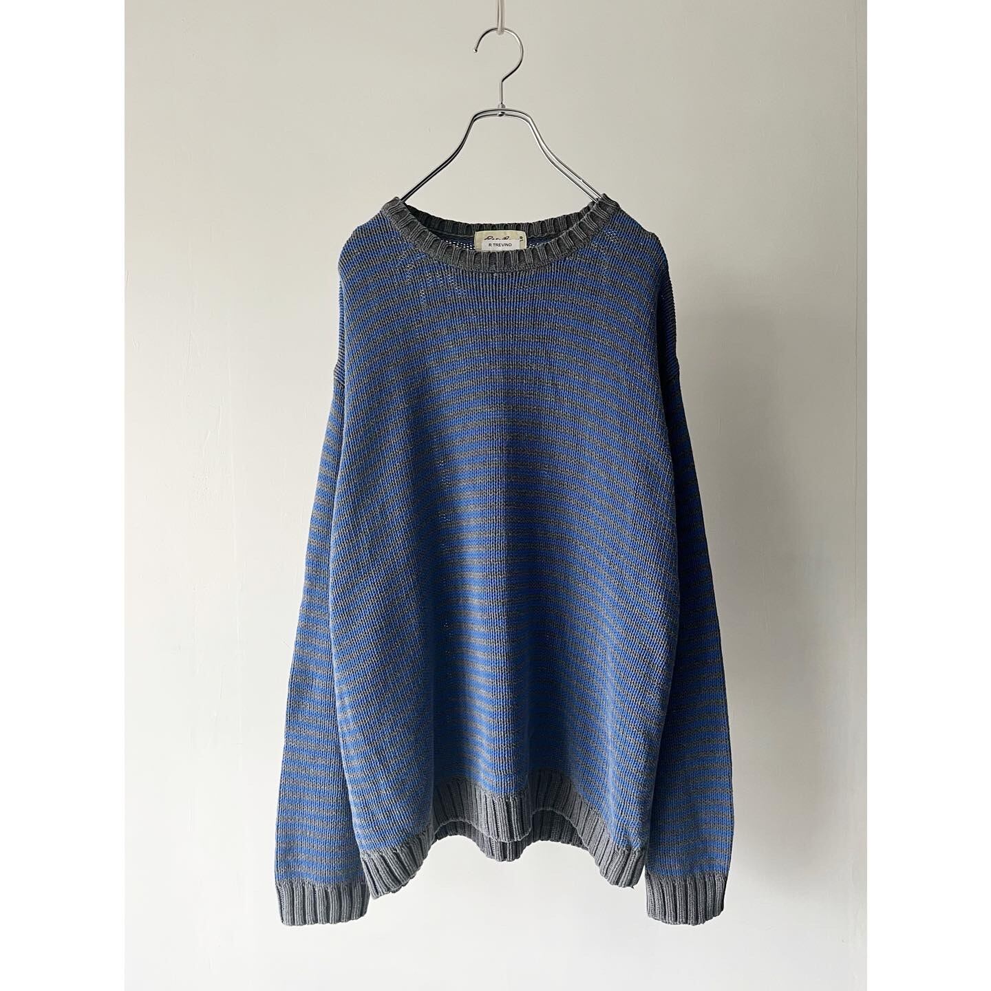 グレー×ブルーのいなたい配色ボーダーニット