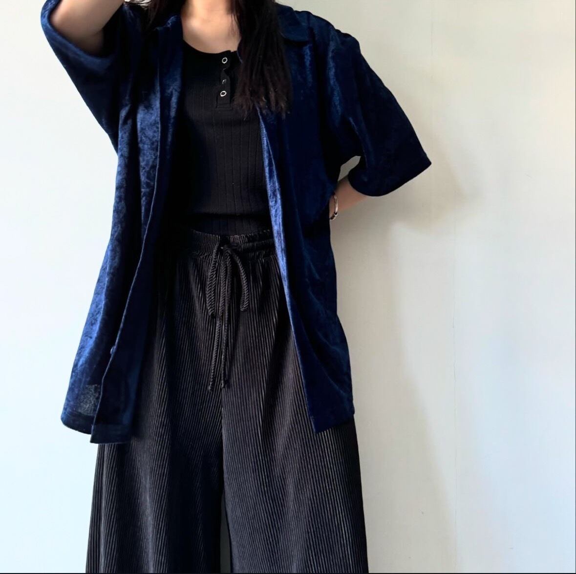 細かいプリーツの入ったシルエットの美しいイージーパンツ
