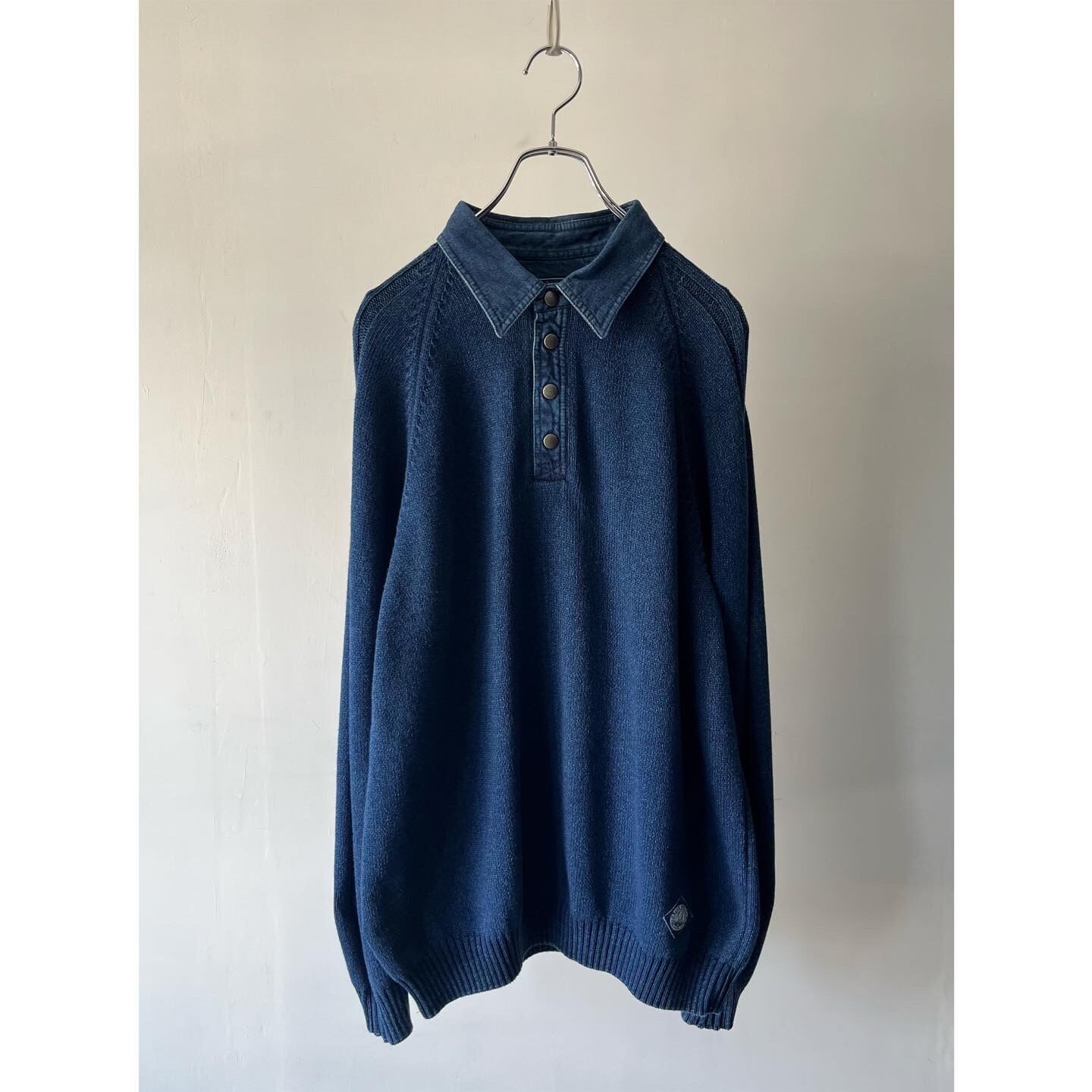 スナップボタンで襟が付くポロシャツのようなディテールのインディゴ染めニット