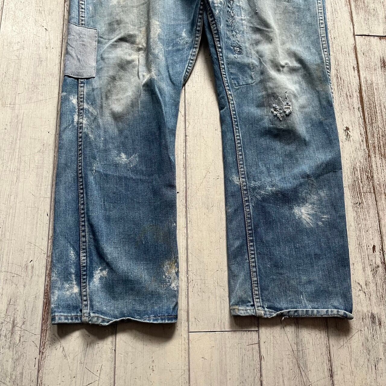 全体的なフェードに加え局所的に褪色したデニム生地や雑なリペアが映えるビンテージならではの1本