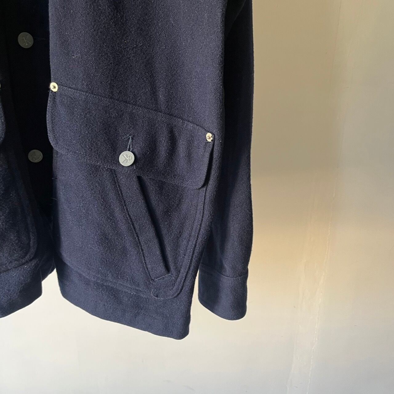 深いネイビーのボディに大判なポケットや刻印入りのボタンが映えるハイセンスなデザイン